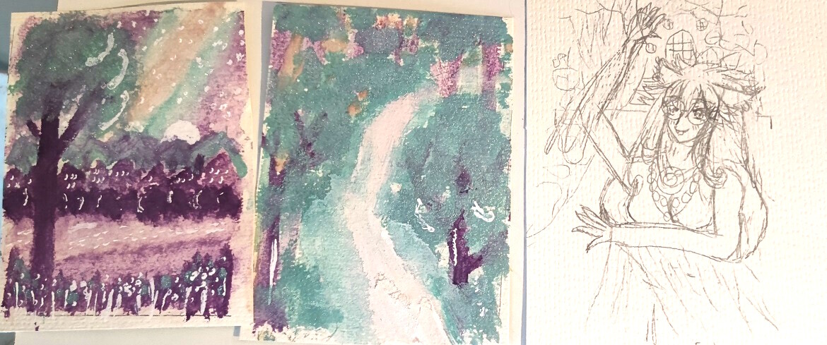 Mitte: muss noch geoutlined werden, ein Zauberwald mit rosa Fluss - unfertig