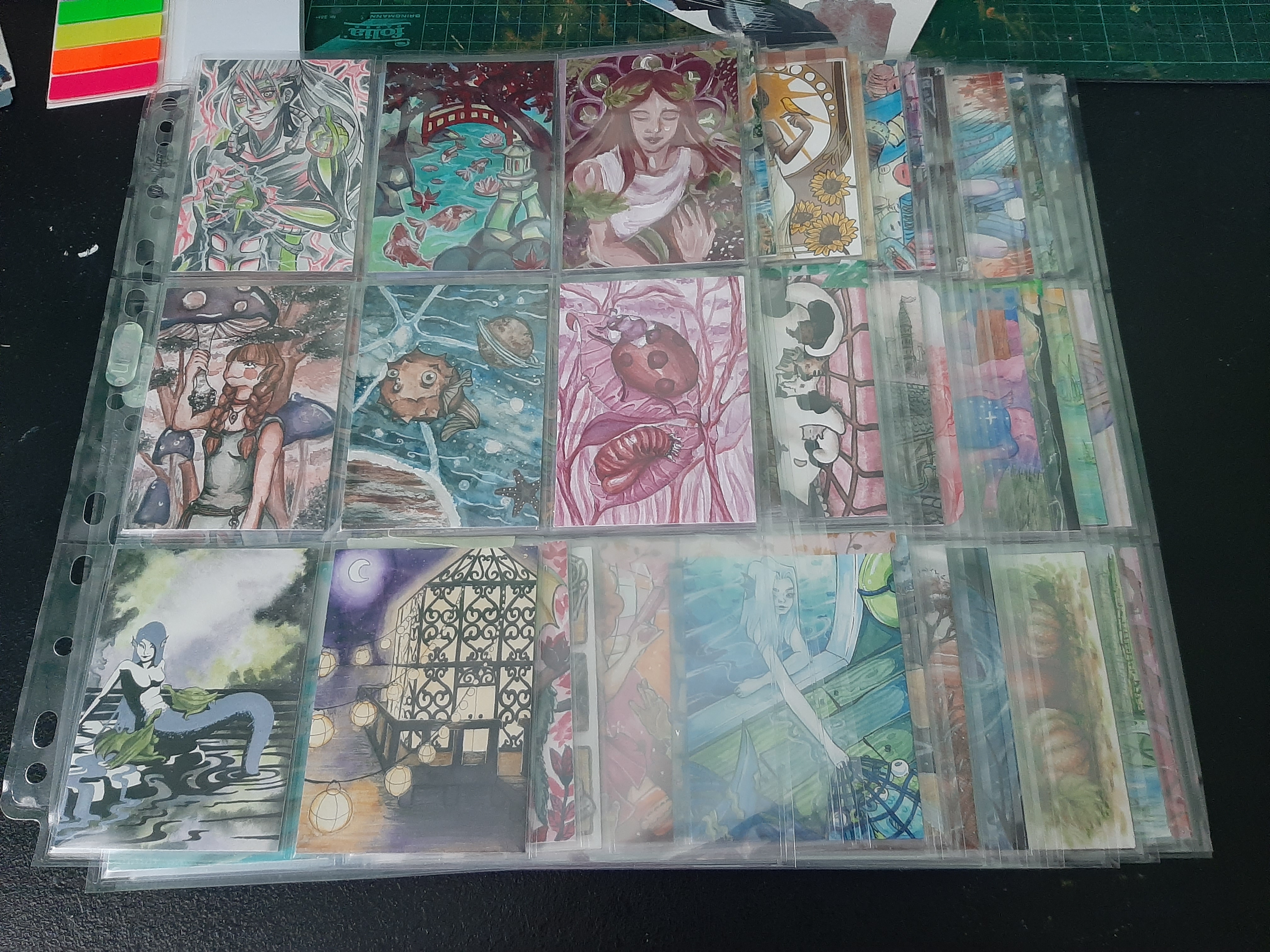 Dann wurden sie zum Verteilen schön sortiert in 9er-Hüllen gepackt und ich kann euch sagen, die Versuchung, die einfach so in den Ordner zu stecken war schon groß… es ist echt ein Privileg als Aktionsleiter, die ganzen Karten schön in Ruhe im Original bewundern zu können. Es ist zwar die Klischee- Aussage schlechthin, aber die meisten Karten sehen im Original wirklich noch so viel besser aus als auf Scan/Foto! Die Farben, die Textur auf dem Papier, Schimmer-Effekte… so viel, das man digital einfach nicht so gut einfangen kann wie “in echt”