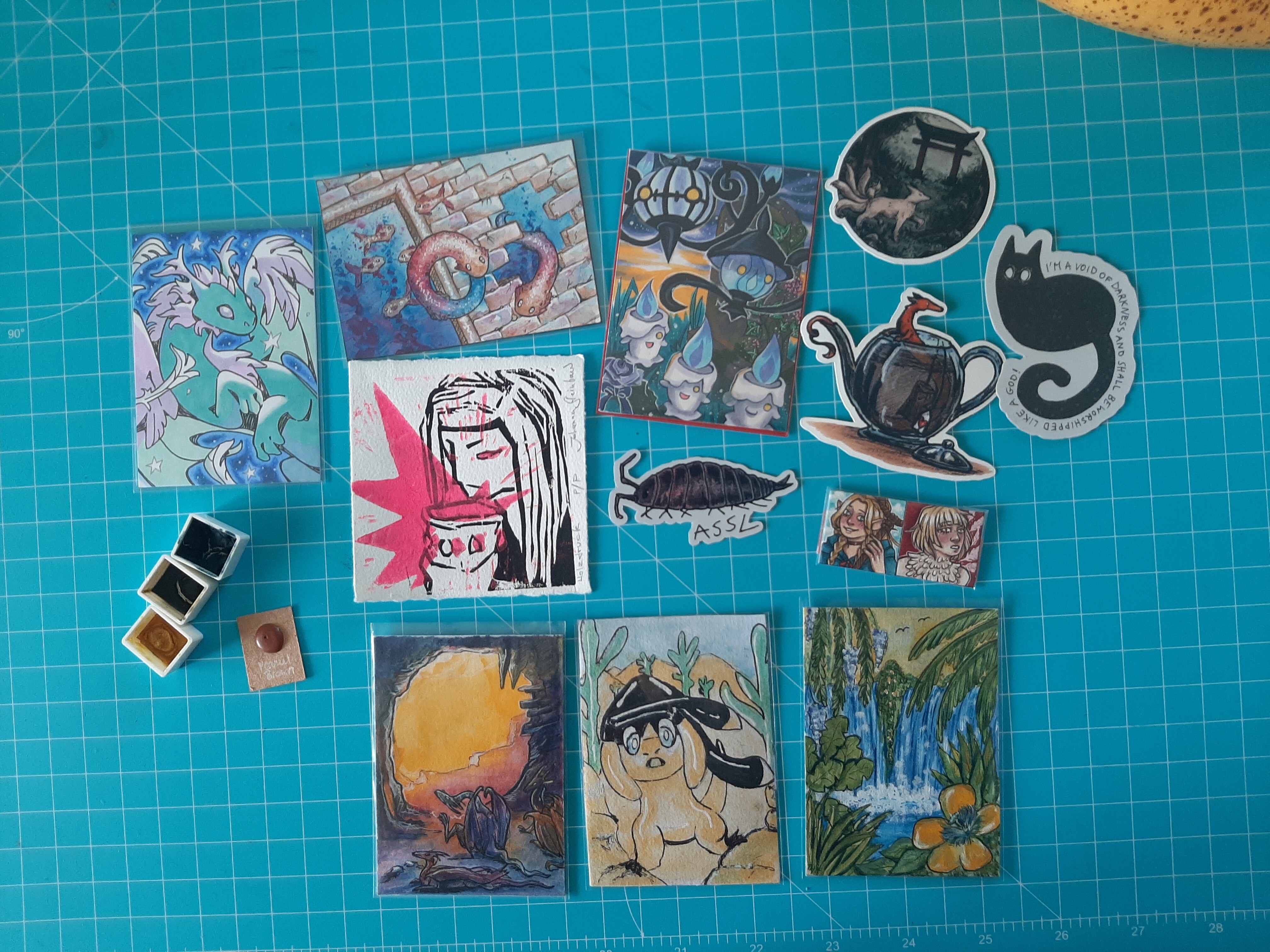 Auf dem Boden ausgebreitet sieht das dann so aus! (Banane ist natürlich wieder dabei) Es sind so tolle Karten wieder rausgekommen und ich finde es immer toll, sie dann zusammen auf einem Gruppenfoto zu sehen <3