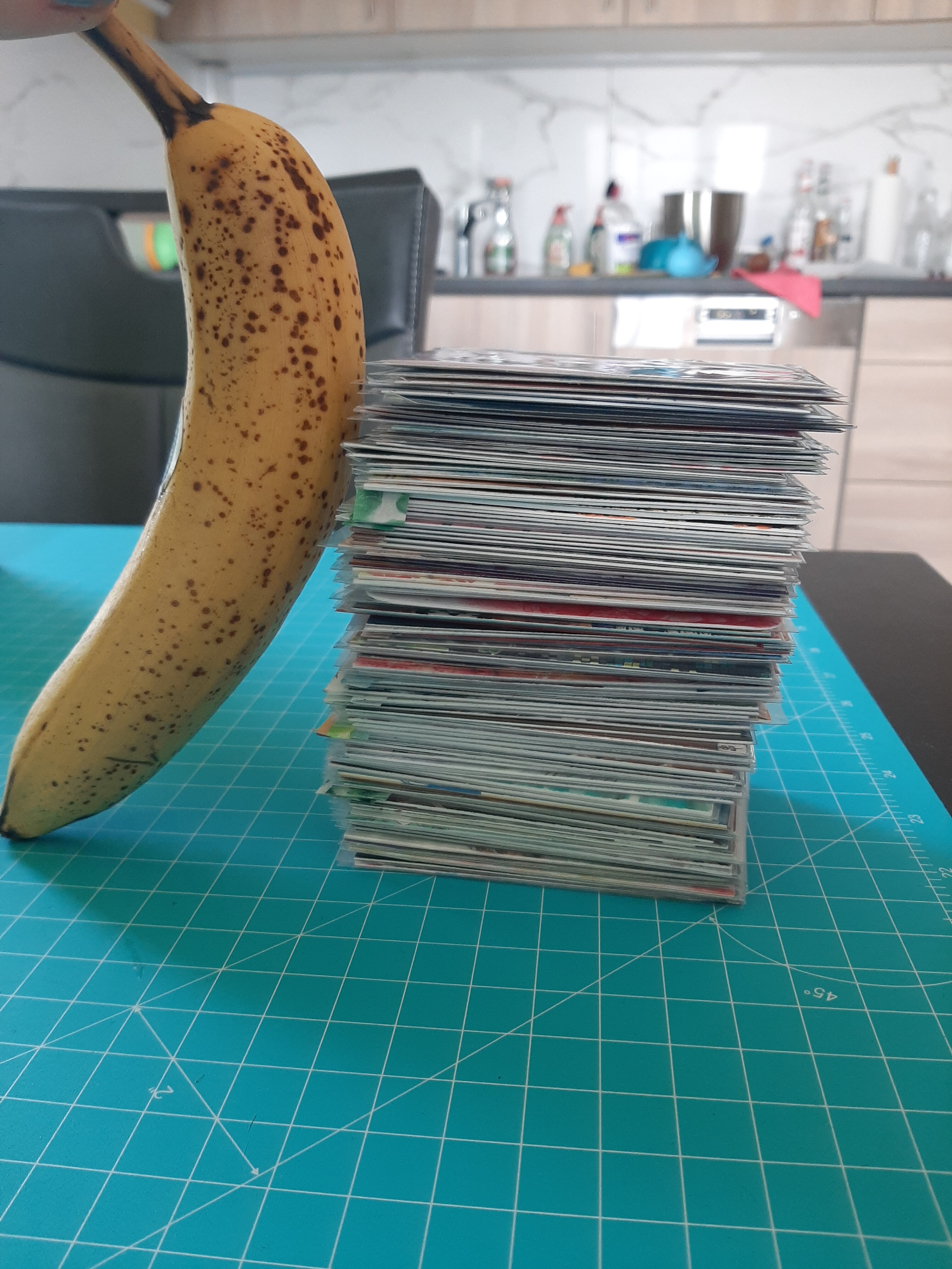 Wenn sich jemand schonmal gefragt hat, wie 107 Karten gestapelt aussehen - bitte schön. Banana for scale (und ignoriert meine Küche im Hintergrund bitte, da war das Licht am besten x’D)