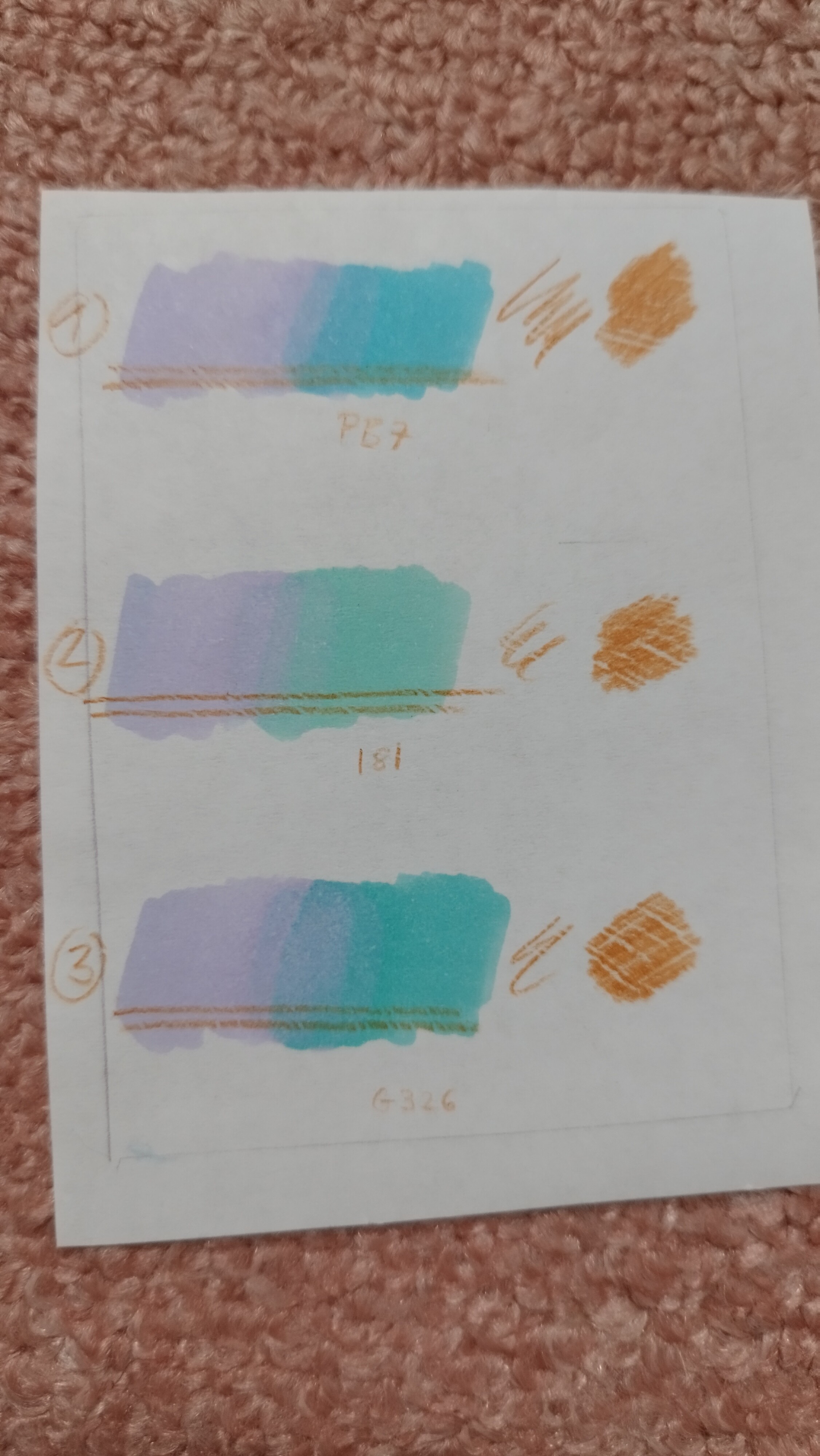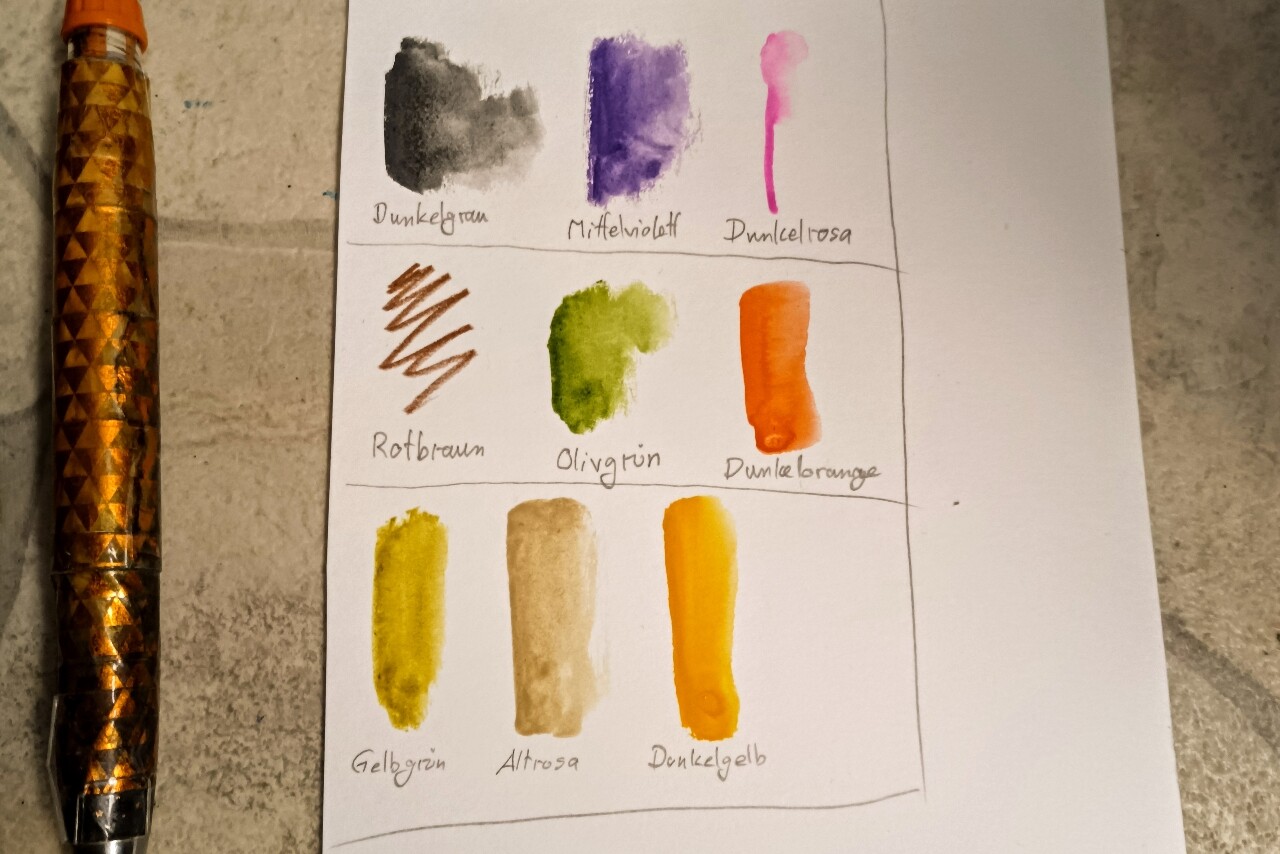 Alles auf nem scrap paper geprobt, das mir nicht sonderlich gefällt. Ich habe leider keinen schönen Türkiston, das nächstbeste ist dieses Minzgrün. Im Notfall würde ich zu Markern greifen, aber da ist mir Umber woeder zu dunkel. Welches Goldmaterial ich benutze weiß ich letztendlich auch noch nicht