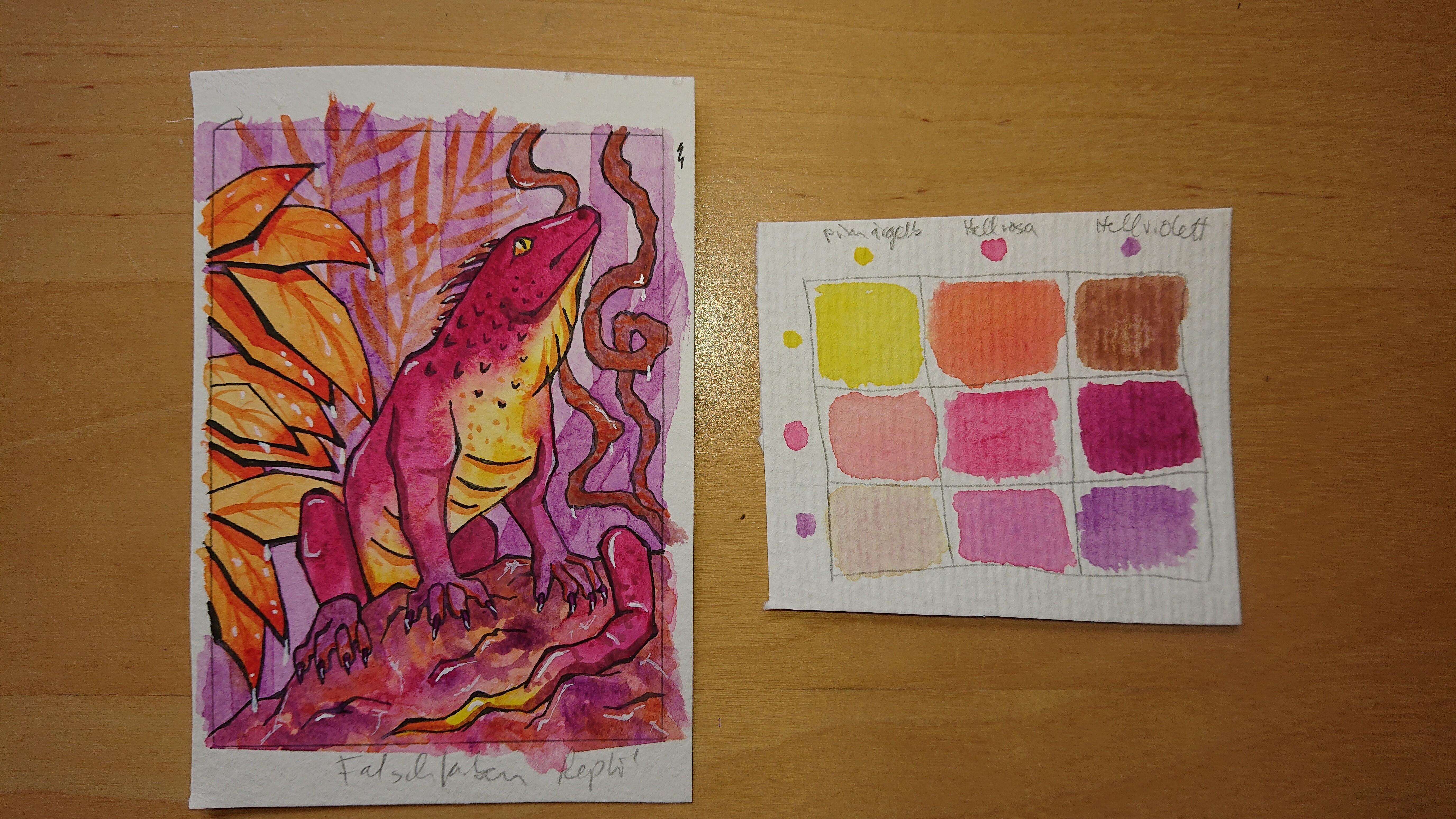 Das Hellrosa ist @Eller s Farbkarten Quinacridone Rose von M. Graham, was mit viel Wasser auch herrlich hellrosa ist - ich hoffe die Verwendung ist in Ordnung.