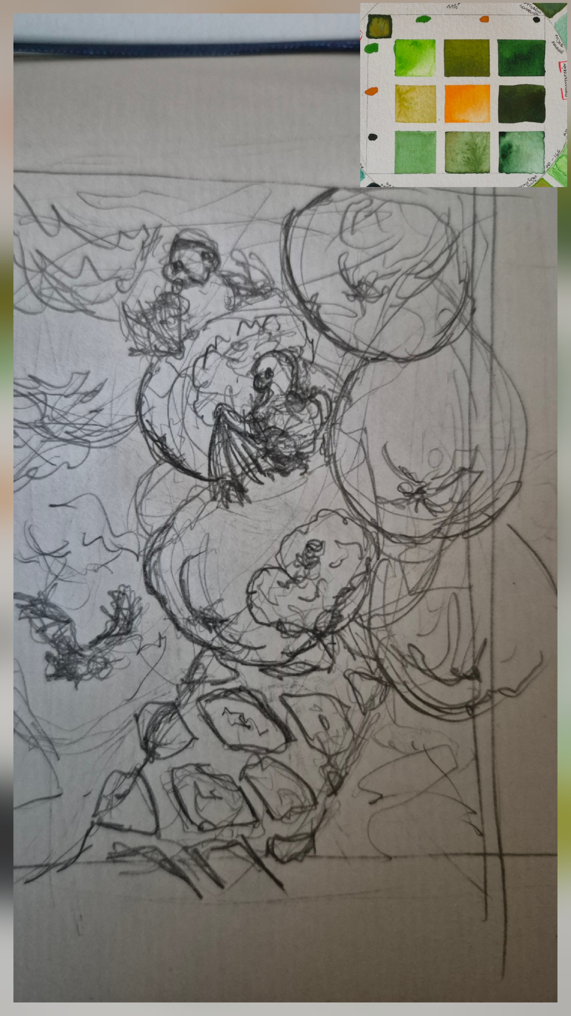Ich habe die Karte zunächst ohne Lines erstellt, jetzt aber doch Teil-gelined bzw. da leichte Schraffuren erlaubt sind auch ein paar eingefügt. Weil ganz ohne passte das Motiv irgendwie nicht zu meinem Stil, fühlte sich falsch an. Jetzt mag ich sie lieber. Ein paar Details will ich aber noch dran ändern und auch über den orangen Kürbis evtl. noch mal leicht mit grün drübergehn, um das Orange etwas wärmer werden zu lassen, damit er sich besser ins Gesamtbild einfügt. Aktuell find ich es noch eine Spur zu kalt. Bei den kleinen Kürbissen hat das gut geklappt und es kam mit dem minimal-orang und minimal-grün eine stimmige gelbliche Farbe raus. Auch die Stäbe im Hintergrund werden vermutlich noch etwas überarbeitet, also ganz zufrieden bin ich noch nicht. Mal schaun, wie es sich weiter entwickelt.