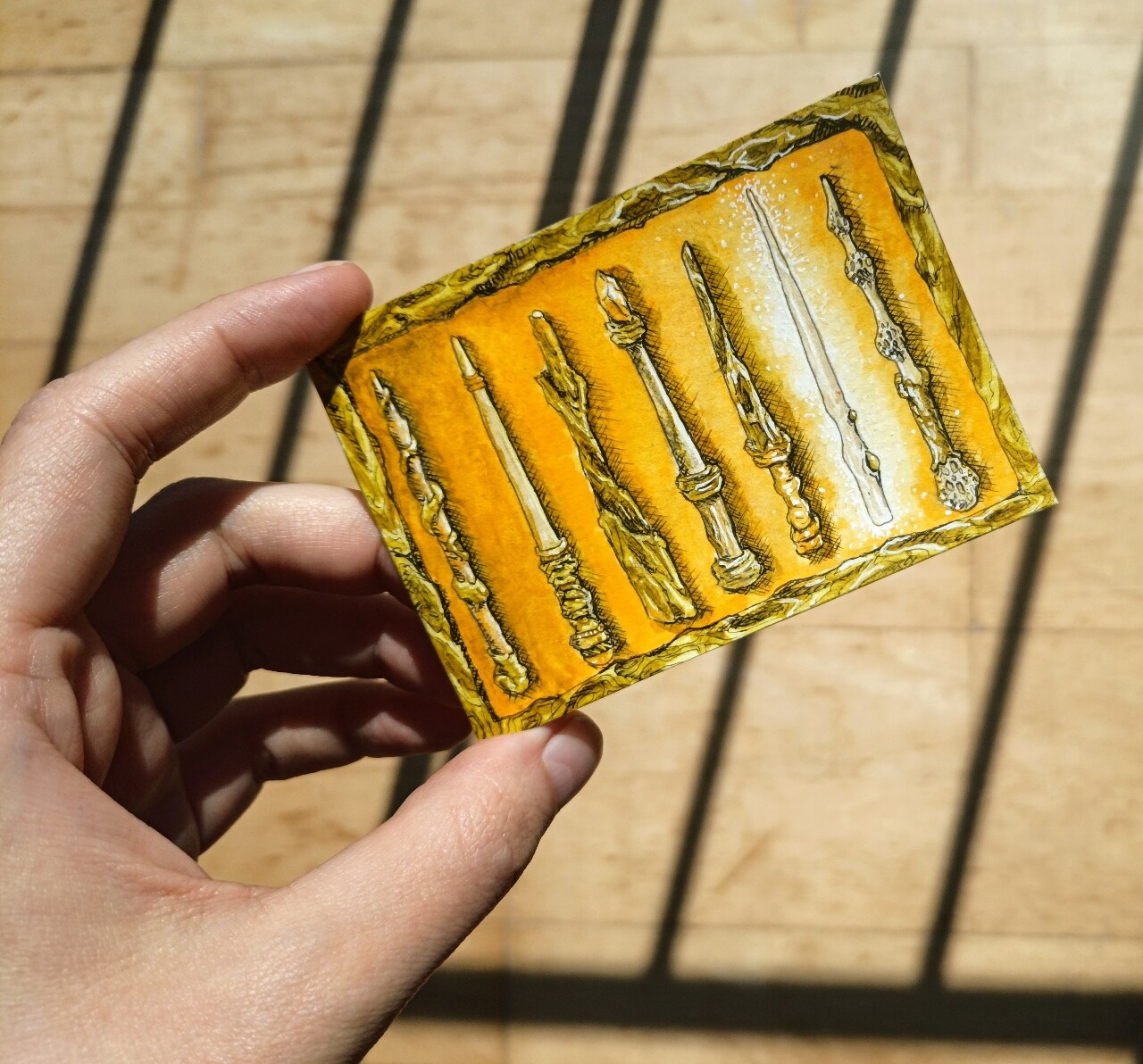 Auch noch nicht ganz fertig: Eine Zauberstab-Kollektion aus hellen Hölzern mit einem nicht-physischen Astralstab. Ich habe mich allerdings bereits jetzt so sehr in die Karte verliebt, dass ich sie behalten werde und stattdessen vielleicht eine andere male, falls es zeitlich ausgeht