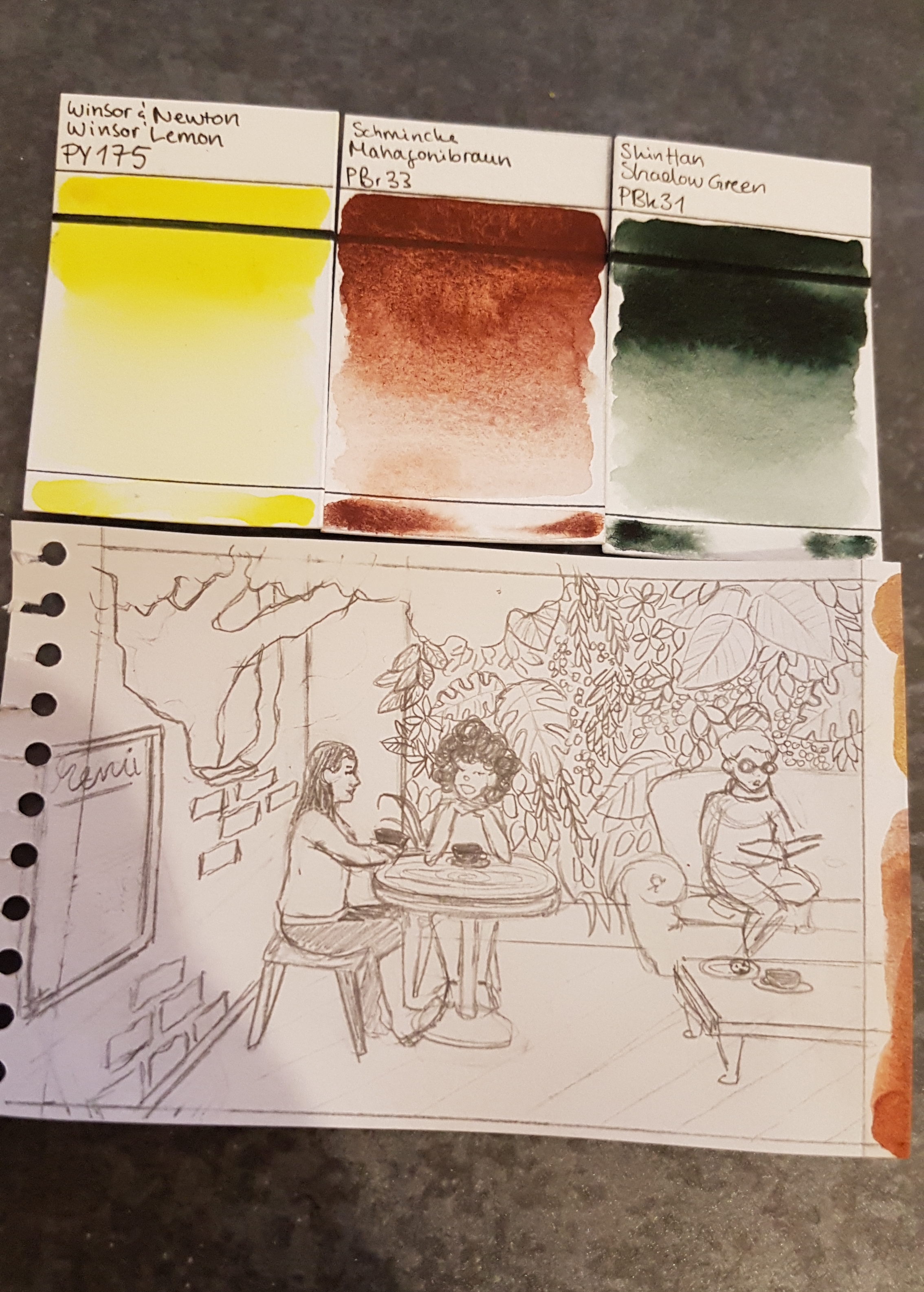 Hellgelb (Winsor & Newton - Winsor Lemon), Dunkelbraun (Schmincke - Mahagonibraun), Dunkelgrün (ShinHan - Shadow Green)