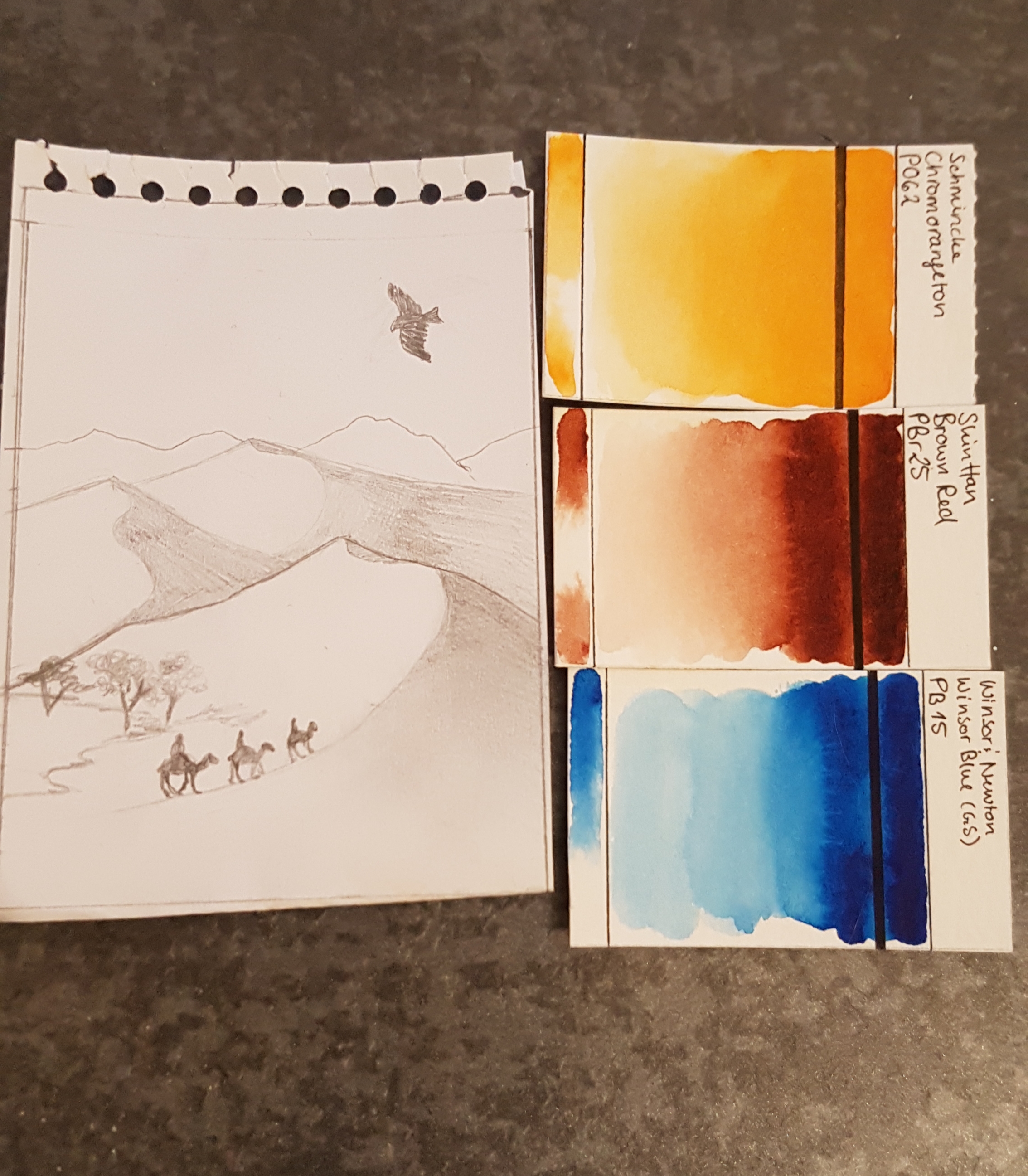 Phtaloblau (Winsor & Newton - Winsor Blue (GS)), Rotbraun (ShinHan - Brown Red), Hellorange (Schmincke - Chromorangeton)