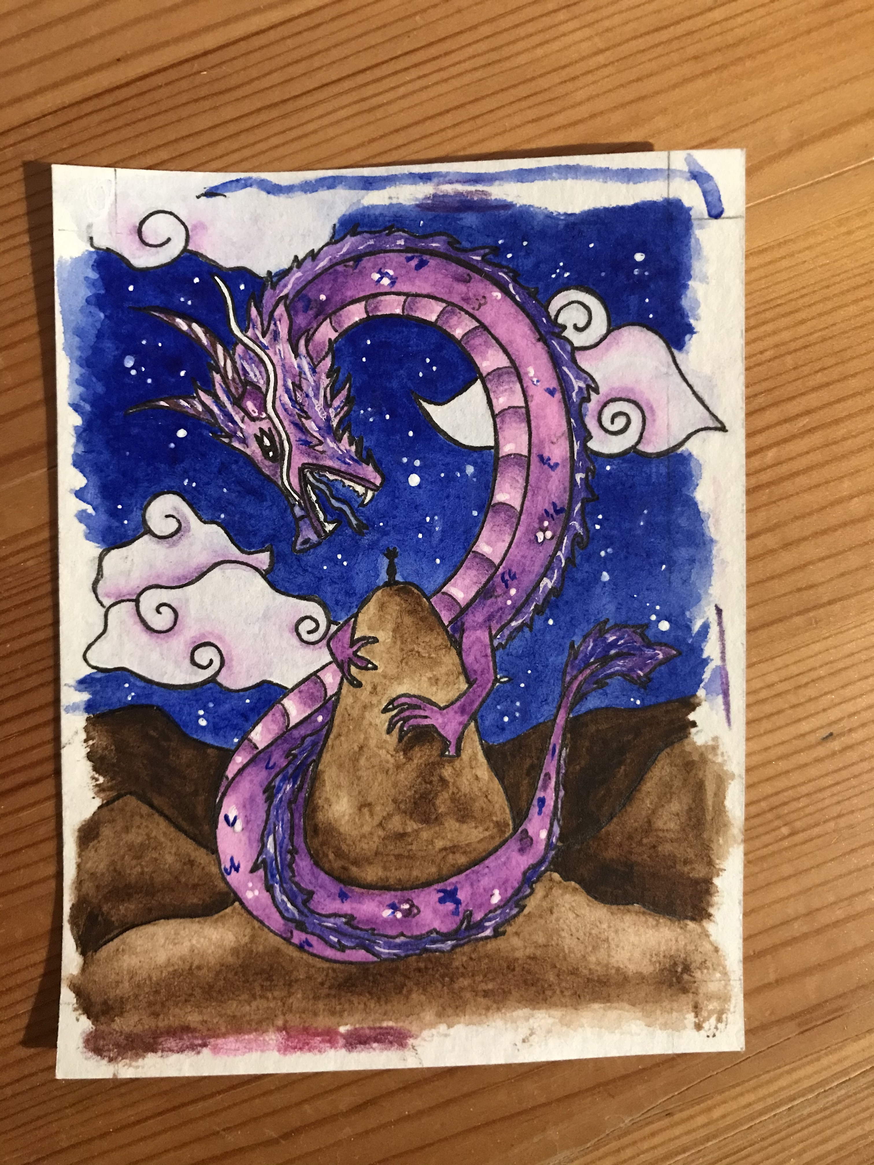 In den Hintergrund würde ich gerne einen Sternenhimmel packen in Ultramarinblau. Die Felsen vorne werden dann Schokobraun und der Drache hauptsächlich Hellviolett.