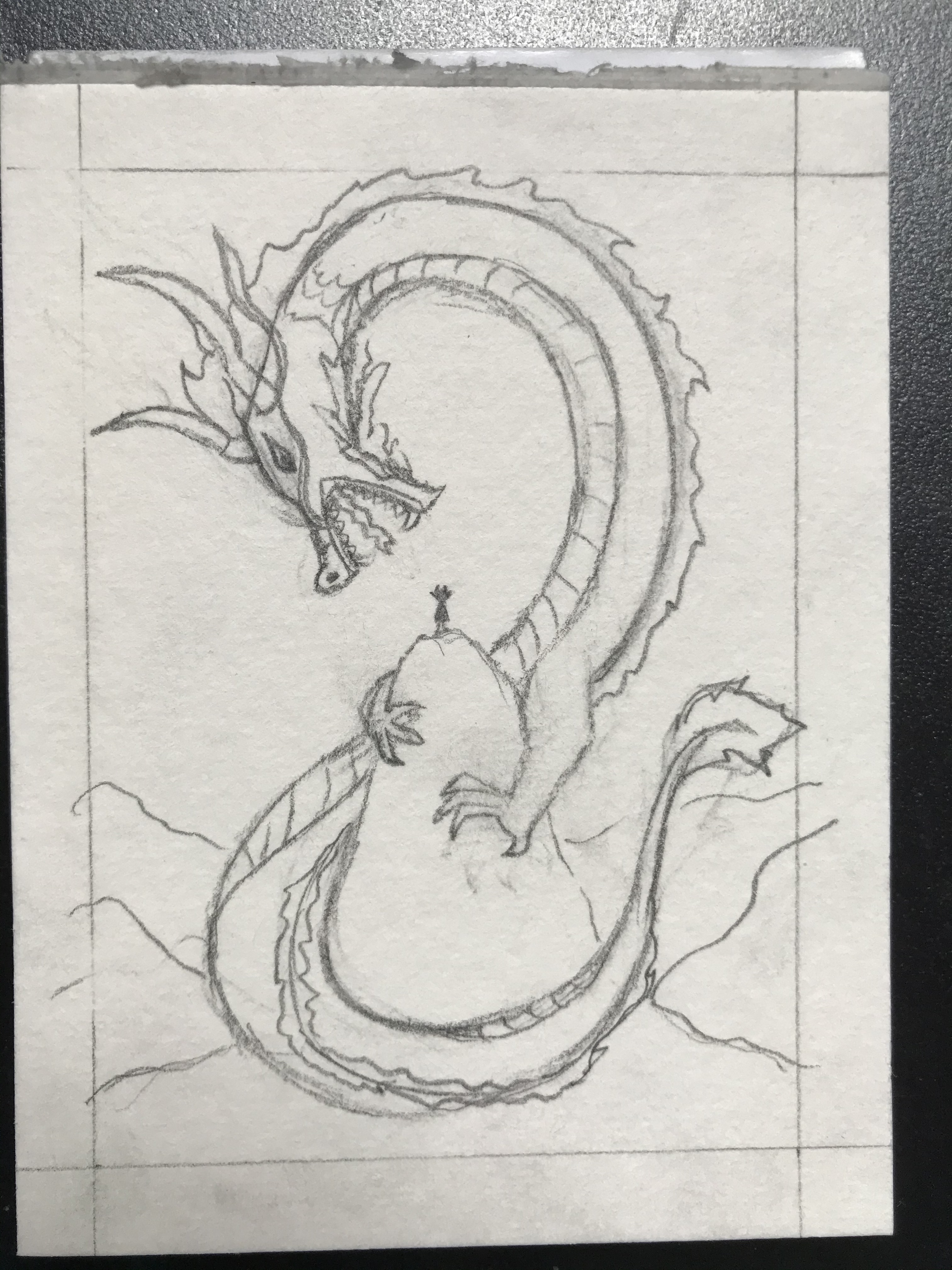 Ich hab mal versucht meine Wölkchen in die Skizze einzubringen. Ich mag die großen Wolken eigentlich lieber weil sie den Menschen kleiner wirken lassen aber vielleicht würden die kleinen Wolken ja den Drachen größer aussehen lassen. Ich bin mir da ein bisschen unsicher: