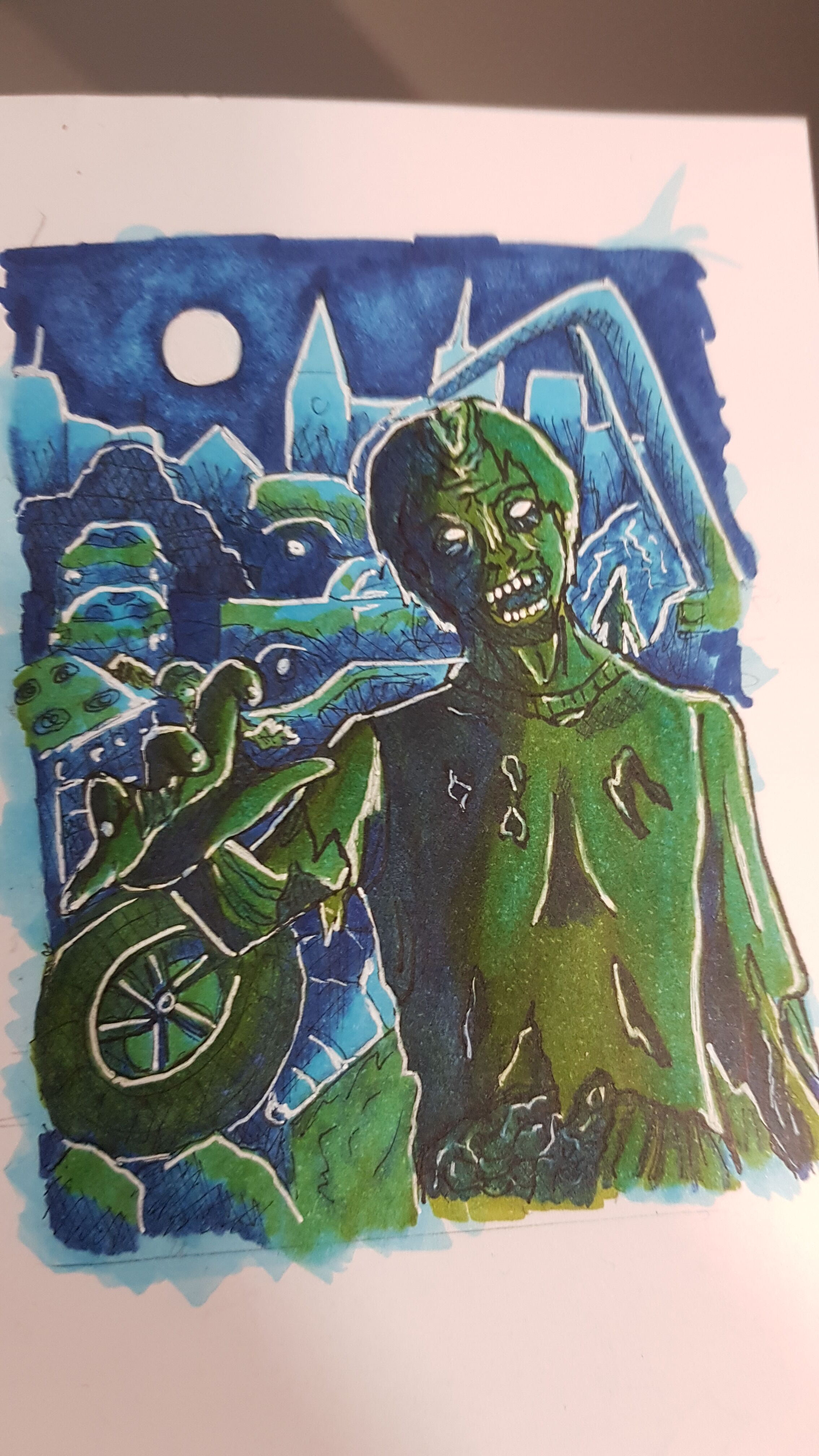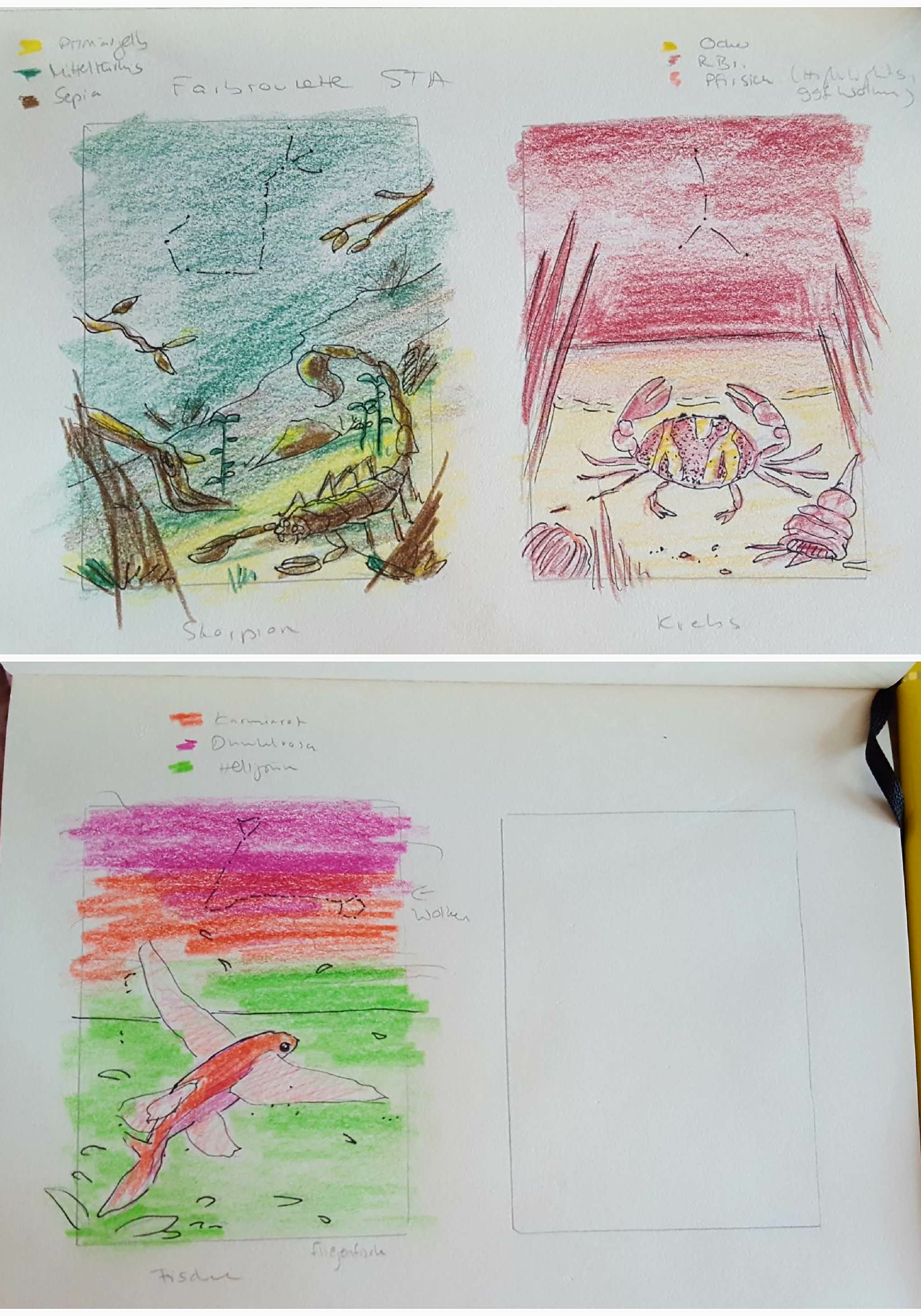 @MellyBell: Also der Krebs und Skorpion gehen so in Ordnung, beim Fisch tue ich mir etwas schwer, da die Hälfte der Karte quasi nur eine einfärbige Fläche ist… bei den anderen sind der Vordergrund etwas detaillierter bzw. die Komposition spannender, aber beim Fisch wirkt die obere Hälfte sehr leer. Wäre es vielleicht möglich, das noch etwas spannender zu machen? Vielleicht mit ein paar Wolken im Himmel oder Inseln am Horizont/Felsen im Wasser, oder mit ein paar Vögeln oder Fischen? Ich hab nicht viel Erfahrung mit Alkoholmarkern, aber am Horizont sieht es aus, als würden das Grün und Rot eine schön dunkle, dramatische Farbe ergeben. Vielleicht könnte das funktionieren?