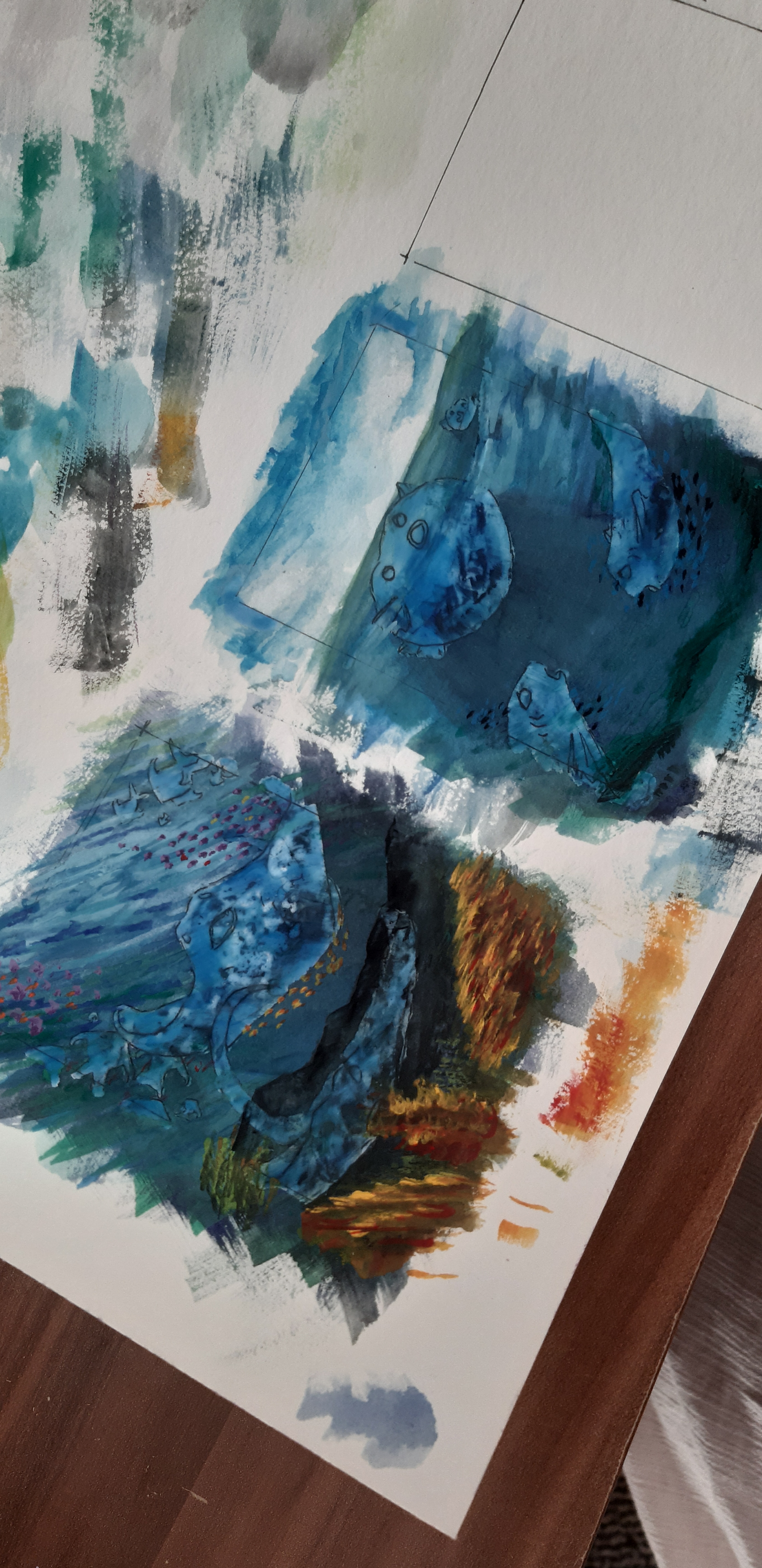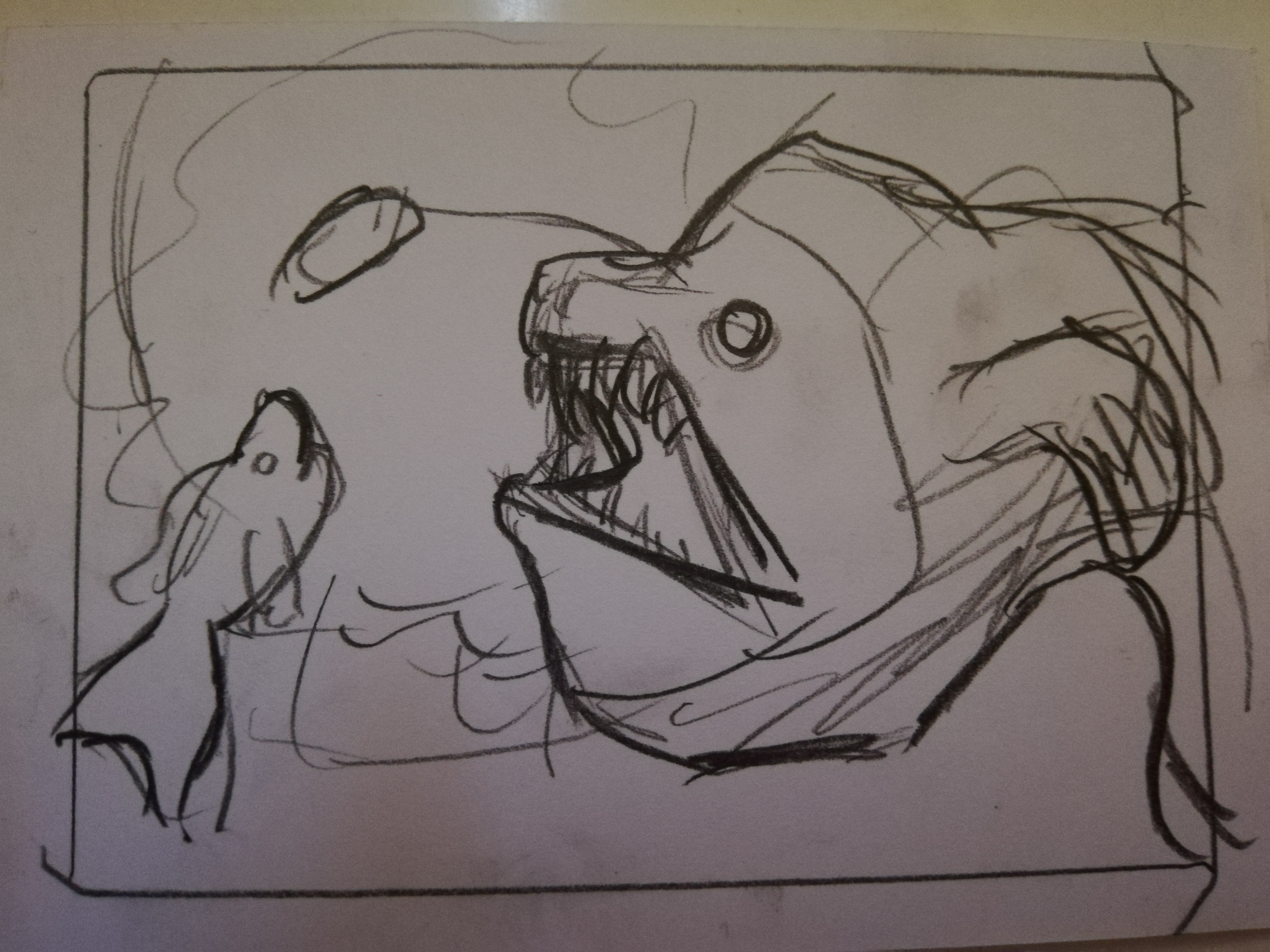 Soo, nachdem der Kampffisch wegen dem Hintergrund ausgeschlossen wurde, hab ich den Kampffisch ganz verworfen. Ich hätte noch am hg basteln können und Pflanzen reinbauen können, aber dann kam mir die Idee mit dem anglerfisch. Wie immer ist das die erste unsaubere Skizze. Nur gibt es ein Problem. Das ist ein tiefseefisch und da unten ist es dunkel… Hat jemand Ideen und Vorschläge auch zwecks hg???