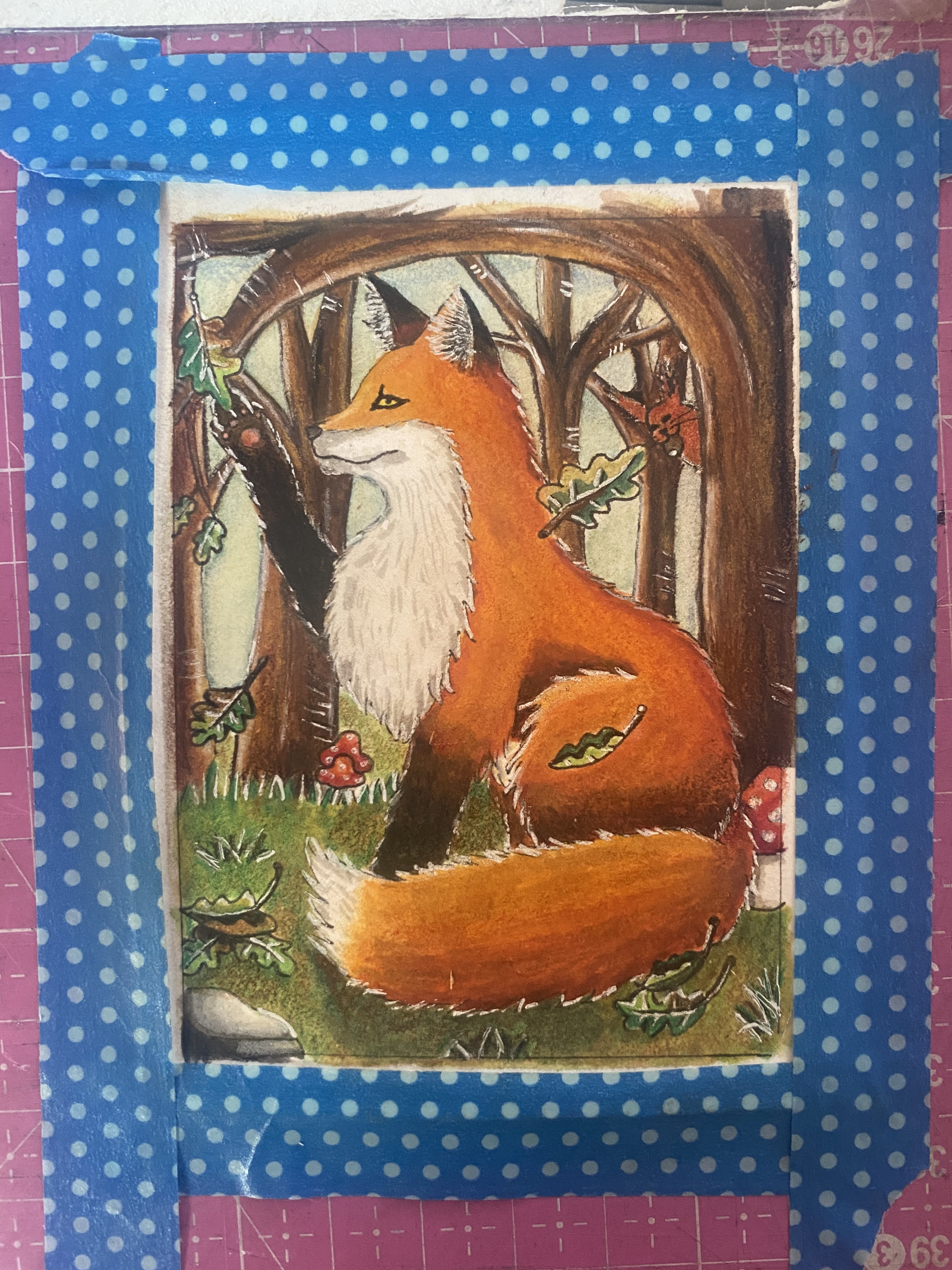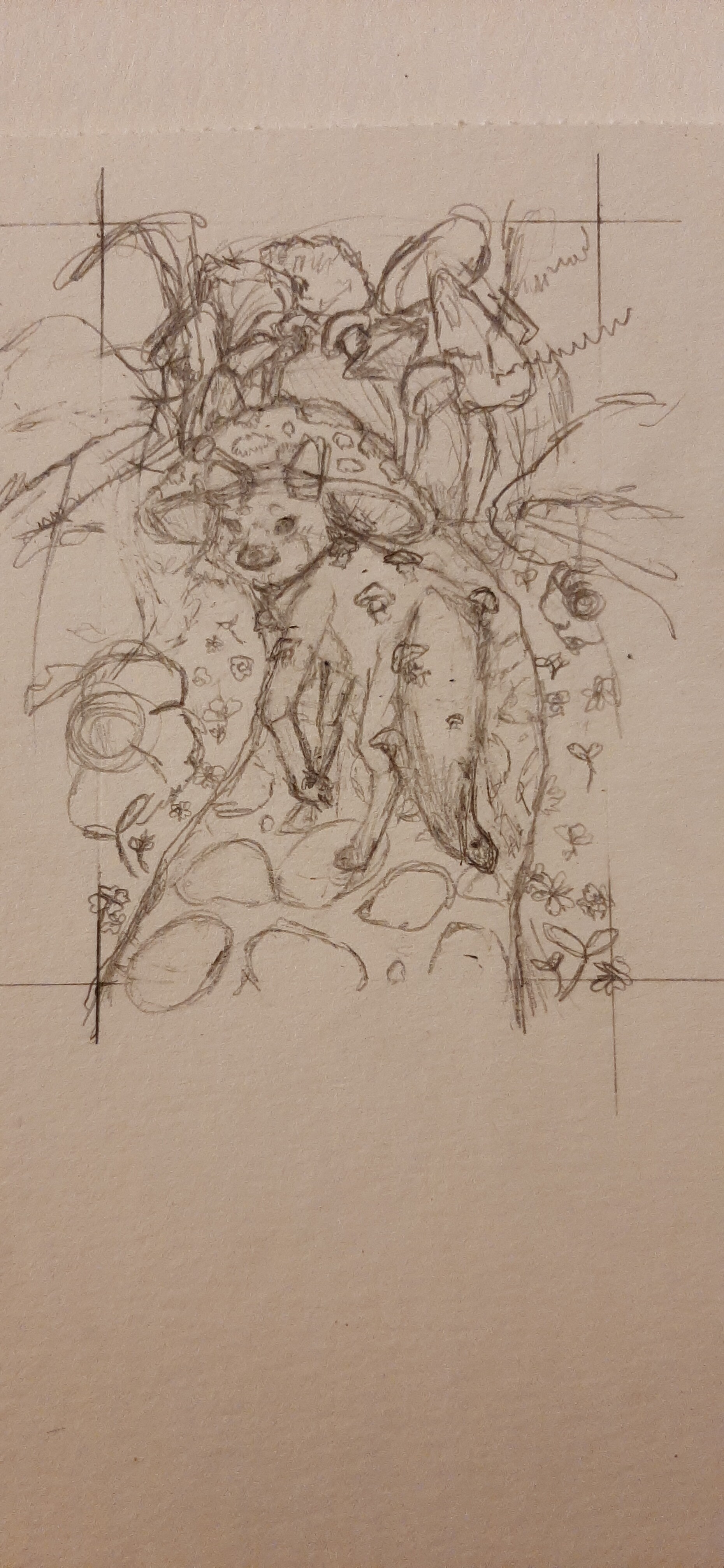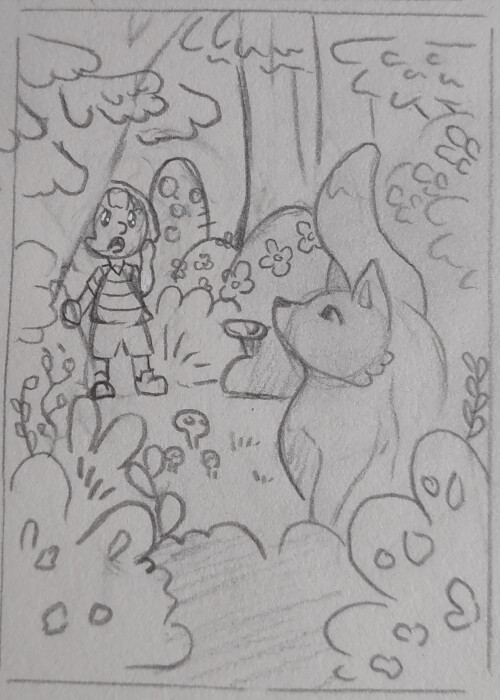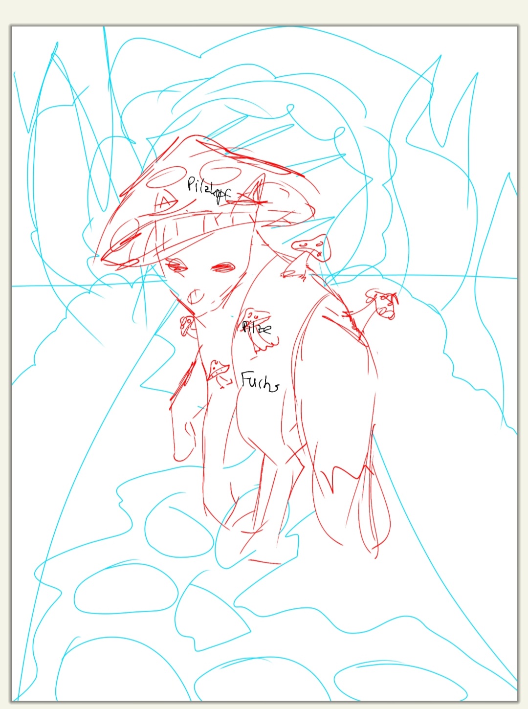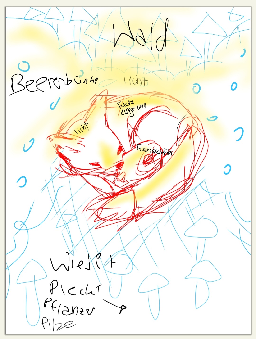 hier bin ich noch suoer unsicher mit dem hintergrund. ich weiß nicjr, ob der fuchs in einen normalen wald gehen soll oder in einen wald aus riesigen pilzen, das muss ich mir noch überlegen