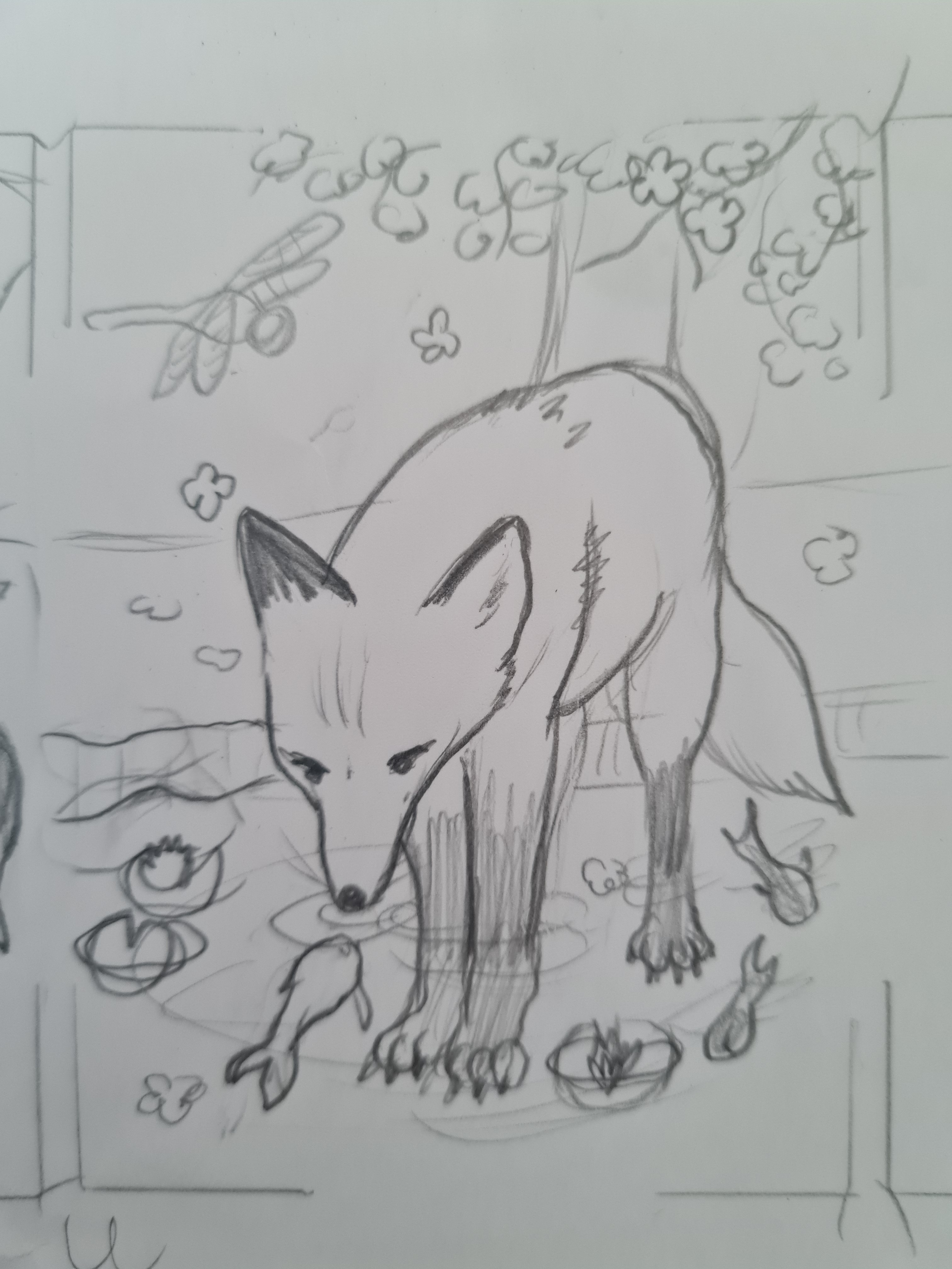 Ich hab meine 1 Idee etwas überarbeitet und mich entschieden die Welpen weg zu lassen, dafür ein liebes Pärchen. Der männliche fuchs knabbert verliebt am örchen des weiblichen fuchses. Die skizze ist soweit auch fertig.