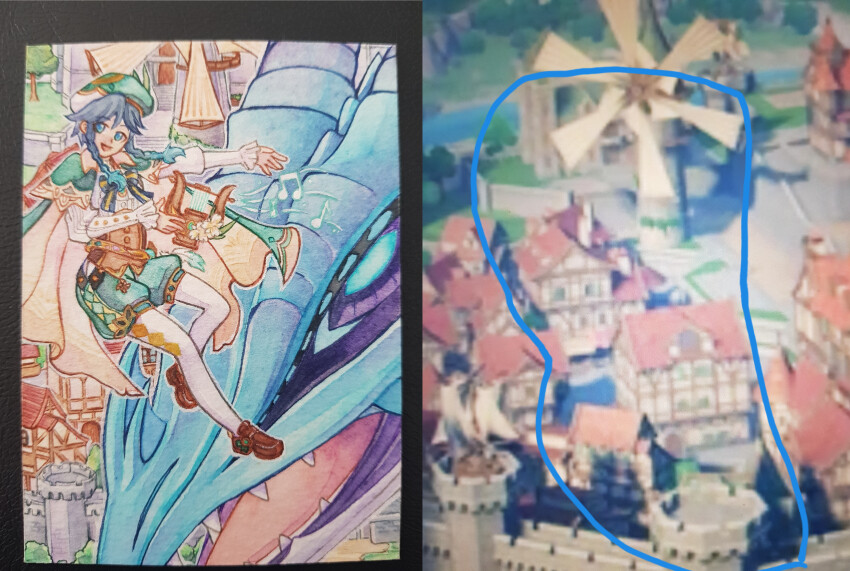 Bei einer Referenz überlegt man ja auch was nach eigenem Stil / Können / Motiv Sinn macht. Für Mondstadt wäre das zB der große Platz mit Statue, der Brunnen, die Kathedrale… je nachdem wo dein Char ist. Auch bei Luftansicht muss ja nicht alles drauf sein.