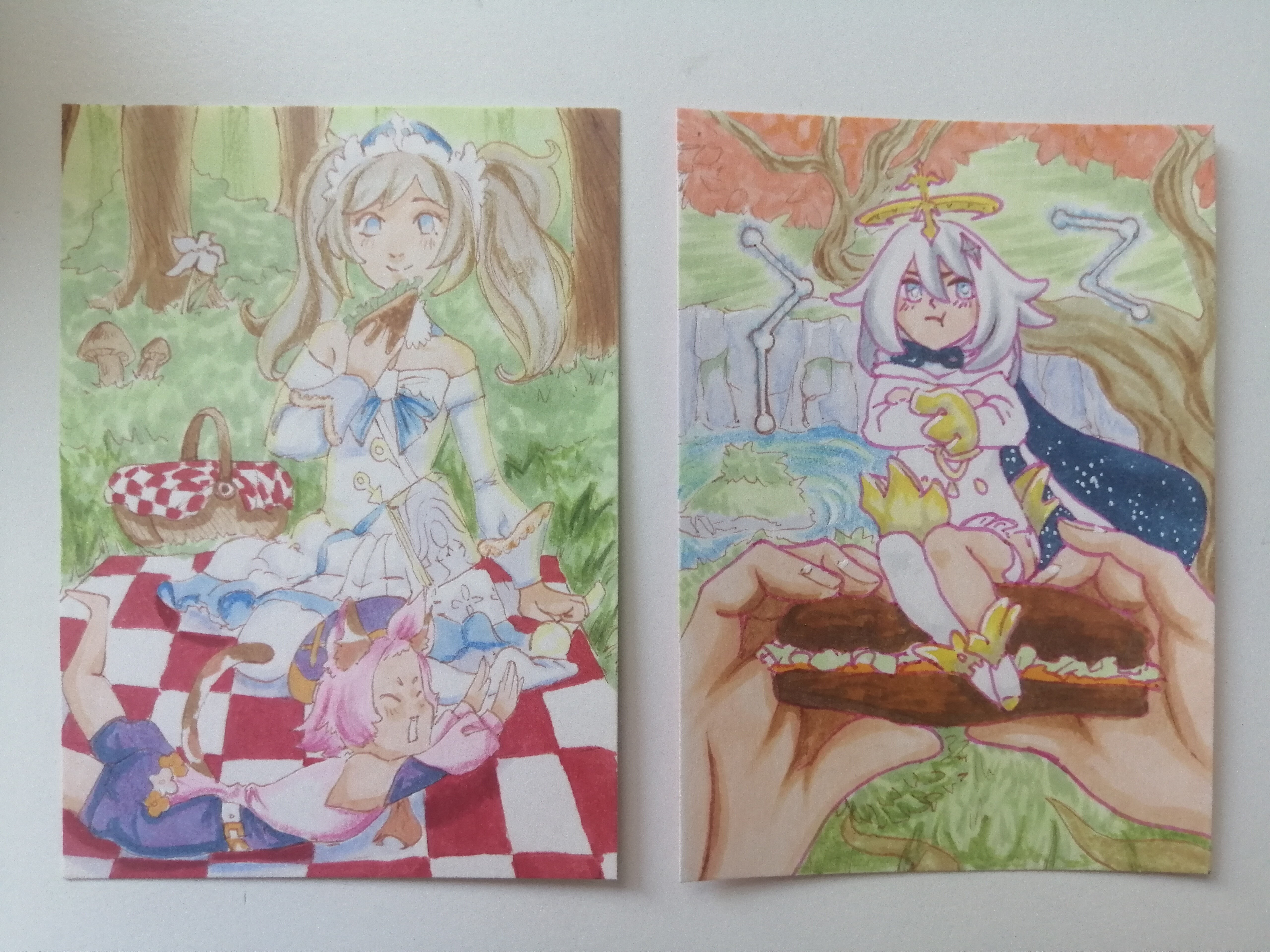 Ich melde mich dann auch mal mit meinen beiden ersten Karten. Ich wollte unbedingt eine Picknick Szene machen und dachte die beiden passen da ganz gut hin:3 bei der rechten musste ich an das Paimon-Notfallration-Meme denken und wollte unbedingt eine Karte dazu machen. Ich hoffe sie gefallen euch, und wollte auch direkt fragen, ob ich die so einreichen kann.