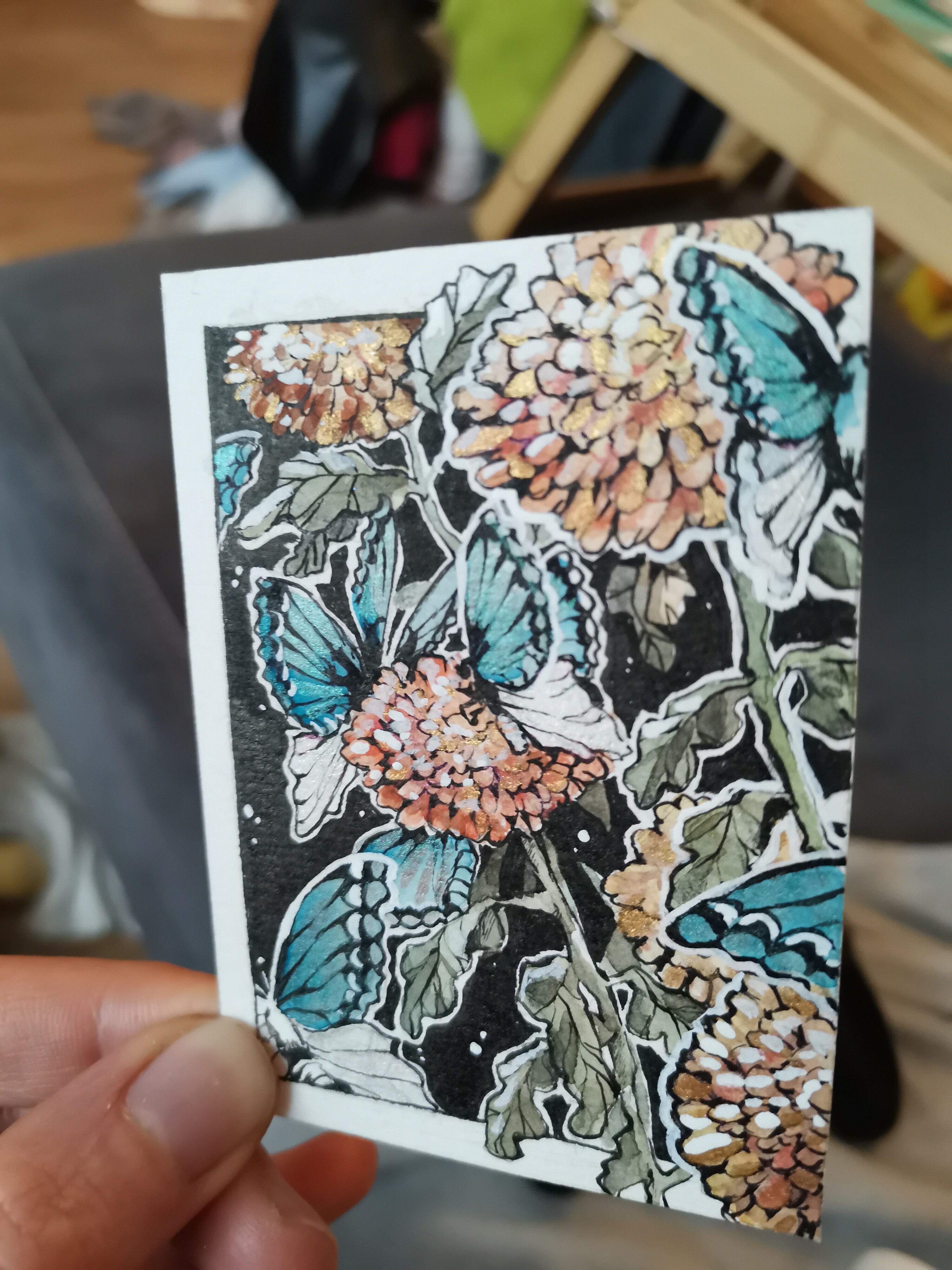 Ansonsten noch blauerbzw Türkise Glitzer an den oberen Flügeln und goldene Akzente an den Chrysanthemen.