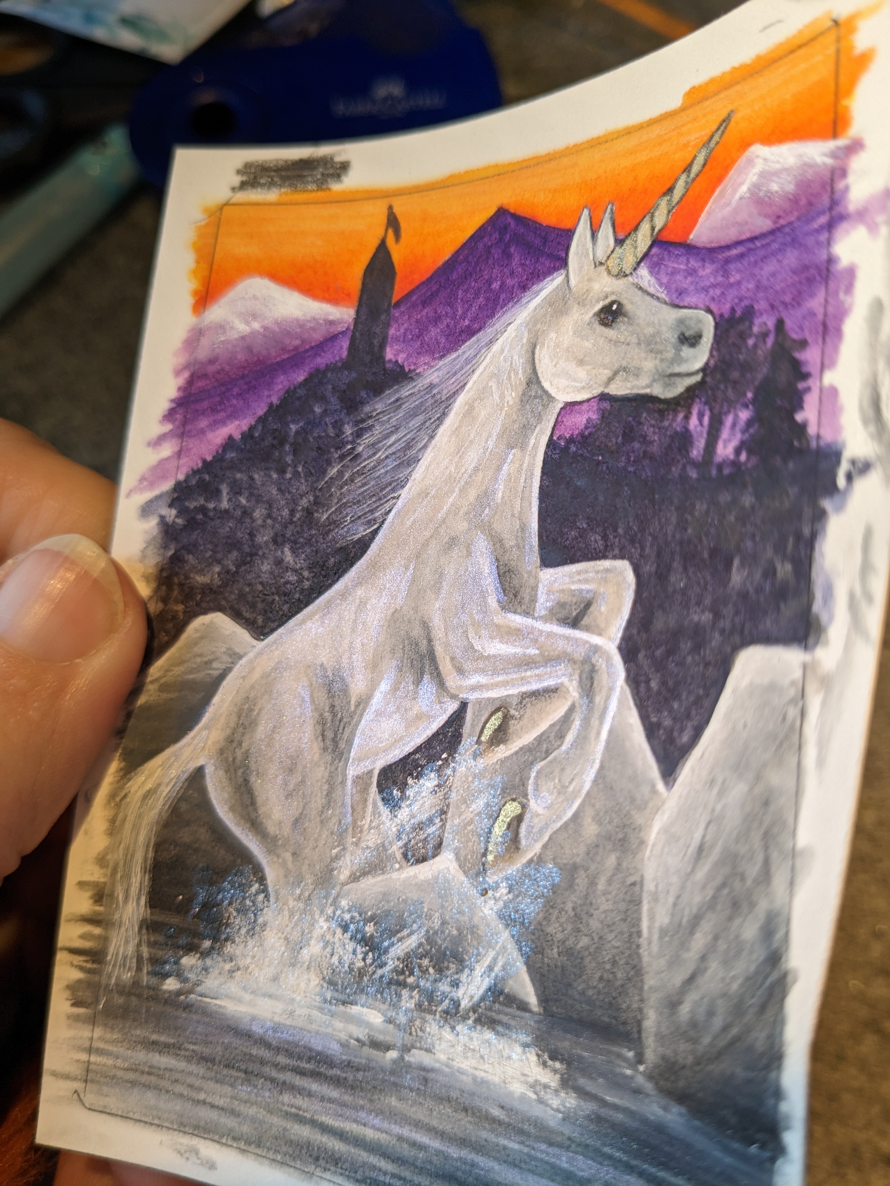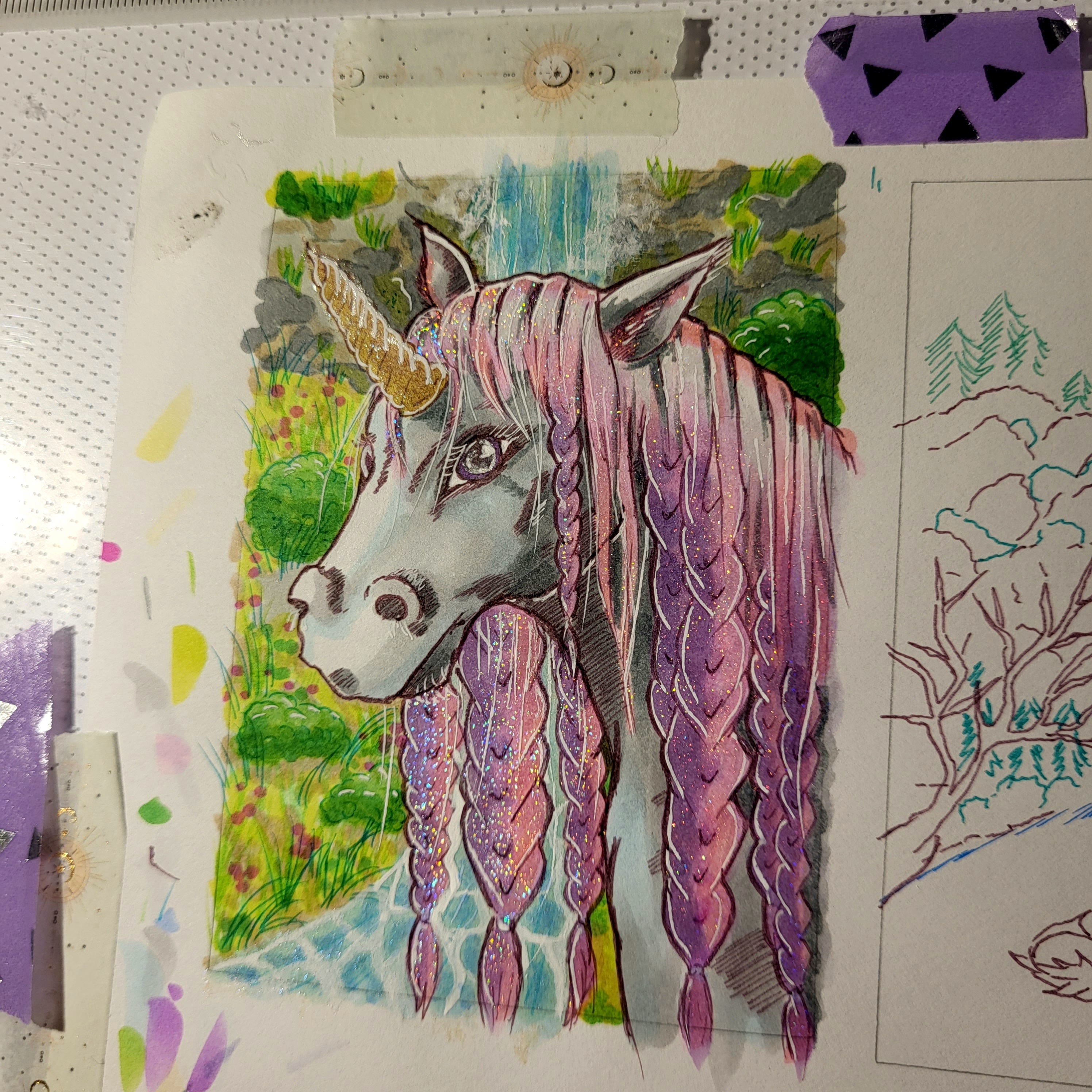 - Ein Einhorn mit schillernder Mähne und Horn. Hintergrund wird noch ausgearbeitet.