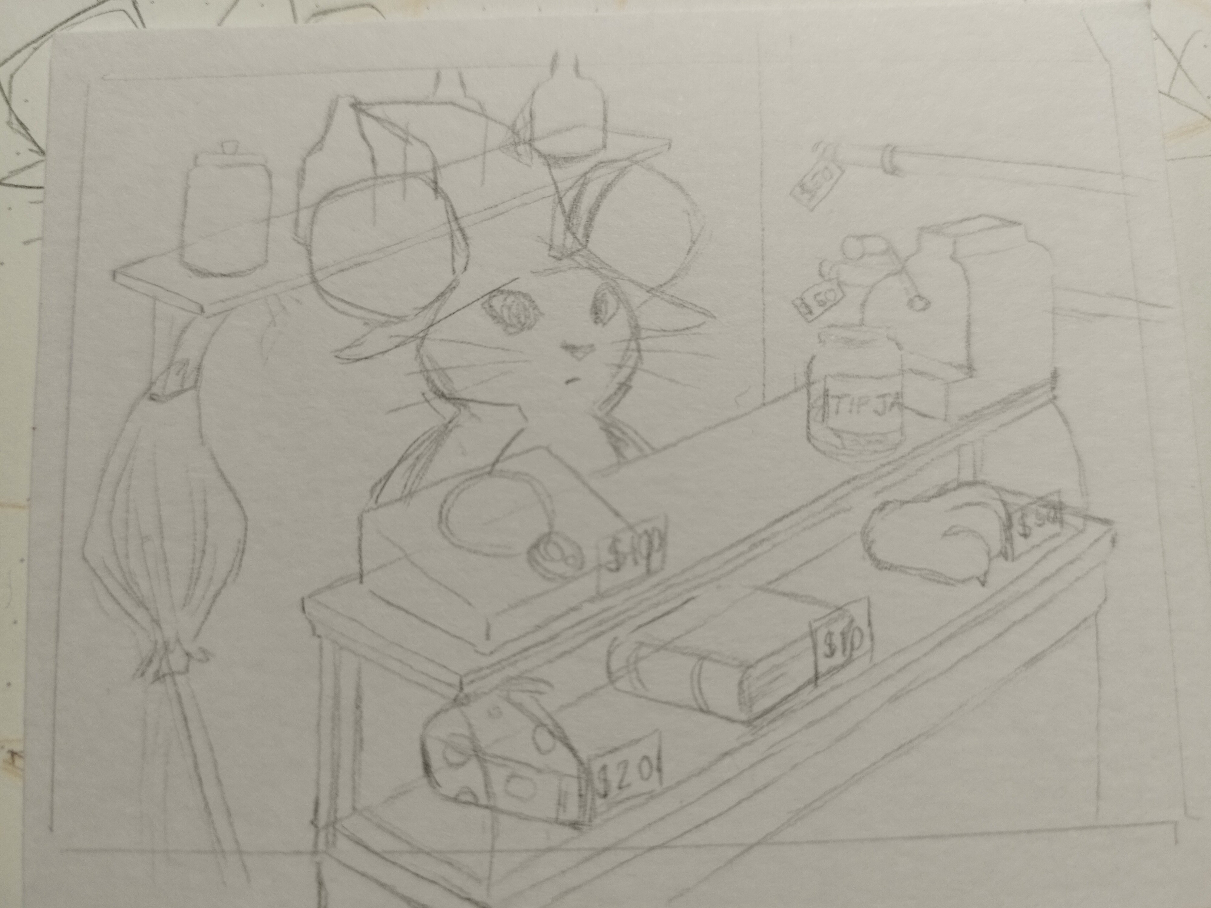 Hier ist übrigens eine Skizze zu einer kleinen Hexen Maus in ihrem Hexenladen, ich hab mich ein wenig von Eleisis’ Karte inspirieren lassen, hoffe das ist ok ^^"