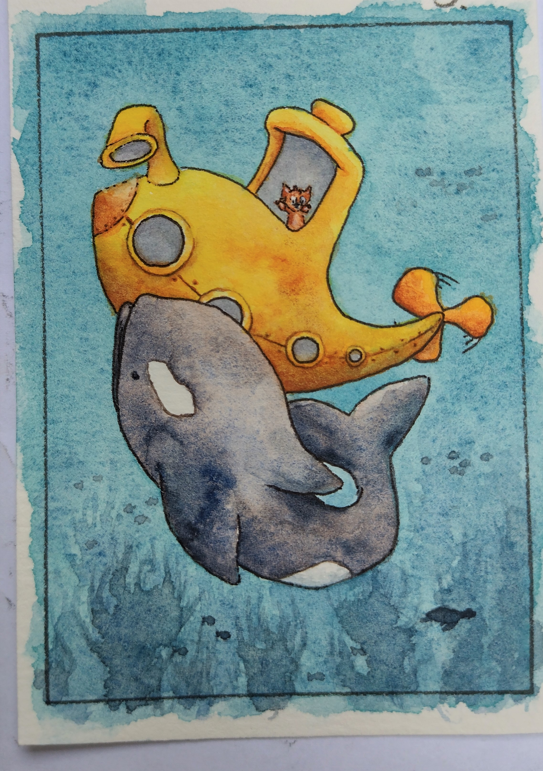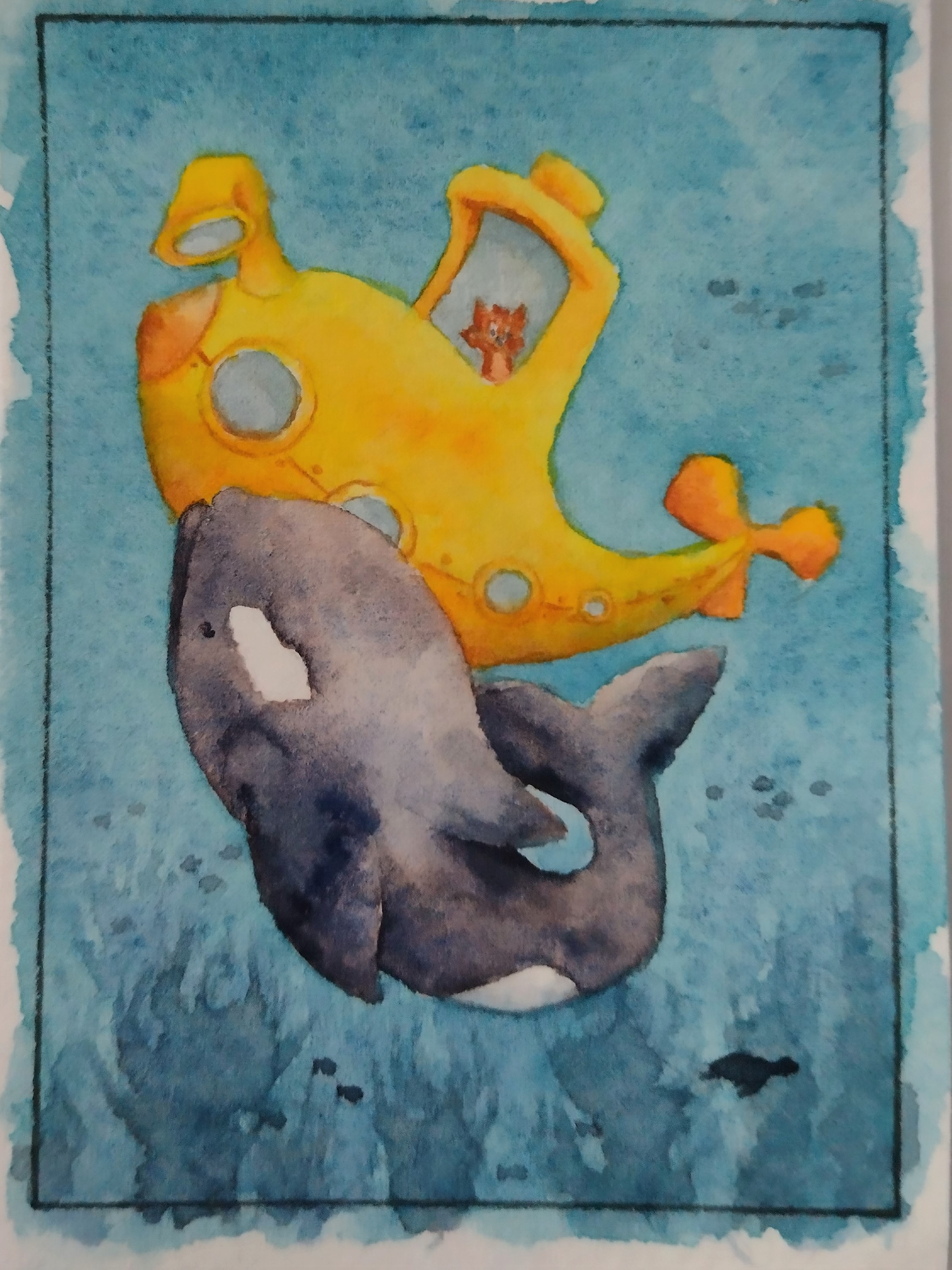 Hm, der Kontrast zwischen dem U-Boot und dem Hintergrund ist nicht so groß. Ich würde die Umrandung des U-Boots noch etwas dunkler machen, und, wie FireCave sagte, die Umrandung der Bullaugen/ den Grenzen der Metallflächen ebenfalls. Vielleicht kannst du dem U-Boot auch noch Schatten geben? Bisher ist die Kolo des U-Boots noch recht flach/ wenig plastisch. Es sei denn, du willst das so. Dann bräuchtest du innerhalb des U-Boots aber irgendwie andere, kontrastreichere Flächen. Beim Orca hast du das durch die Granulation ja schon schön erreicht.