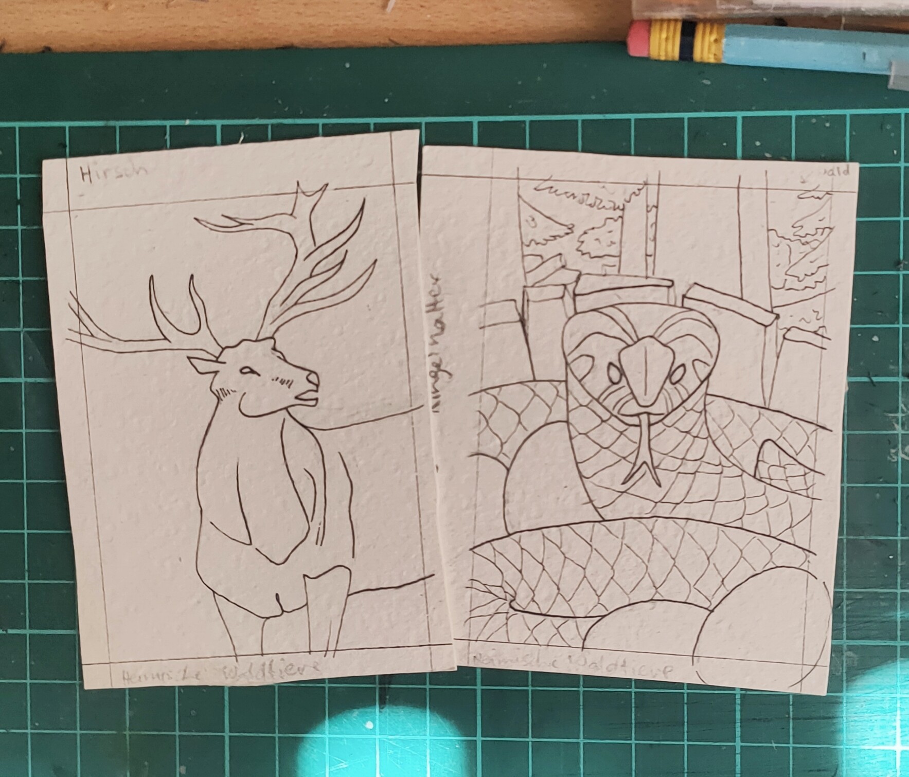 Erste Einblicke. Ich versuche mich gerade an herbstlichen Aquarell Motiven. Die erste Karte ist fertig (der Damhirsch), bei der zweiten hänge ich am Hintergrund (Waschbären), Nummer drei liegt immerhin schon unter Rubbelkrepp, hat aber noch keine Hintergrund Idee.