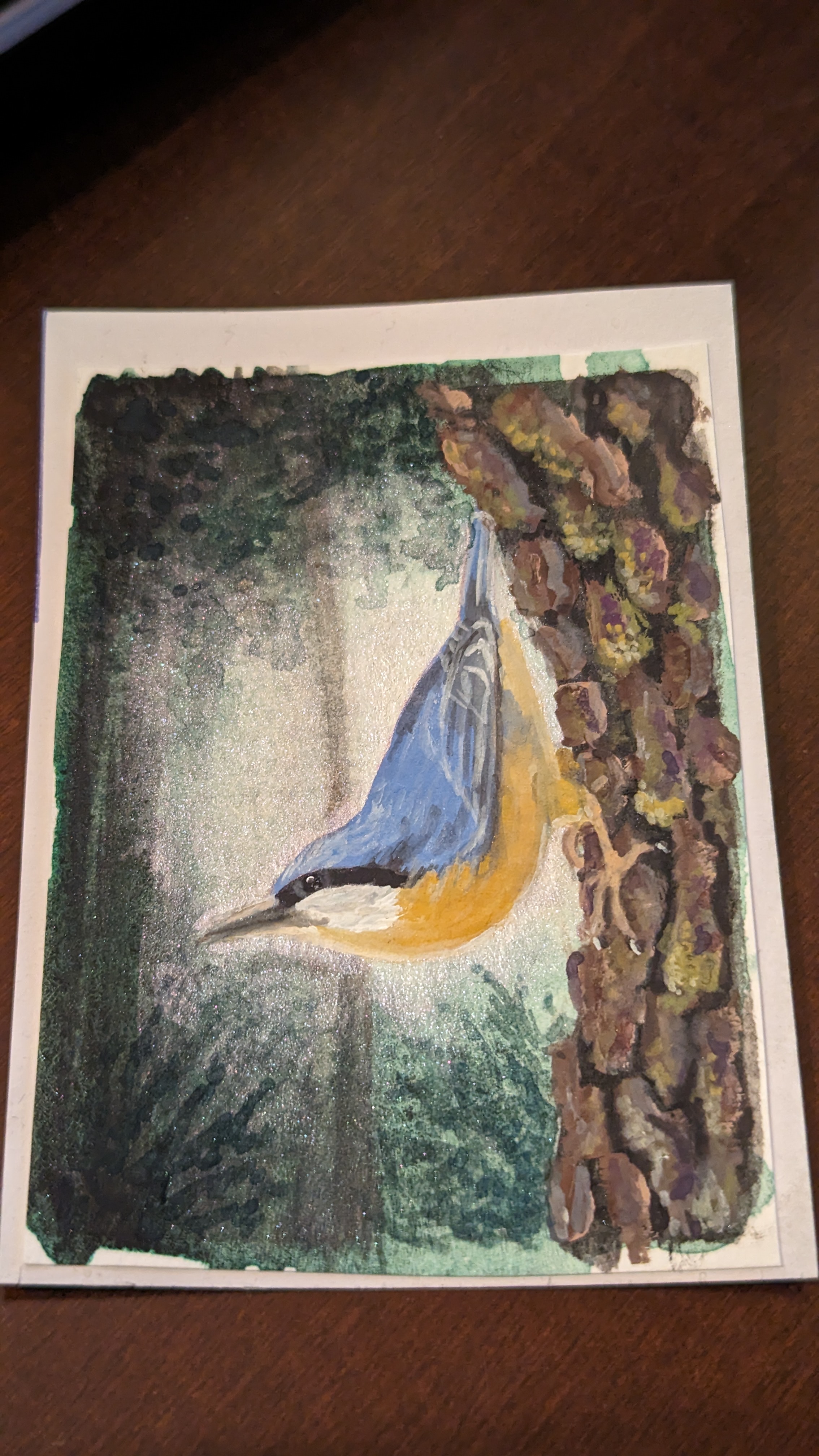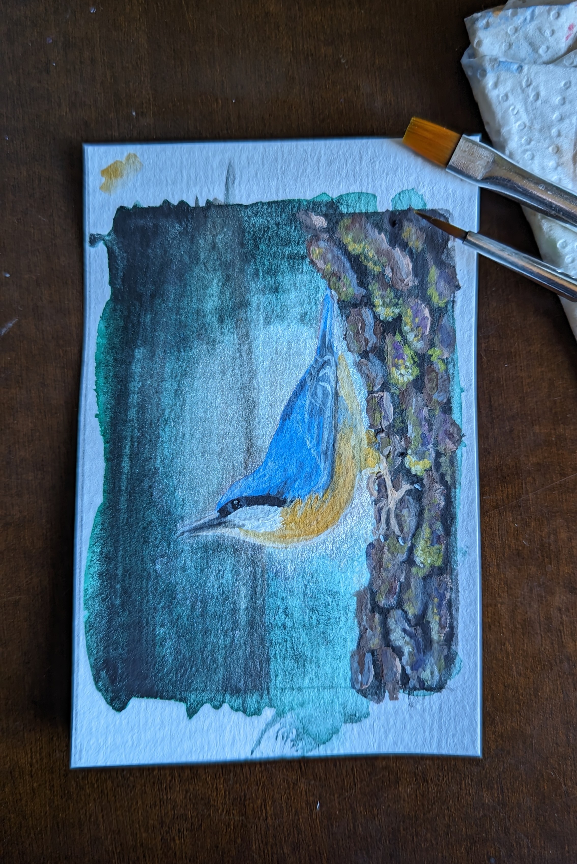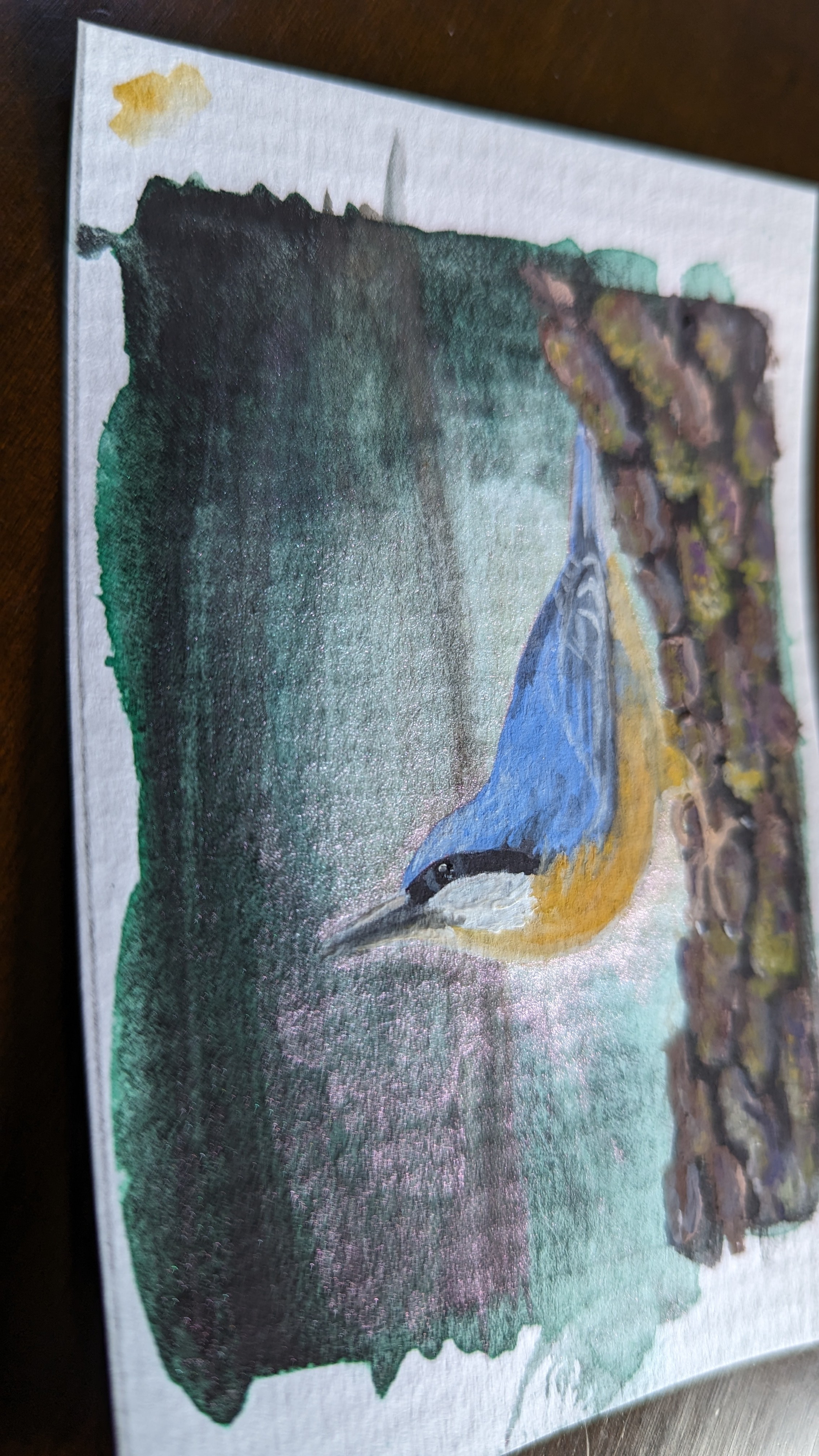 Der Kleiber selbst und der Baumstamm sind sehr gut ausgearbeitet und mega geworden, da kann der Hintergrund auch etwas einfacher sein. Ich frage mich nur, ob durch die Andeutung des Baumstammes im Hintergrund, speziell bei der senkrechten Linie, die hinter dem Kopf verläuft, nicht eher ungewollt mehr Nähe erzeugt wurde, die wiederrum mehr Details erfordern würde. Ginge es noch so andeutungsweise mit diesem dunklen Grünton im Hintergrund oben und unten Silhoutten von Blättern anzudeuten? So ein bisschen Vignettenhaft? Durch die Granulation der Farbe selbst warst du ja bereits auf dem Weg dahin.