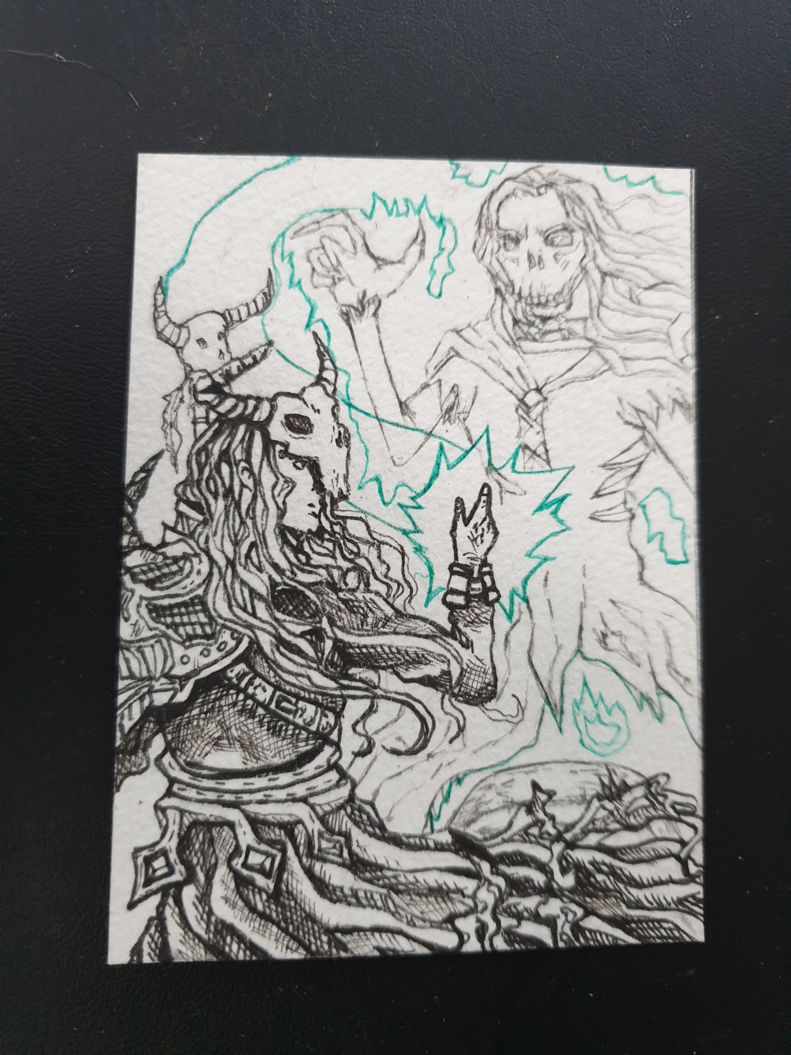 Hier wäre mein wip zu meiner letzten Karte. Sie zeigt einen bösen Hexer der was übles herbei beschwört.