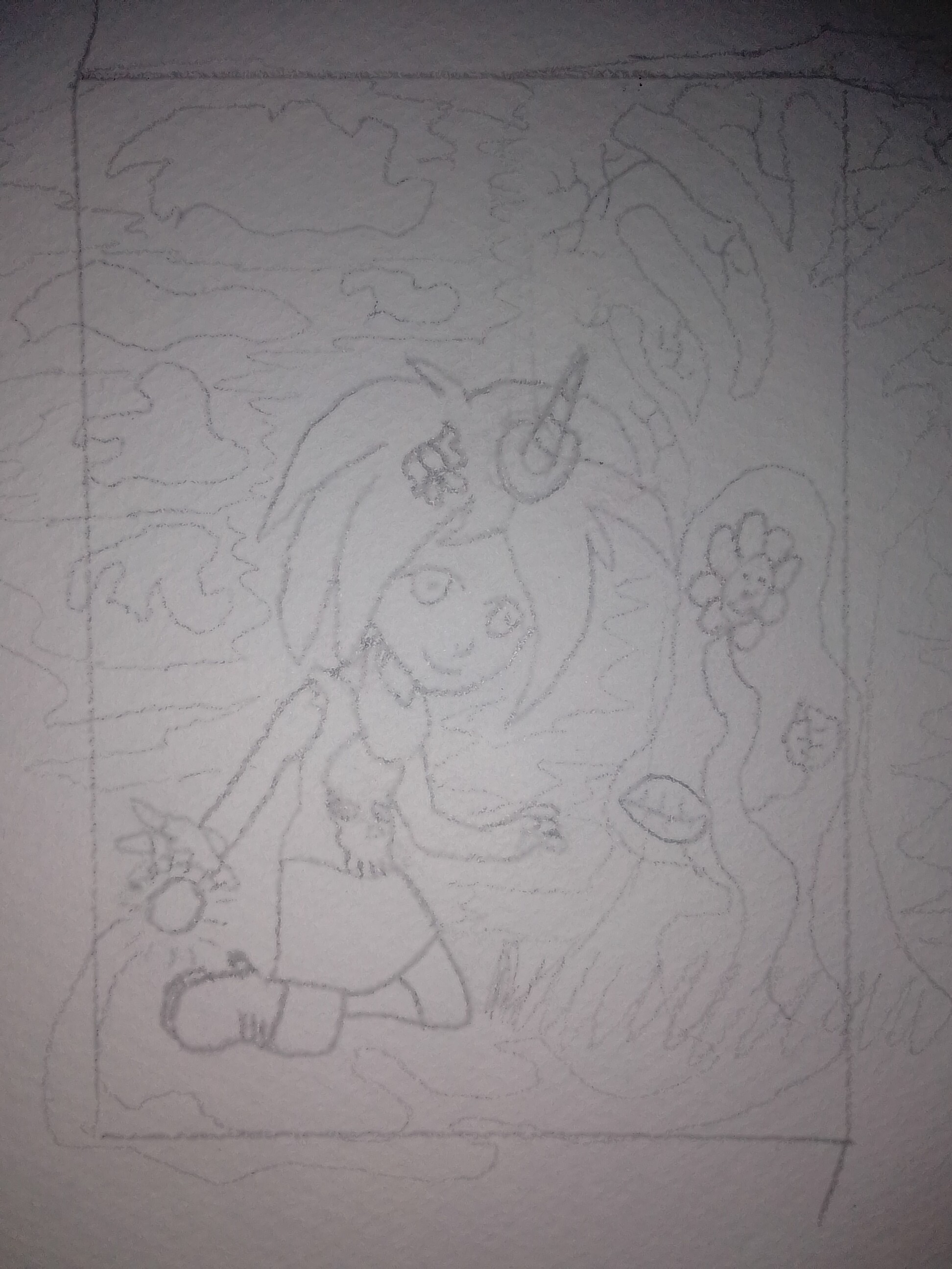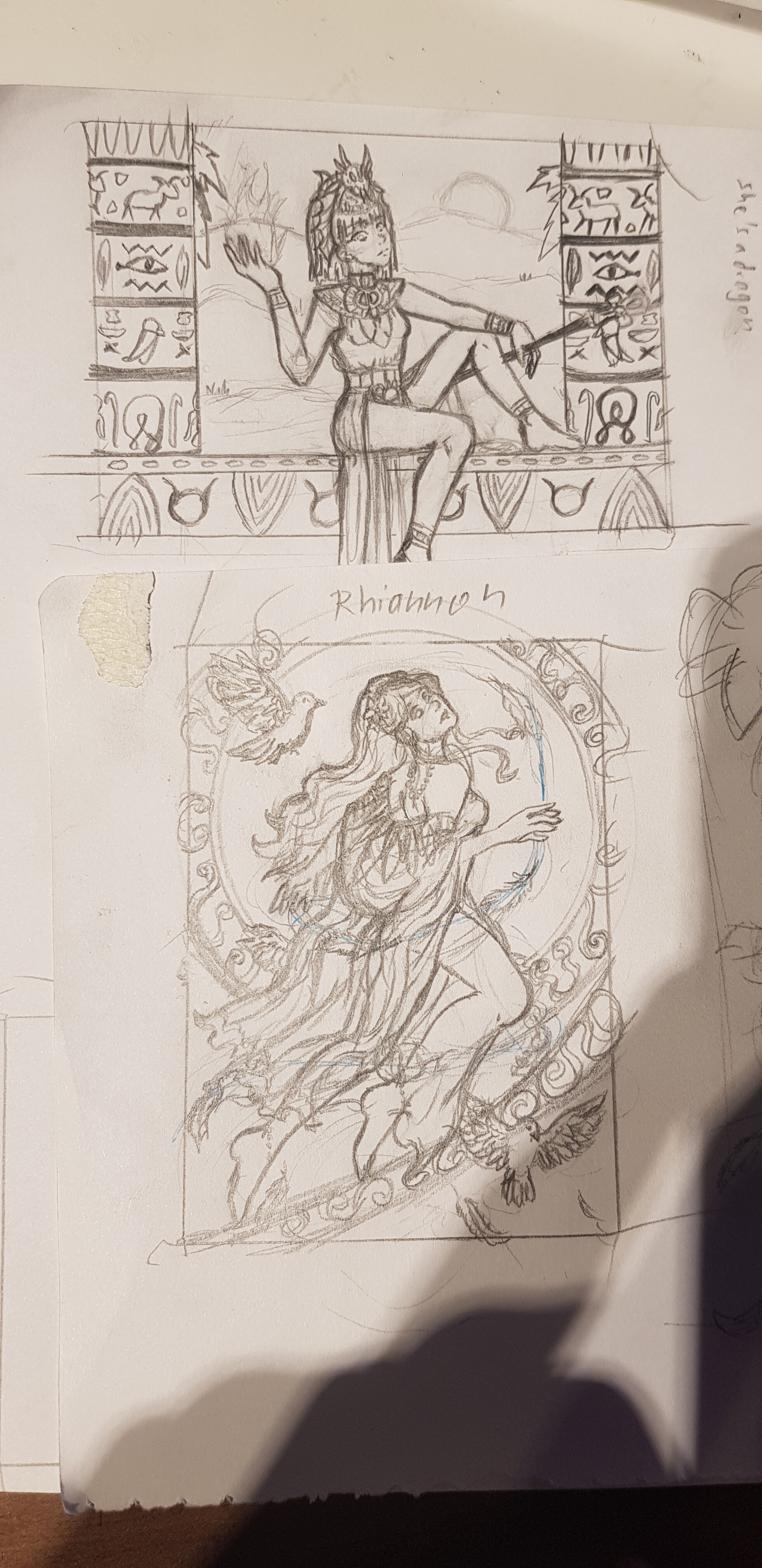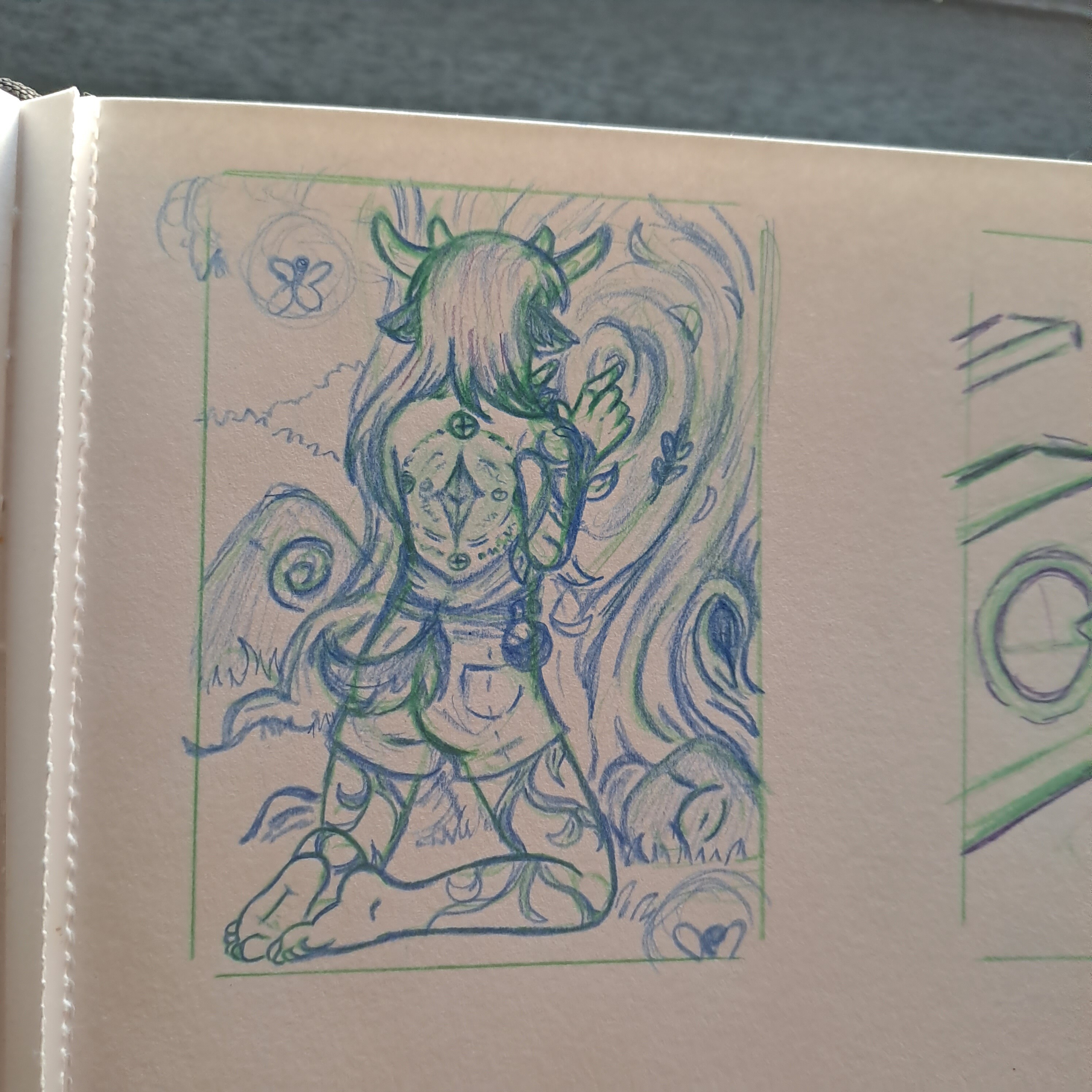 Ich glaube es ist etwas schwer zu sehen, aber bei der unteren Skizze habe ich, da wo die blaue Linie ist, geplant Windmagie zu zeichnen, in der Federn schweben.