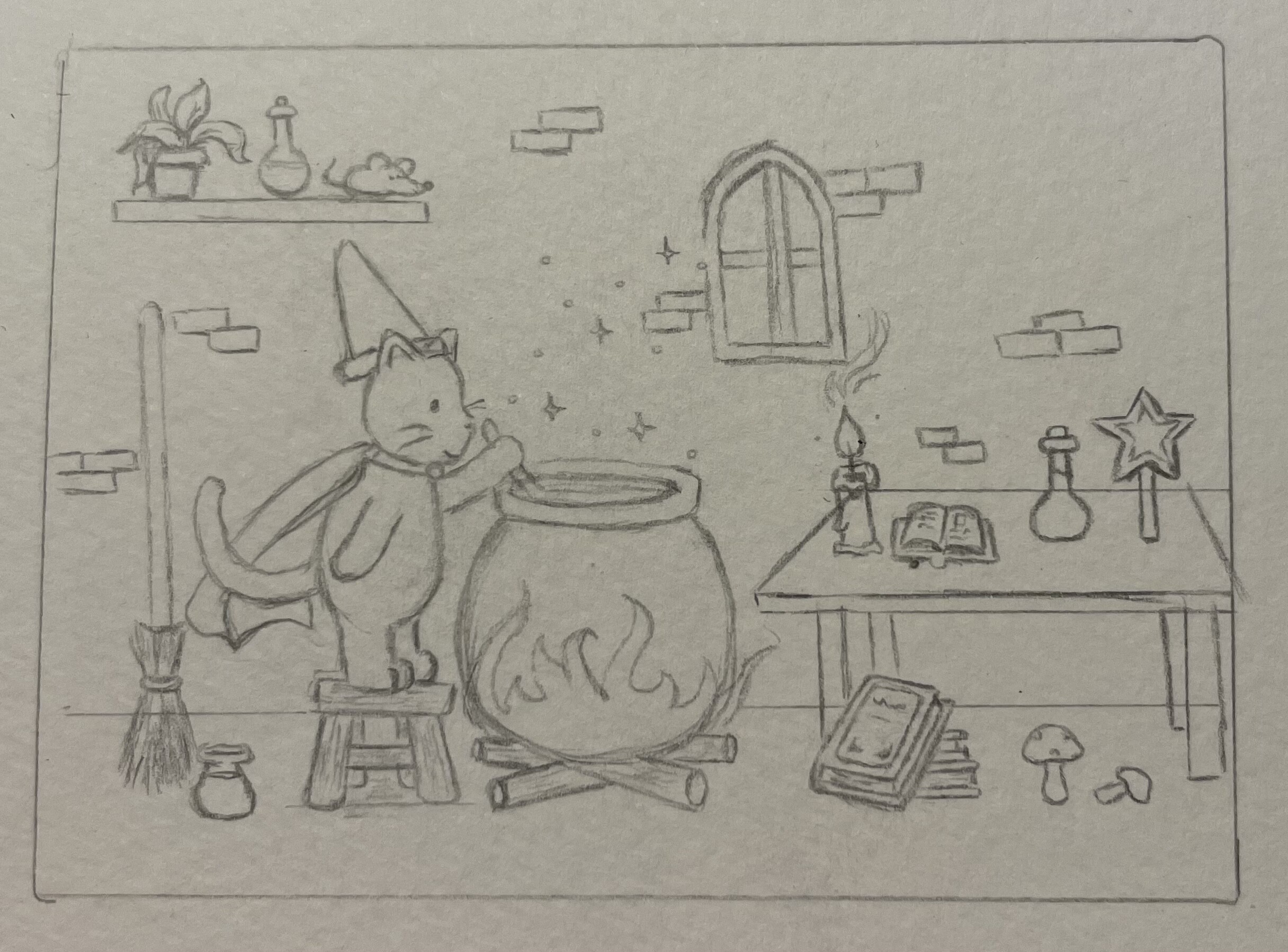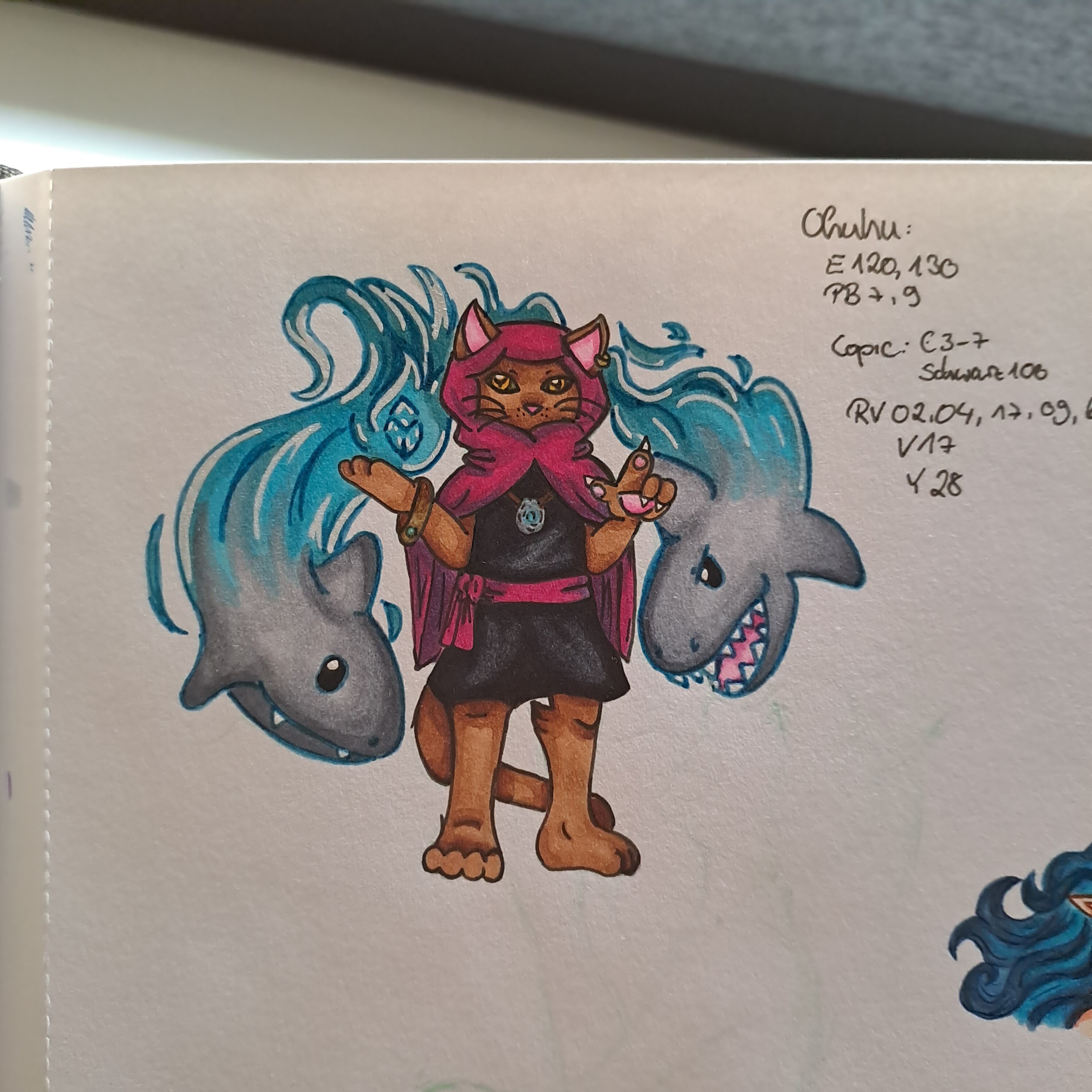 Eine Idee mit einem Katzenmagier der magische Haie beschwört (die Haie sind ein bisschen niedlich geworden ^^)