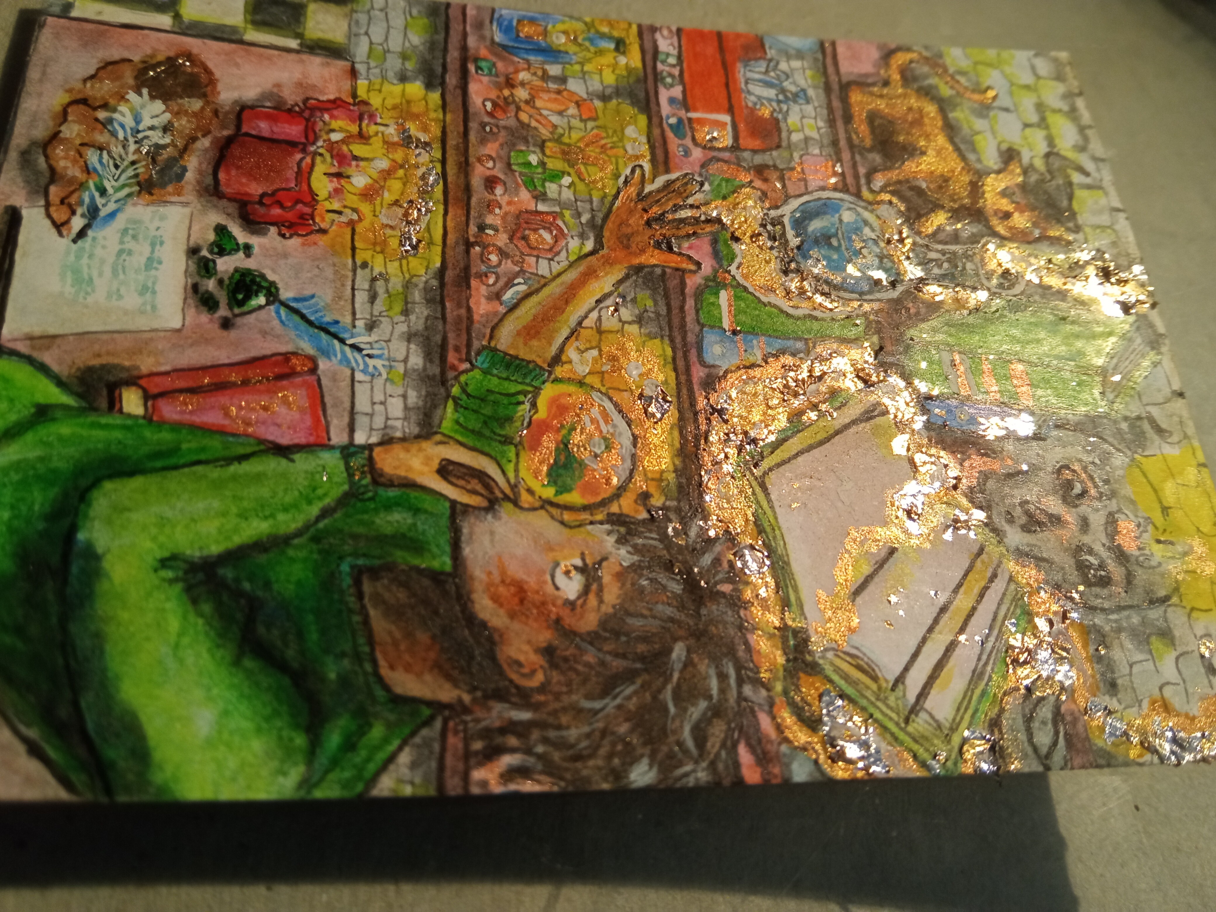 Spannende Idee (: Regale und sowas bieten sich ja immer für detailreiche Hintergründe an. Bei dem vorderen Arm würde ich nochmal schauen, weil der im Vergleich zum hinteren Arm sehr dick erscheint. Und ich würde die Schreibtischplatte etwas weniger tief zeichnen, sonst sieht der Schreibtisch sehr riesig aus.