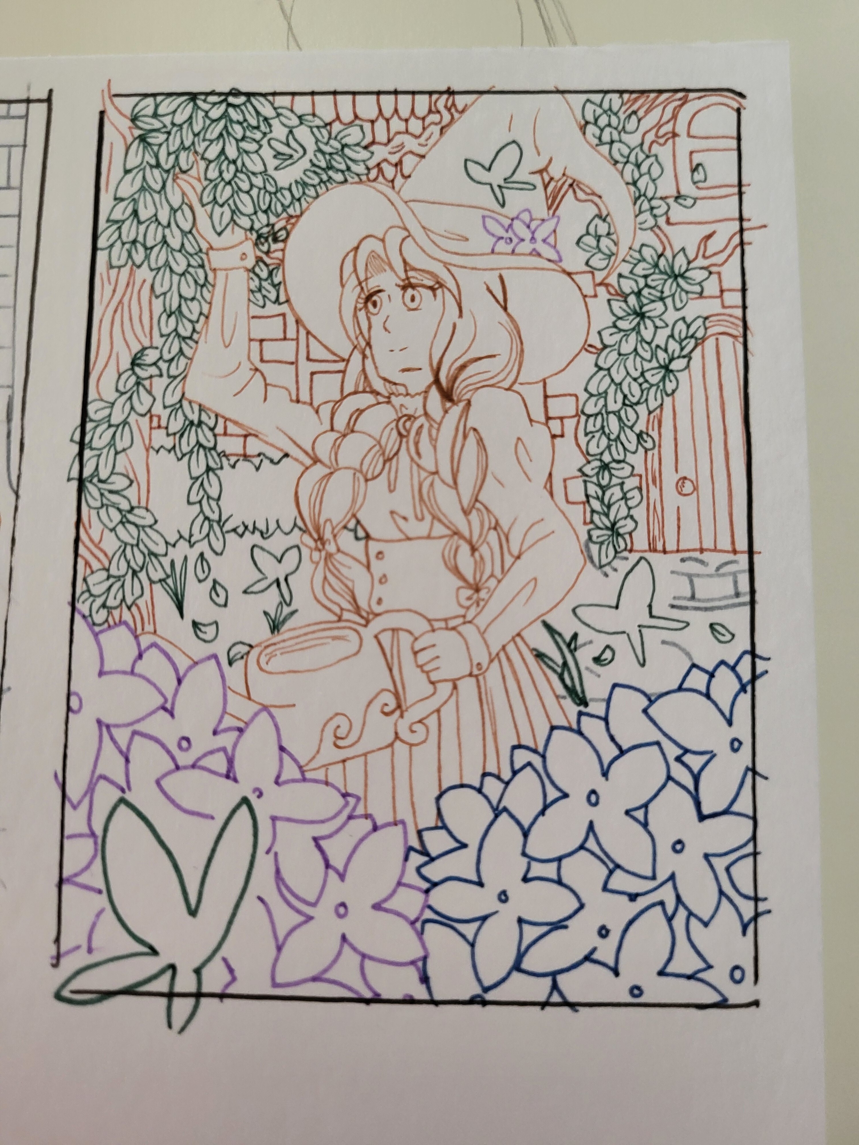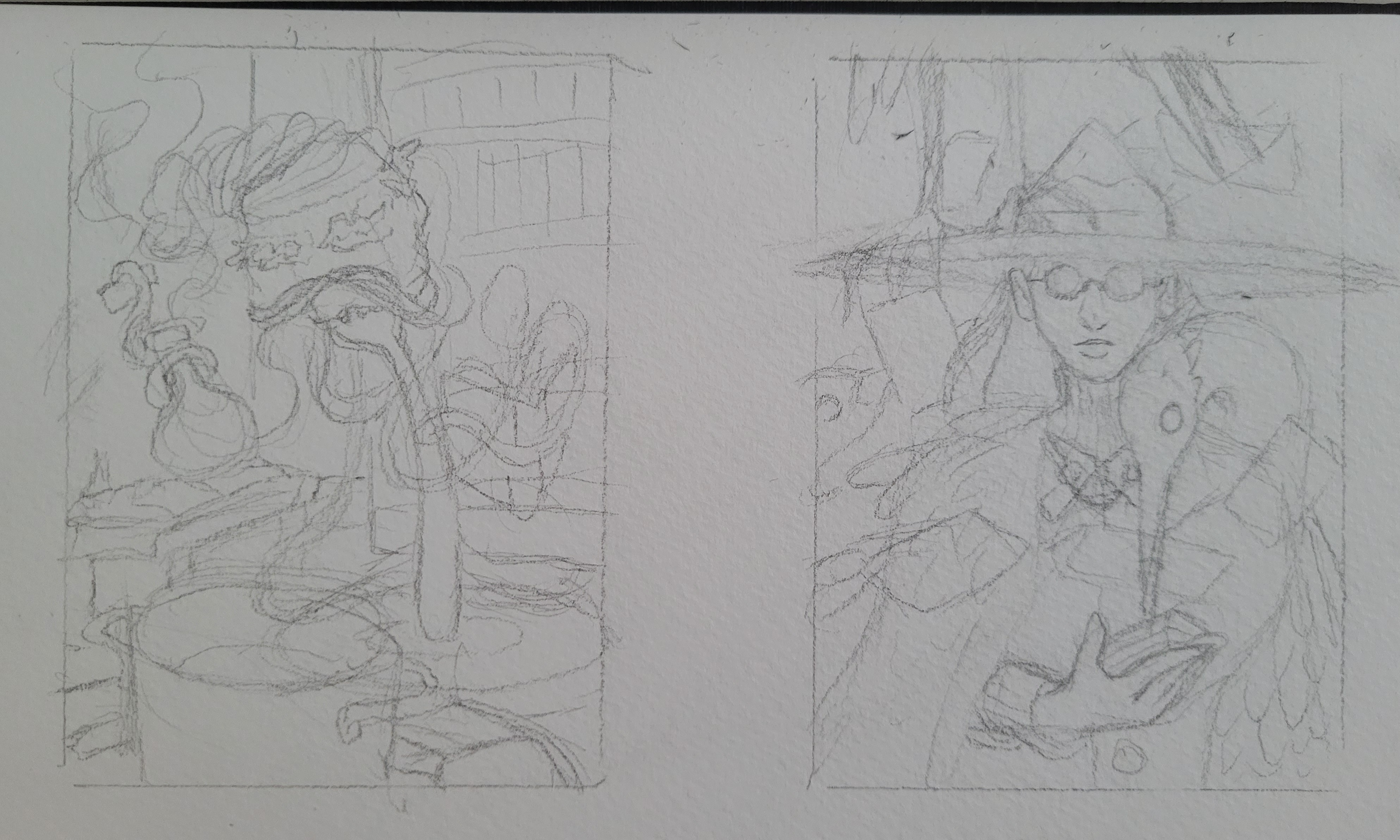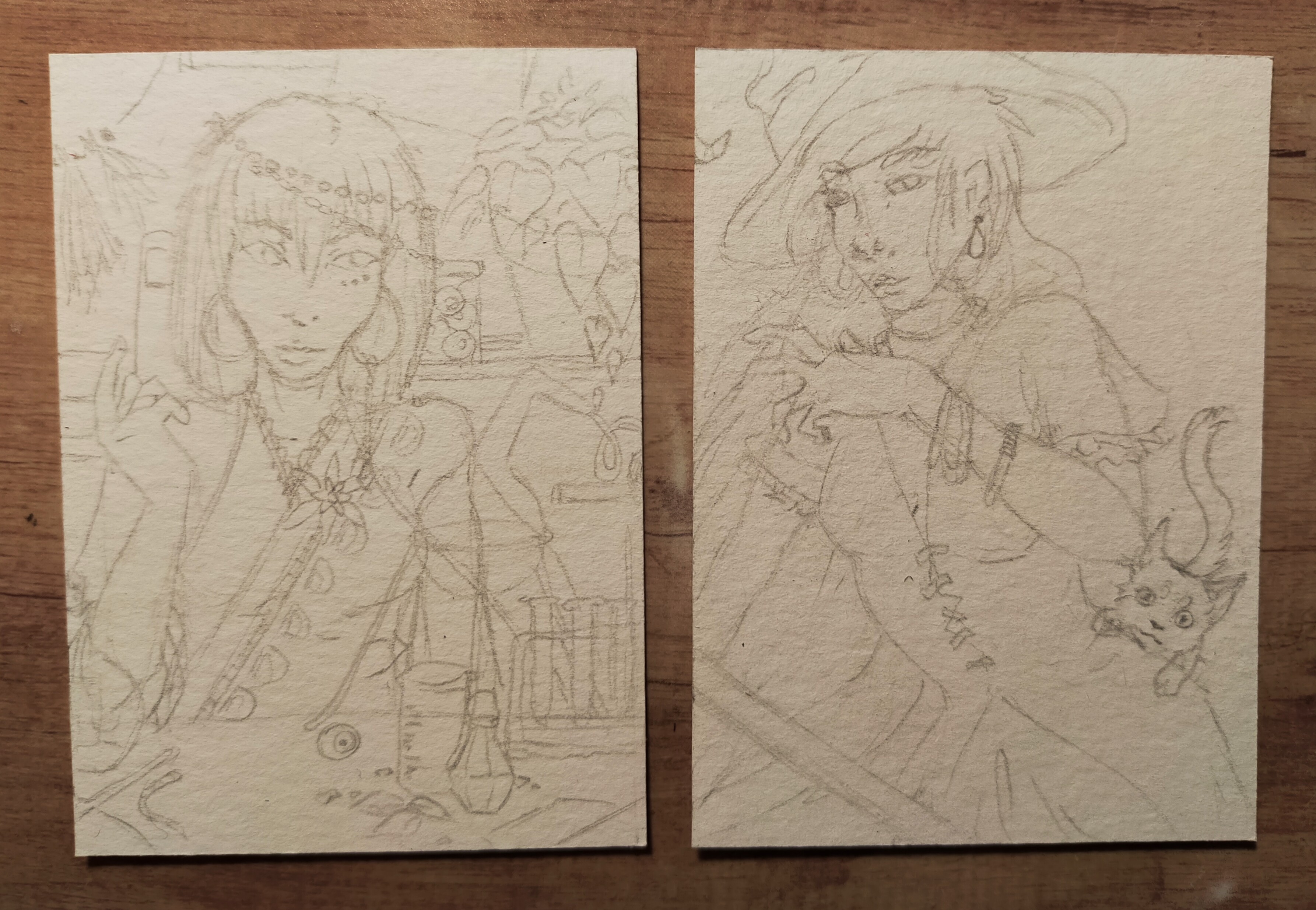 ich habe auch zwei Skizzen soweot vorbereitet das man hoffentlich erkennt was ich vorhabe: einmal rechts die Tarot-Karten-Legerin mit ihren Kranich-Familiars und links (falls der okay ist xD) ein Spagetti-Meatball-Hexenmeister beim Zaubertrank brauen.