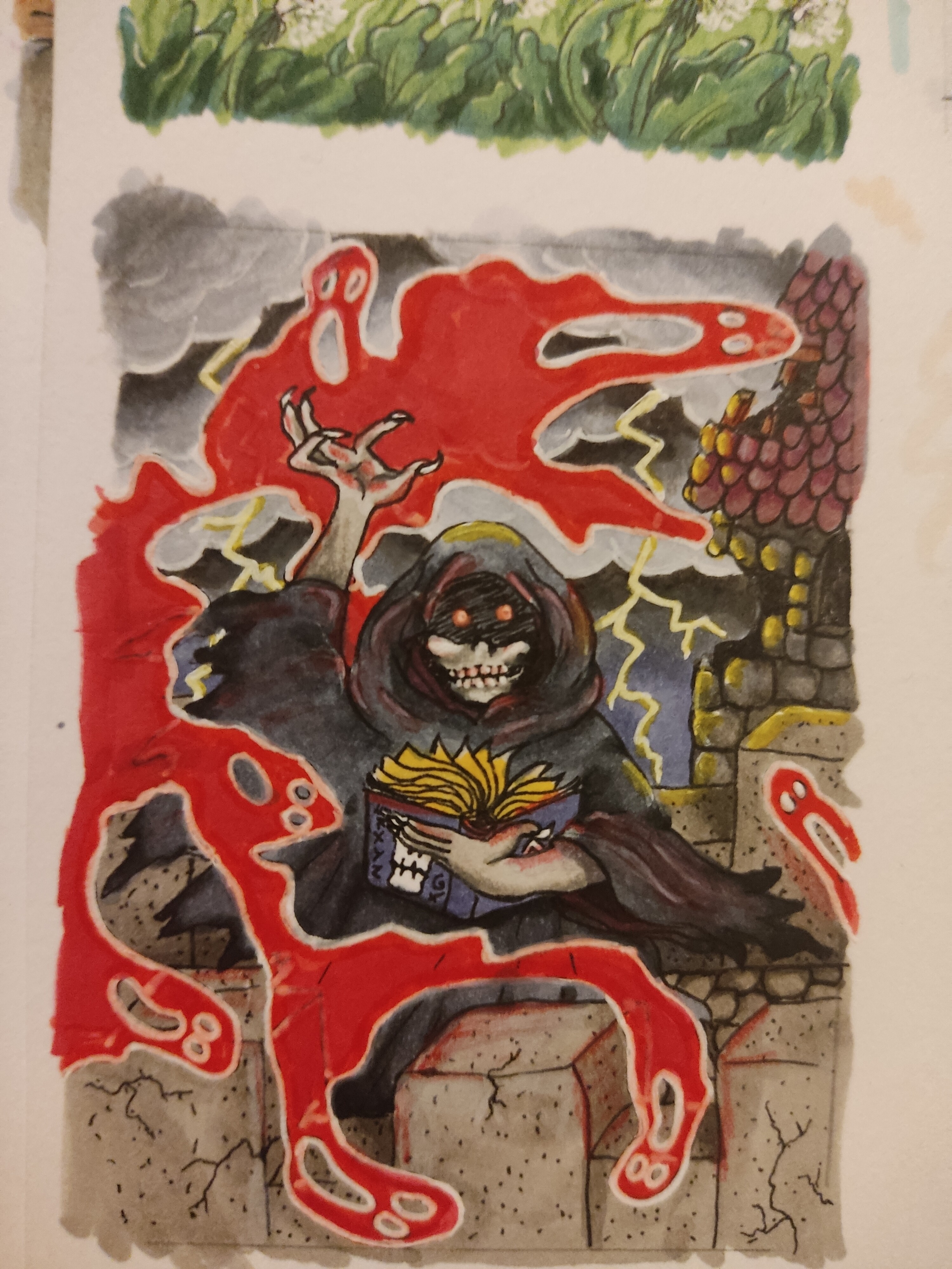 Coole Karten, die erste kannst du gerne schon einreichen! Bei dem Nekromanten würde ich die Robe (dunkel)grau bis schwarz machen. Würde glaube ich am wenigsten von den roten Geistern und Augen ablenken (:
