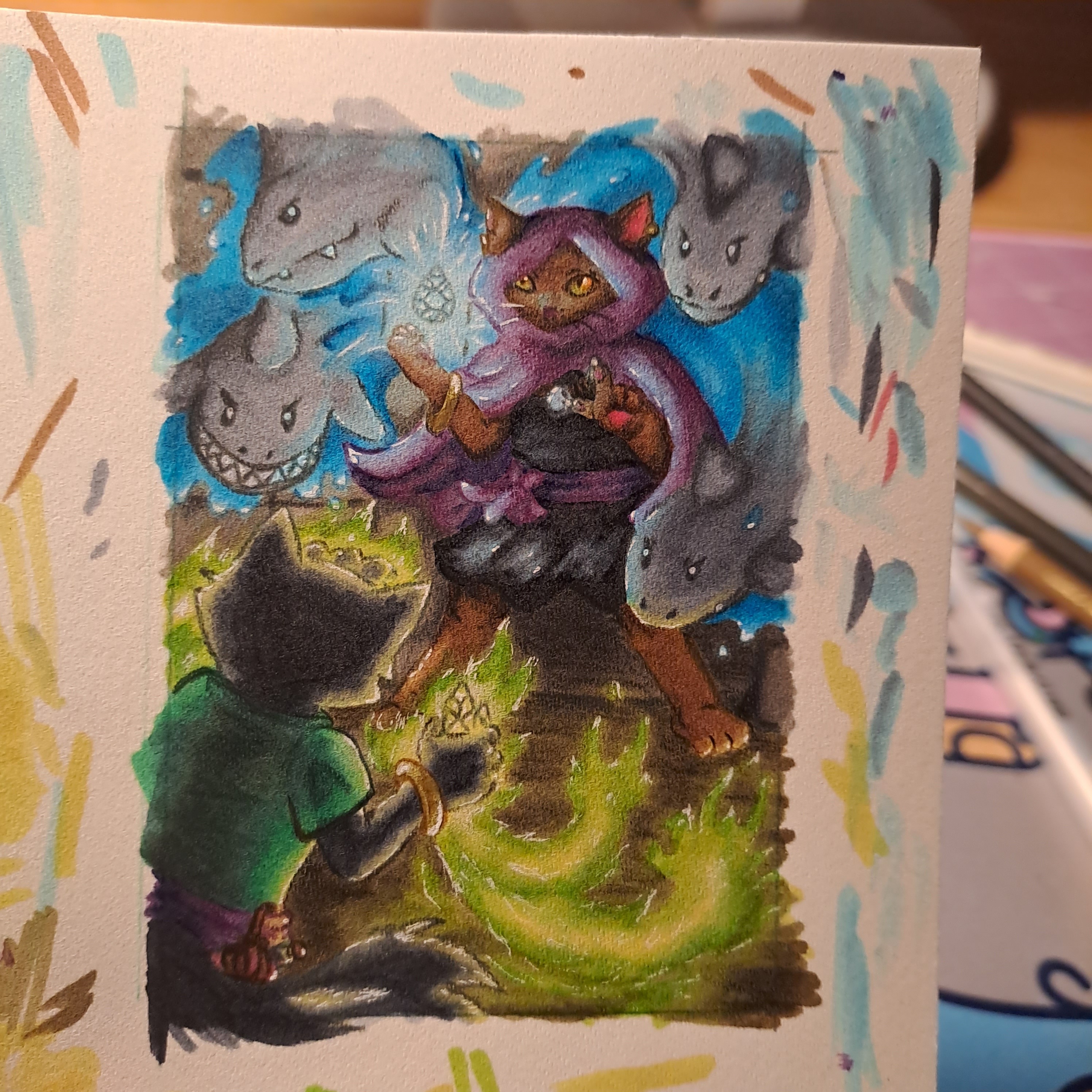 So… ich hab meine Magier Katzen nochmal komplett neu gemalt, ich hab netterweise ganz viele Tipps bekommen und einen Vorschlag für einen besseren Bildaufbau, den ich gerne umsetzen wollte. Licht ist grade nicht perfekt. Scan kommt Montag ^^