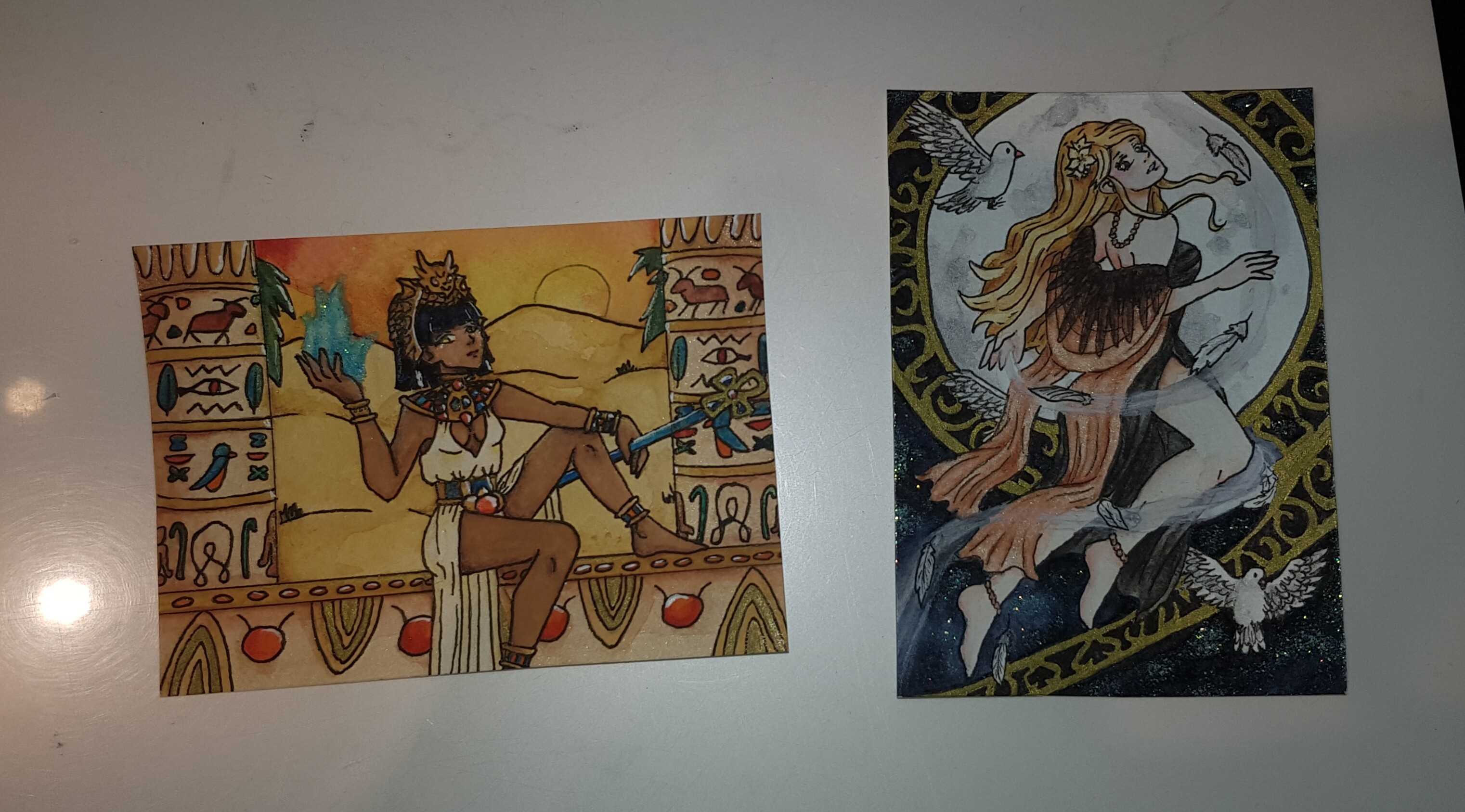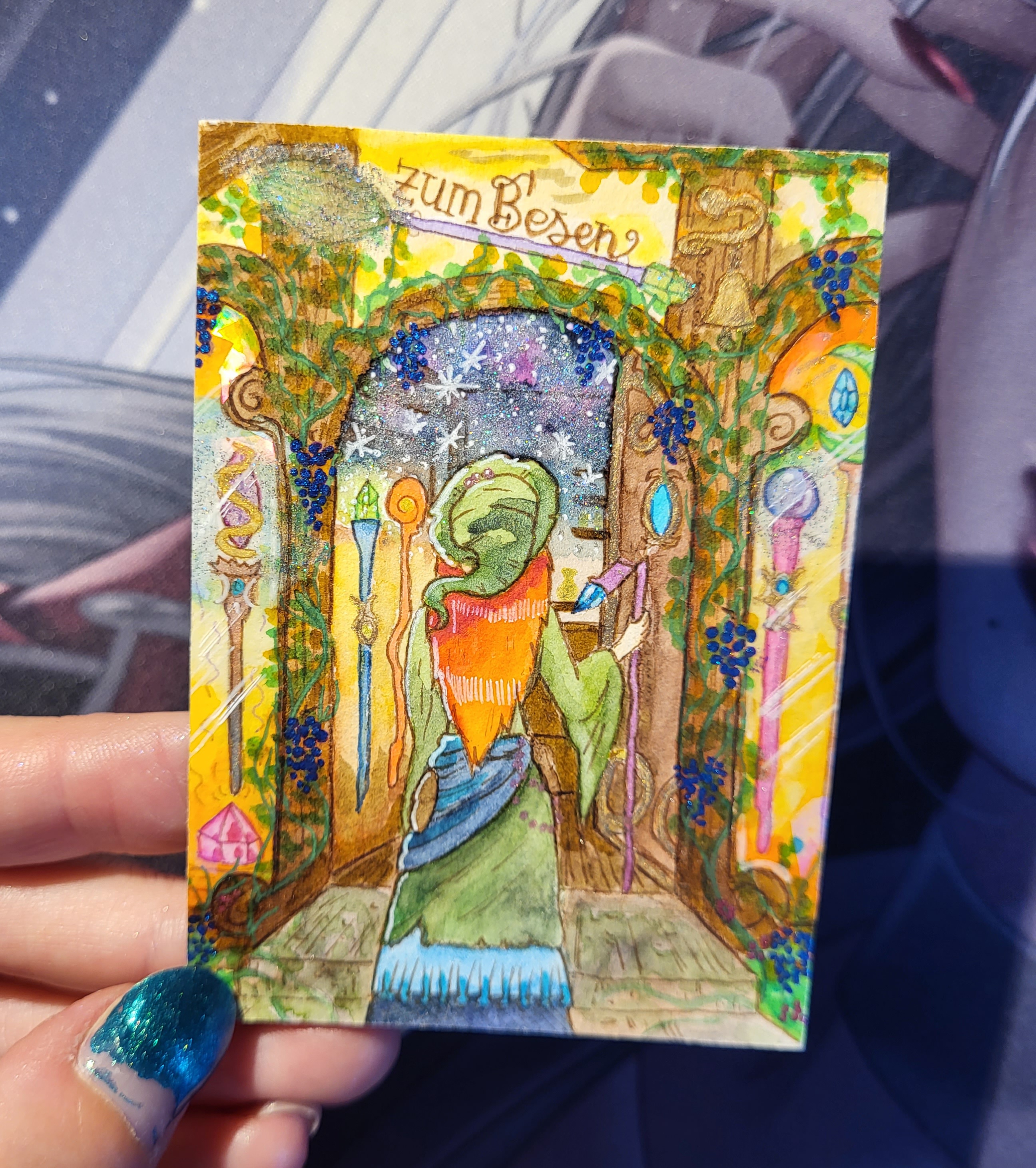 Habe meine erste Karte nun fertig gestellt. Ich wollte eigentlich noch die Skizze vorher zeigen aber so war ich mit der 2 Karte schneller fertig als mit der ersten xD Bei der Karte handelt es sich um mein Oc Jeanny. Sie ist eine Hexe aber auch halb Meerjungfrau. Wenn sie zaubert leuchten ihre Haare auch. Leider kann ich das traditionell nicht so gut darstellen. Aber da hatte ich die Idee ihre Haare glitzern zu lassen, so wirkt es automatisch schon magischer. Sie selbst ist gerade dabei einen Fisch zu verzaubern damit dieser leuchtet.
