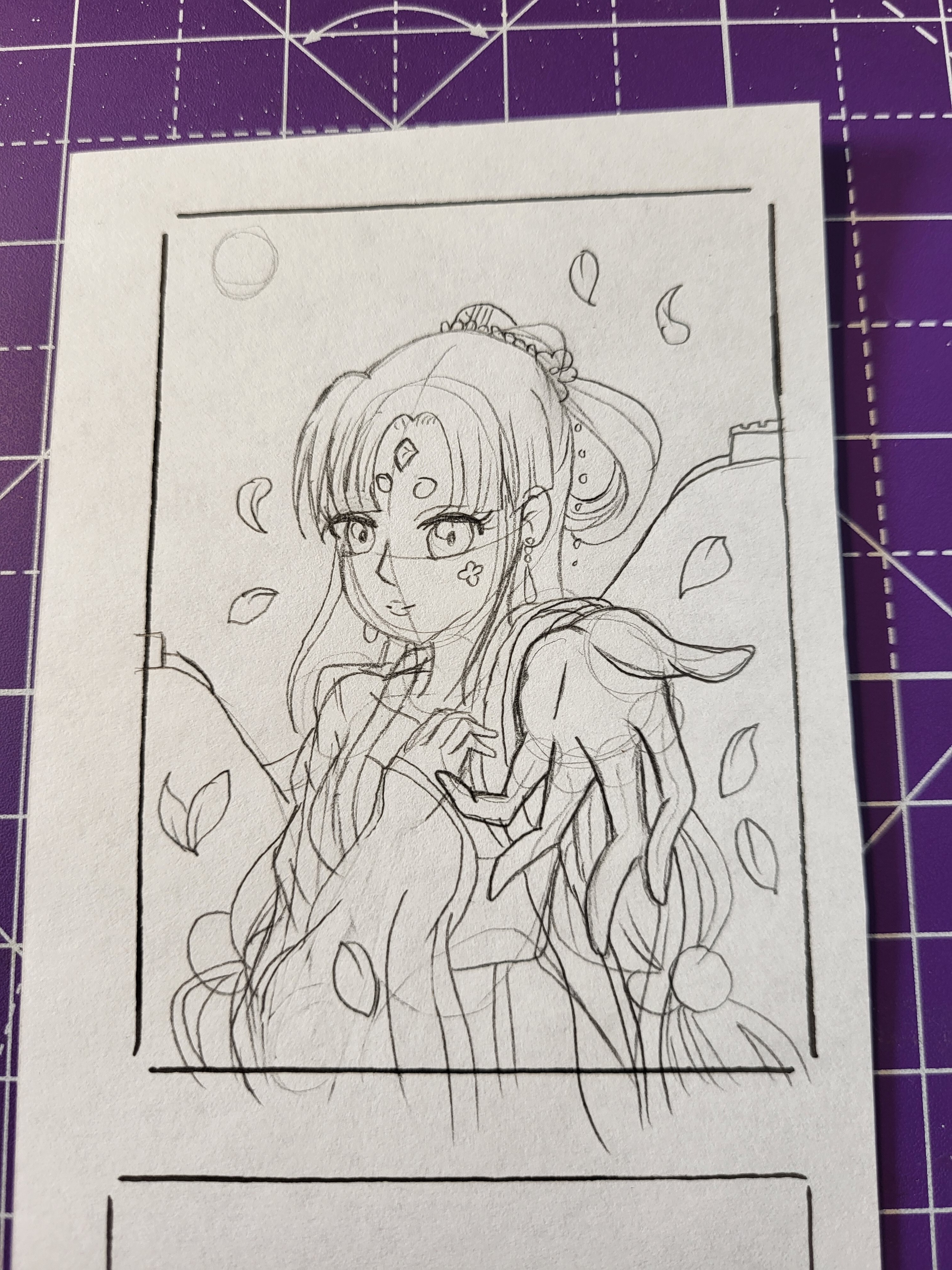Meine vierte Karte, also die Skizzen, habe ich eben beschließen ein chinesische Magierin, die magisches Blüten umhüllt ist und der Hintergrund, zu sehen sind nämlich die chinesische Mauer und Mitternacht befinden. Ich hoffe es passt so weit.