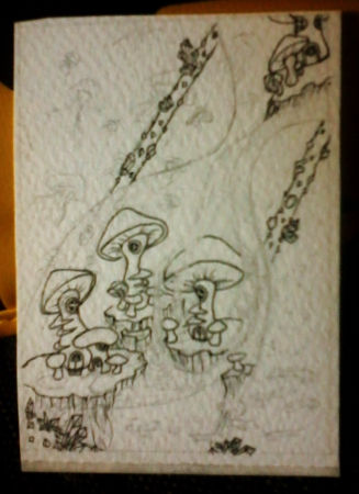 Meine erste Skizze ist fertig: Eine Pilzstadt in einer versunkenen Sanduhr. Im Hintergrund sind Quallen und Fische, leider wegen dem schlechten Foto nicht so gut erkennbar.