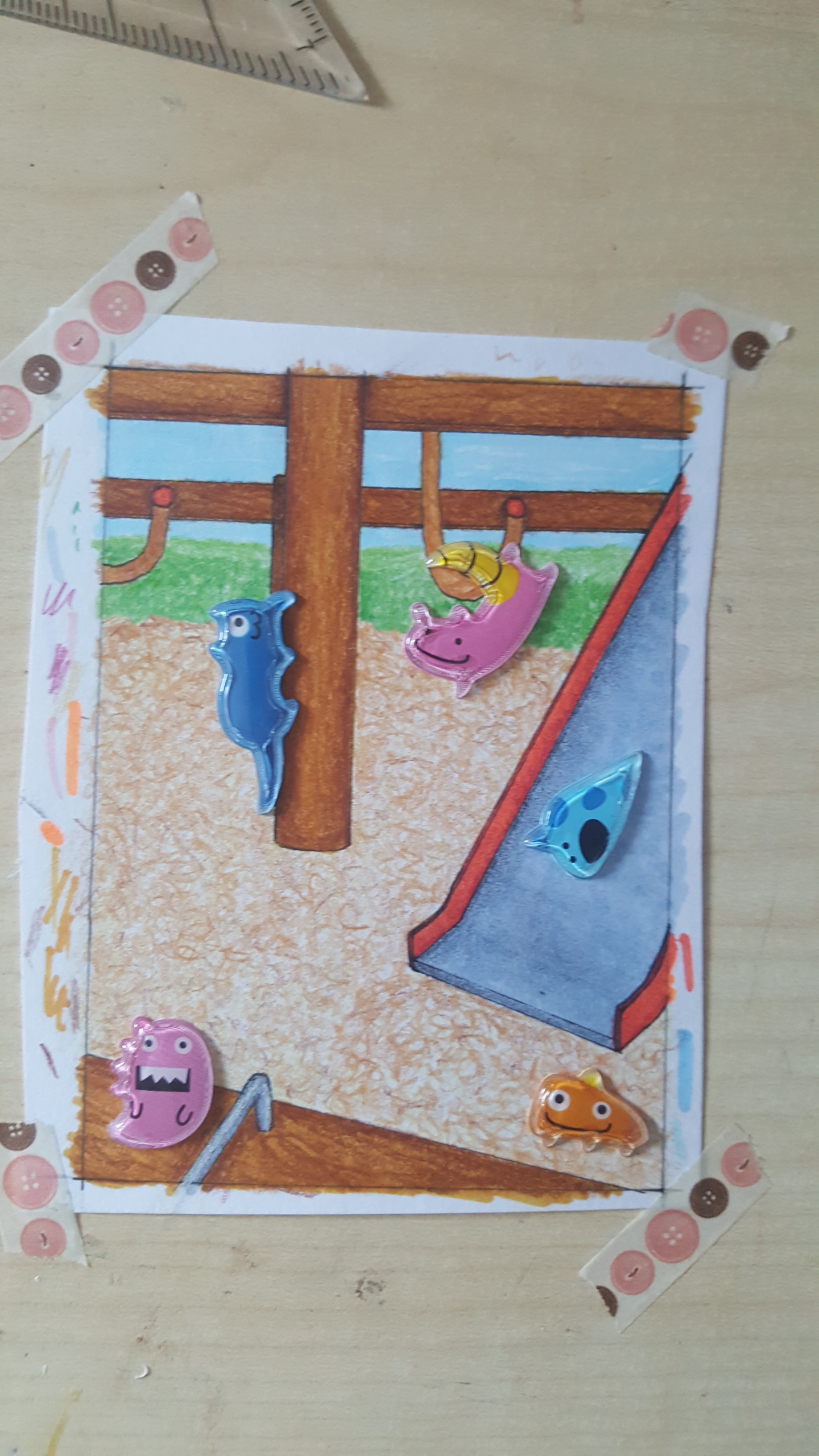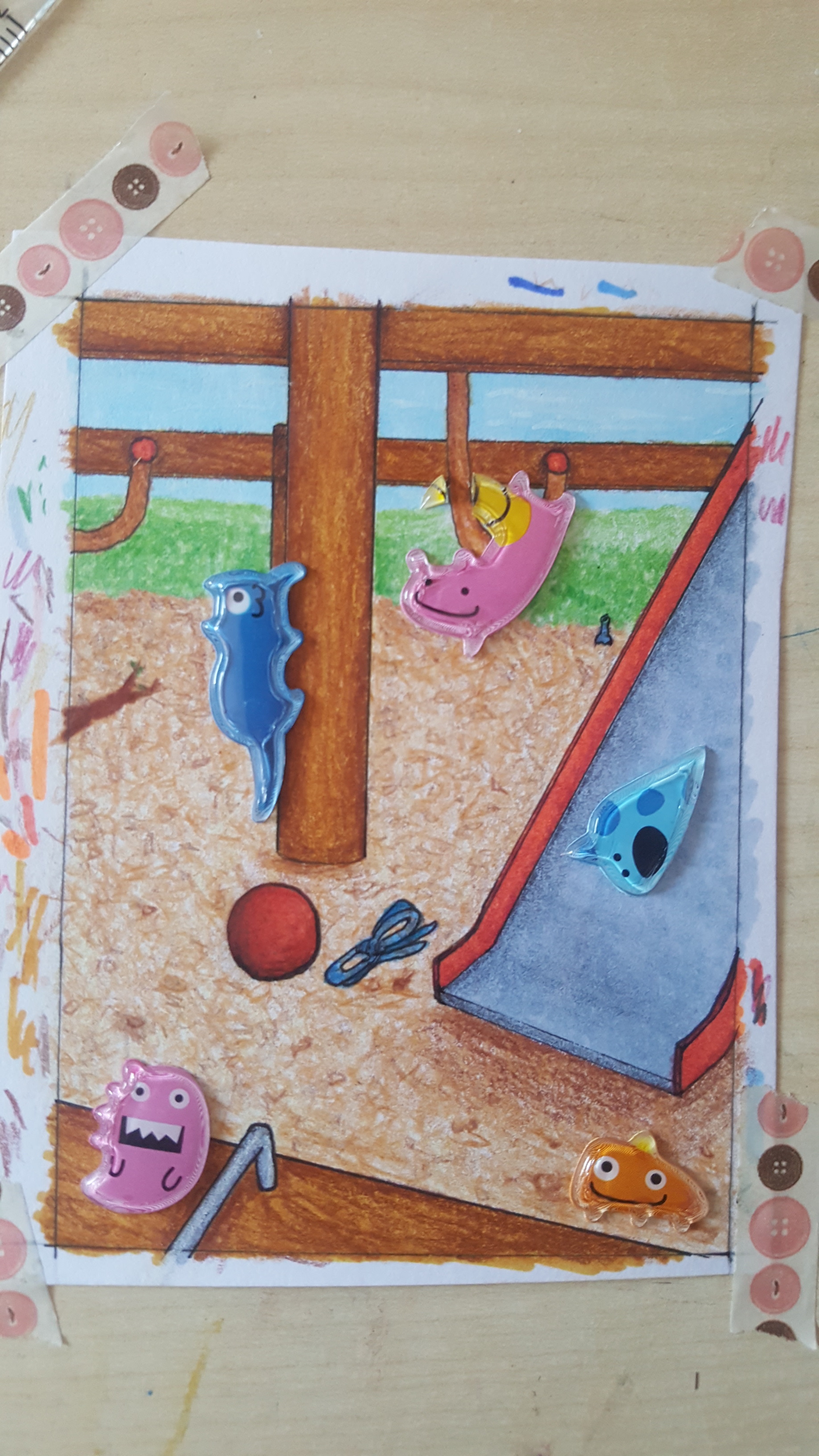 Danke ihr beiden! Nur sollte das gar kein Sand seinâŠSondern diese Holzdinger, die immer unter den KlettergerĂŒsten auf SpielplĂ€tzen liegen ^^â Ich wollte nicht jedes einzeln zeichnen und haba daher versucht anzudeuten. Aber Sand kann das natĂŒrlich auch sein, ich nehme eure Ideen gerne auf und versuche sie umzusetzen.