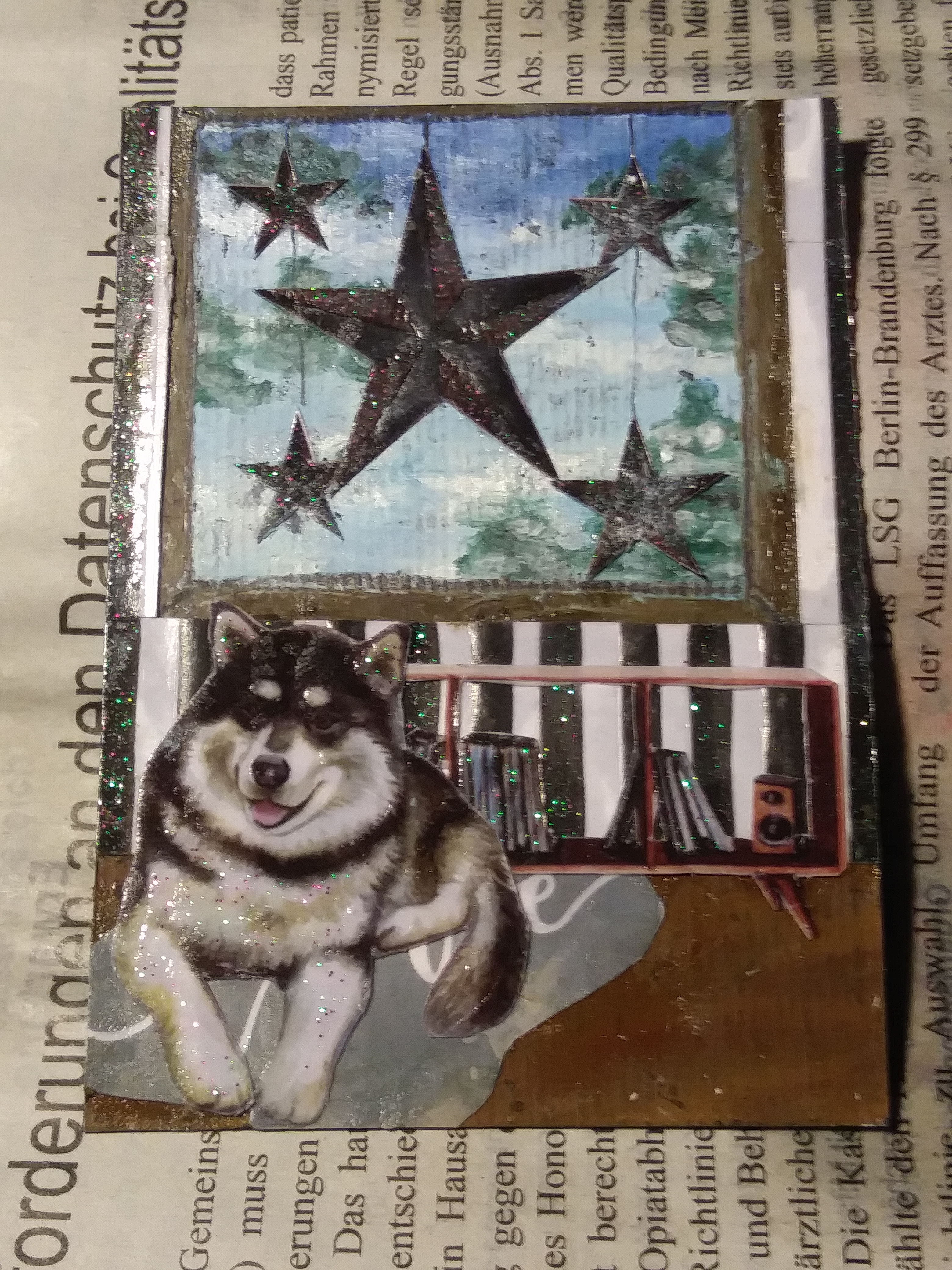 Klar kein Problem :) Beim Hund gemalt ist der Boden, der Fensterrahmen, der Hintergrund im Fenster und die SchnĂŒre fĂŒr die Sterne der Rest sind verschiedene Sticker.