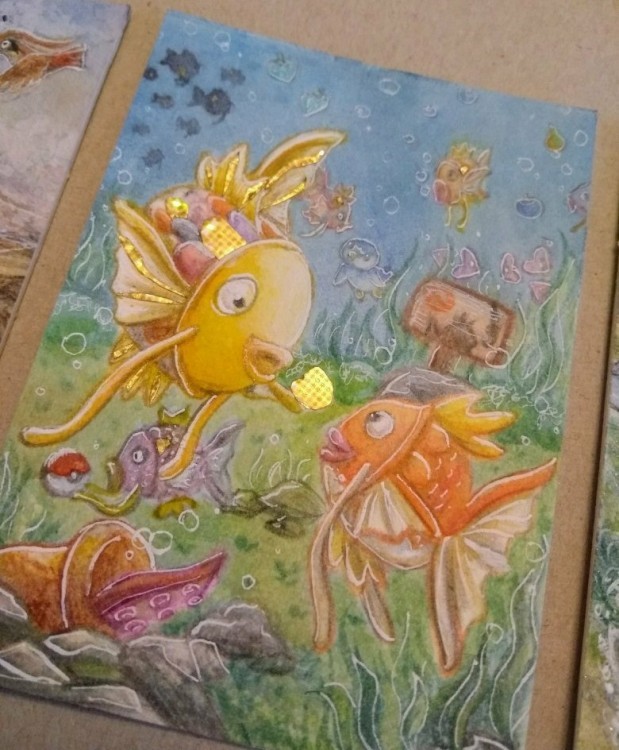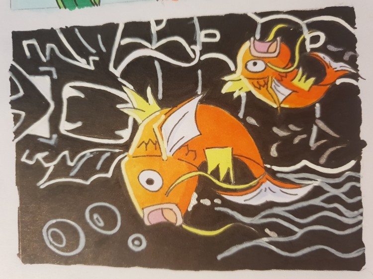 Die zweite Karte kann ich so für die STA leider nicht zulassen. Auch das Hinzufügen von weiteren weißen Lines im Hintergrund ändert nichts daran - zumal du sagst, dir gefällt deine Karte so, wie sie ist und ich niemanden zwingen werde Karten, die man mag, zu verändern. Wenn du bei dem Konzept für eine neue Karte bleiben möchtest, dass die Karpador sich vor Garados erschrecken, kann ich dir nur empfehlen wirklich mit harten Kontrasten zu arbeiten, starke Schatten und starkes Licht zu verwenden, vielleicht ein bisschen wie hier: https://i1.wp.com/blog.neuromag.net/wp-content/uploads/2016/09/deep-sea-fish.jpg?fit=500%2C331