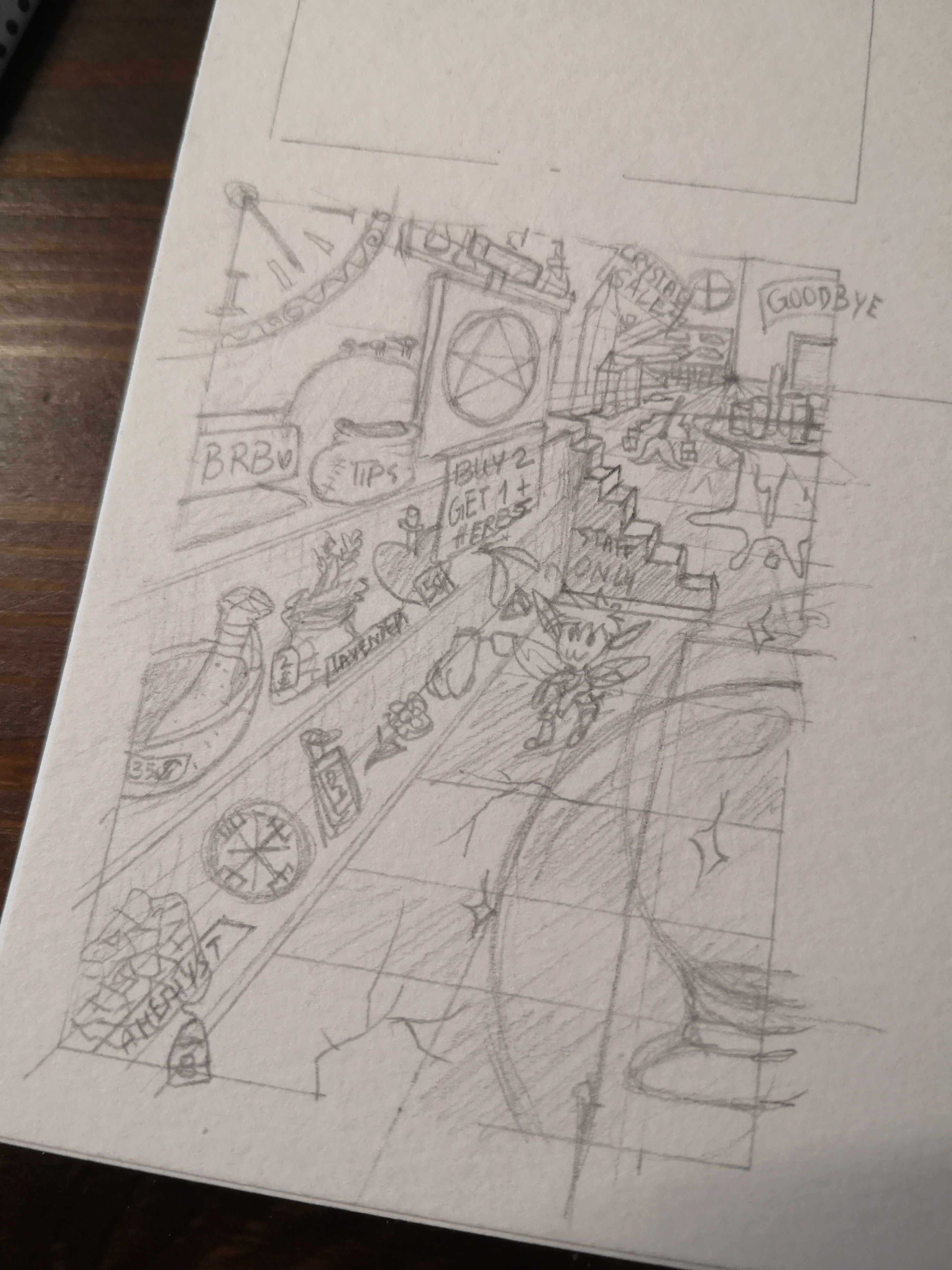 Also ich war heute auch motiviert und habe mal eine Skizze angefangen. Meine erste Idee war ein Laden, der Bedarf für Rituale verkauft (quasi ein Gemischtwarenladen). Der Ladenhüter ist ein Pixie, daher ist die Ladentheke auch etwas niedriger als normal. Ich hoffe ich verzettel mich nicht mit den kleinen Fitzeldetails, aber mit den Lines sollte das ja dann etwas klarer werden. Hoffentlich …