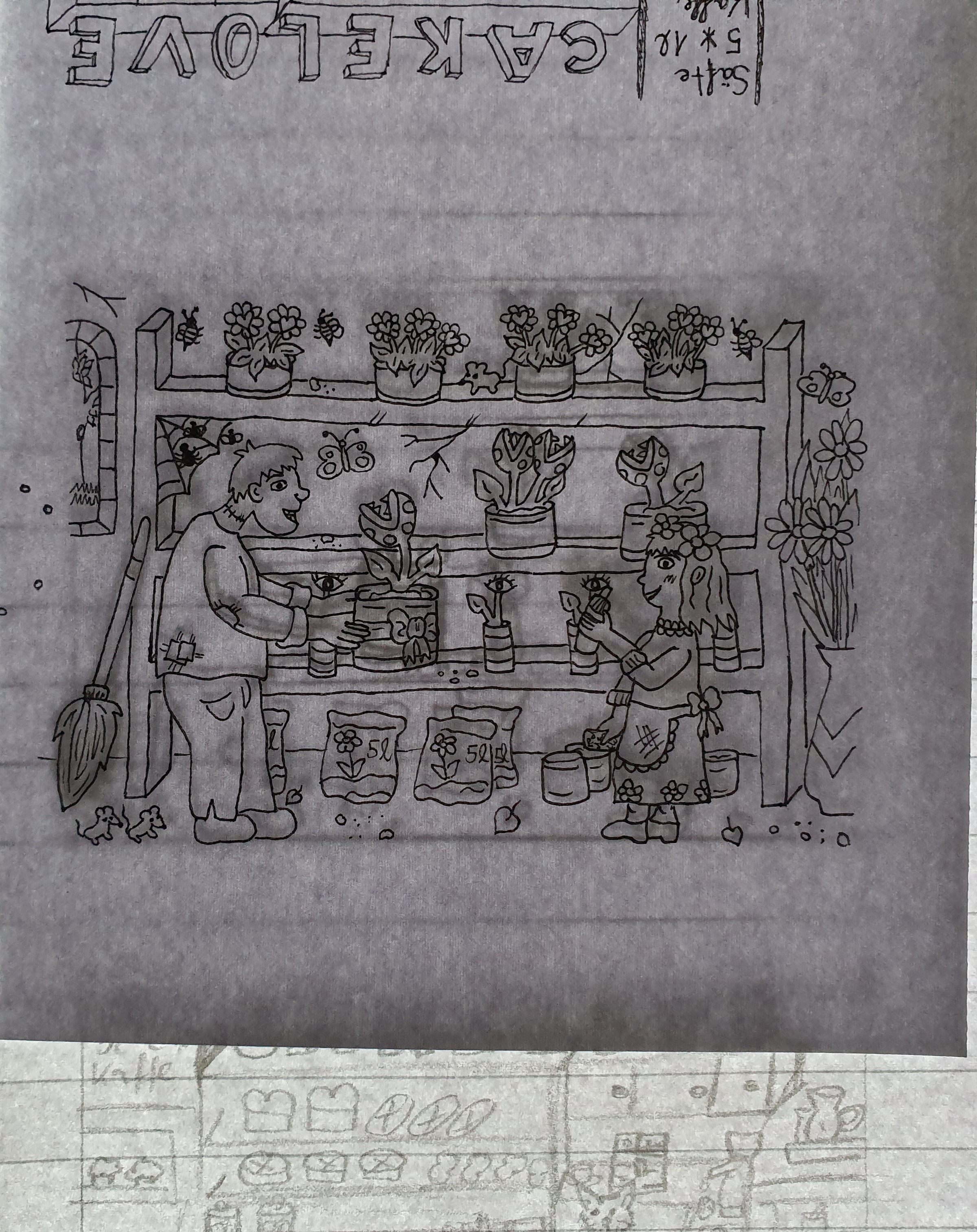 Ich hatte für den Teeladen überlegt vielleicht Feen oder nette Geister in der Luft zu platzieren oder ganz oben auf den Regalen, bisher war das die Karte, die noch ein wenig mehr Ausarbeitung brauchte (ich war nur schon heilfroh, dass ich diese eigenartige Perspektive halbwegs hinbekommen hatte)