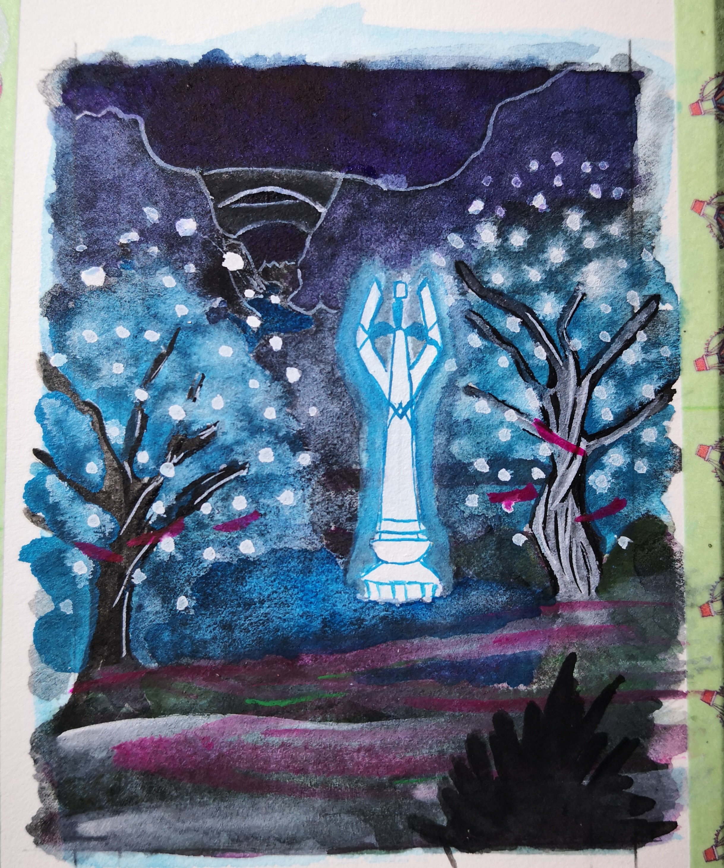 Oder am Ende mit einem Mix aus Weiß und einer entsprechenden Farben das Leuchten verstärken (oder Gouache - dein Weiß deckt prima über schwarz daher nehm ich mal dreist an das ist Gouache oder Mega-Deckweiß) Da heißt es dann aber wieder aufpassen das man das Leuchten nicht übertreibt.