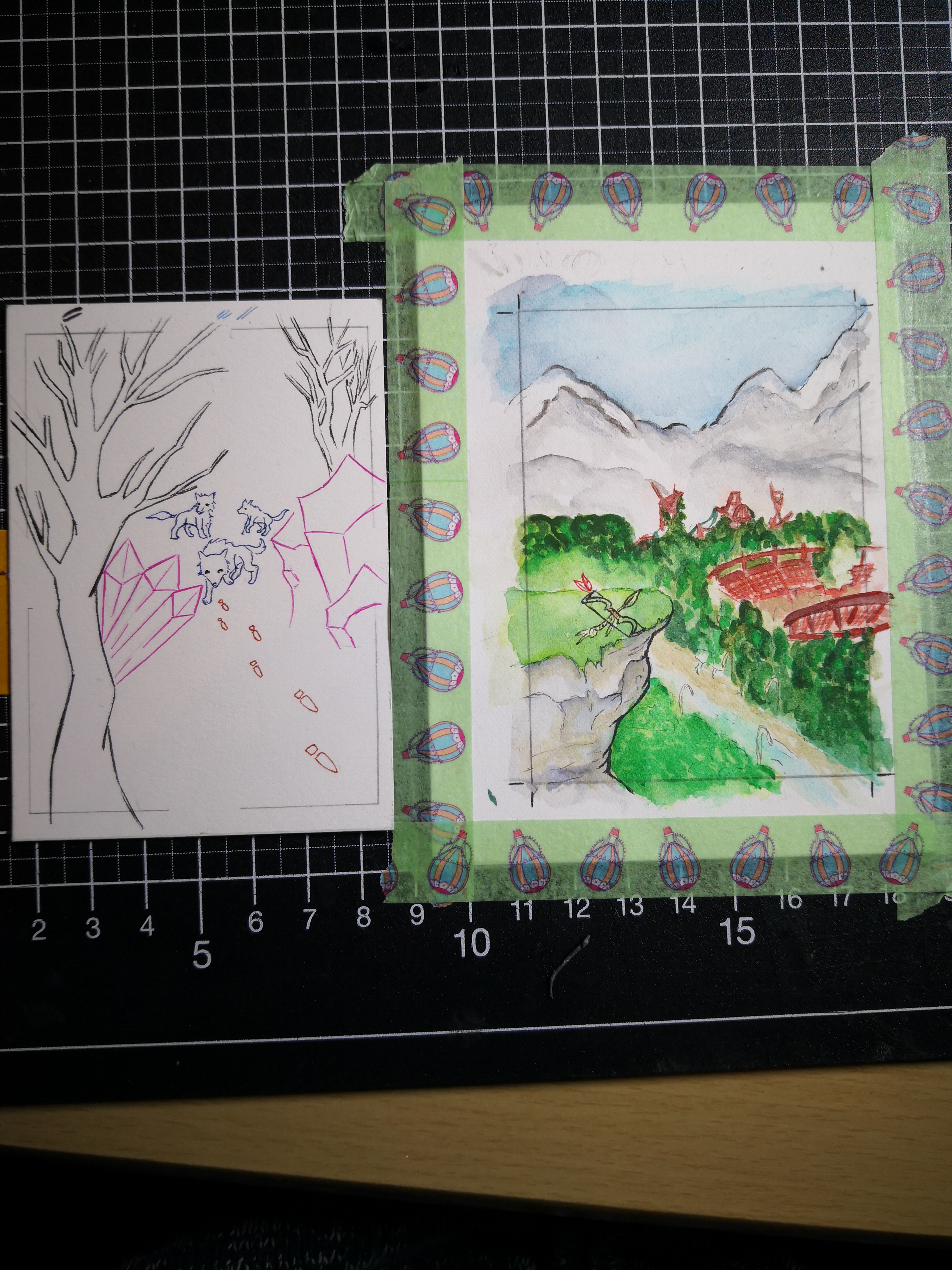 Habe jetzt auch der Skizze eine erste Schicht Farbe verpasst. Wäre das erste Level aus Spyro 2, Glimmer. Ich hoffe, die Charaktere sind nicht zu groß/präsent auf der Karte? Ansonsten kann ich sie noch überpinseln, ist ja zum Glück Gouache :)