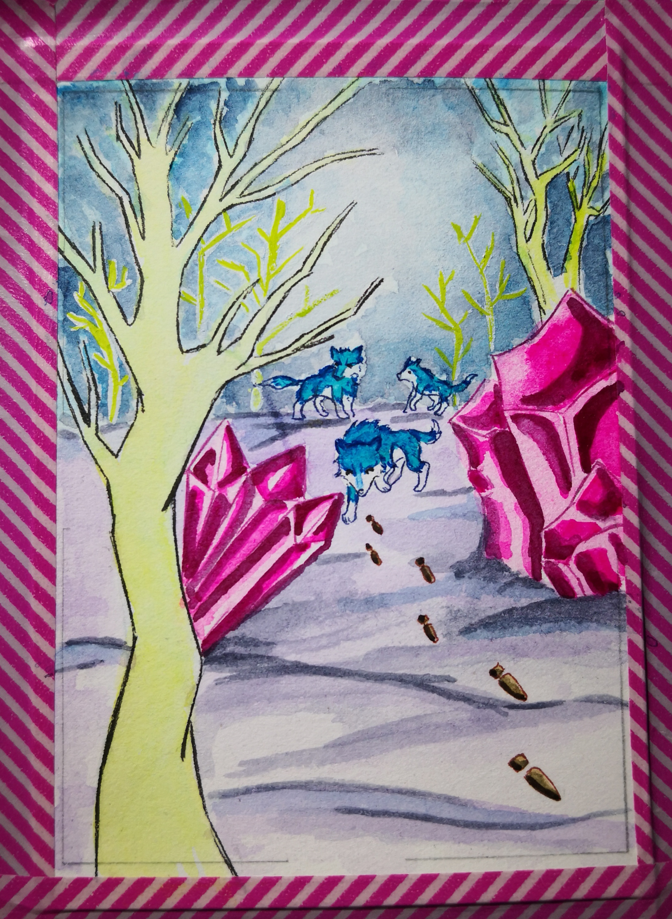 Mir ist mit meiner 3. Karte was ganz dummes passiert. Ich habe versehentlich übers Papier gekratzt, als es feucht war. Jetzt hat die Karte einen unschönen Striemen. Ich versuche gerade zu kaschieren, soweit möglich. Aber schaut euch das Bild bisher an. Würde es euch sehr stören, falls ich den nicht ganz weg kriege?