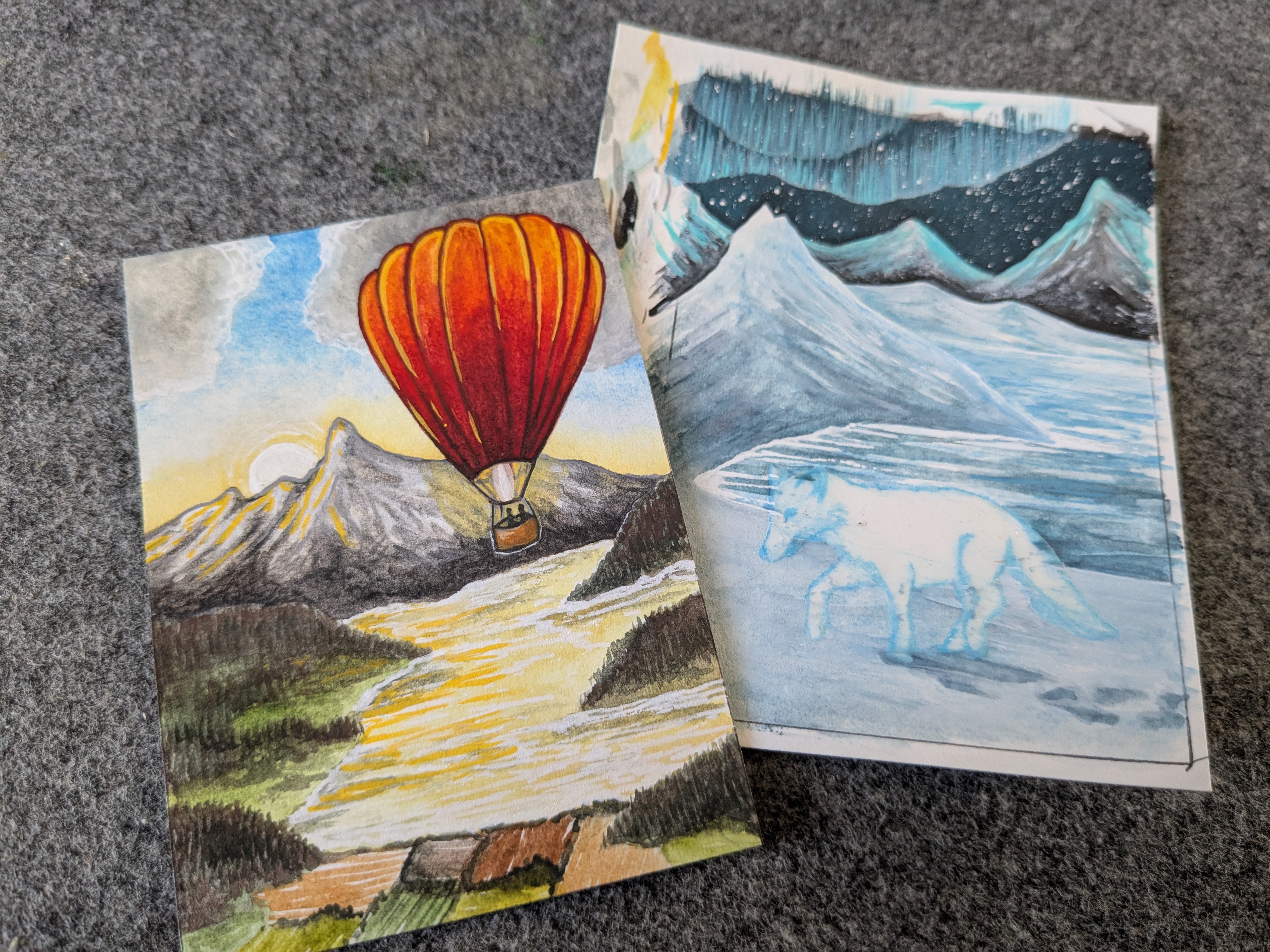 Die Ballon Karte ist fertig, bei der anderen fehlt noch der Feinschliff, Details und Schatten (und der Fuchs, der ist noch unter Rubbelkrepp).