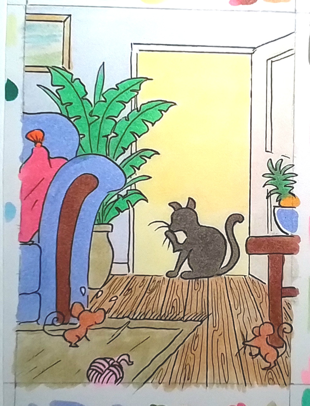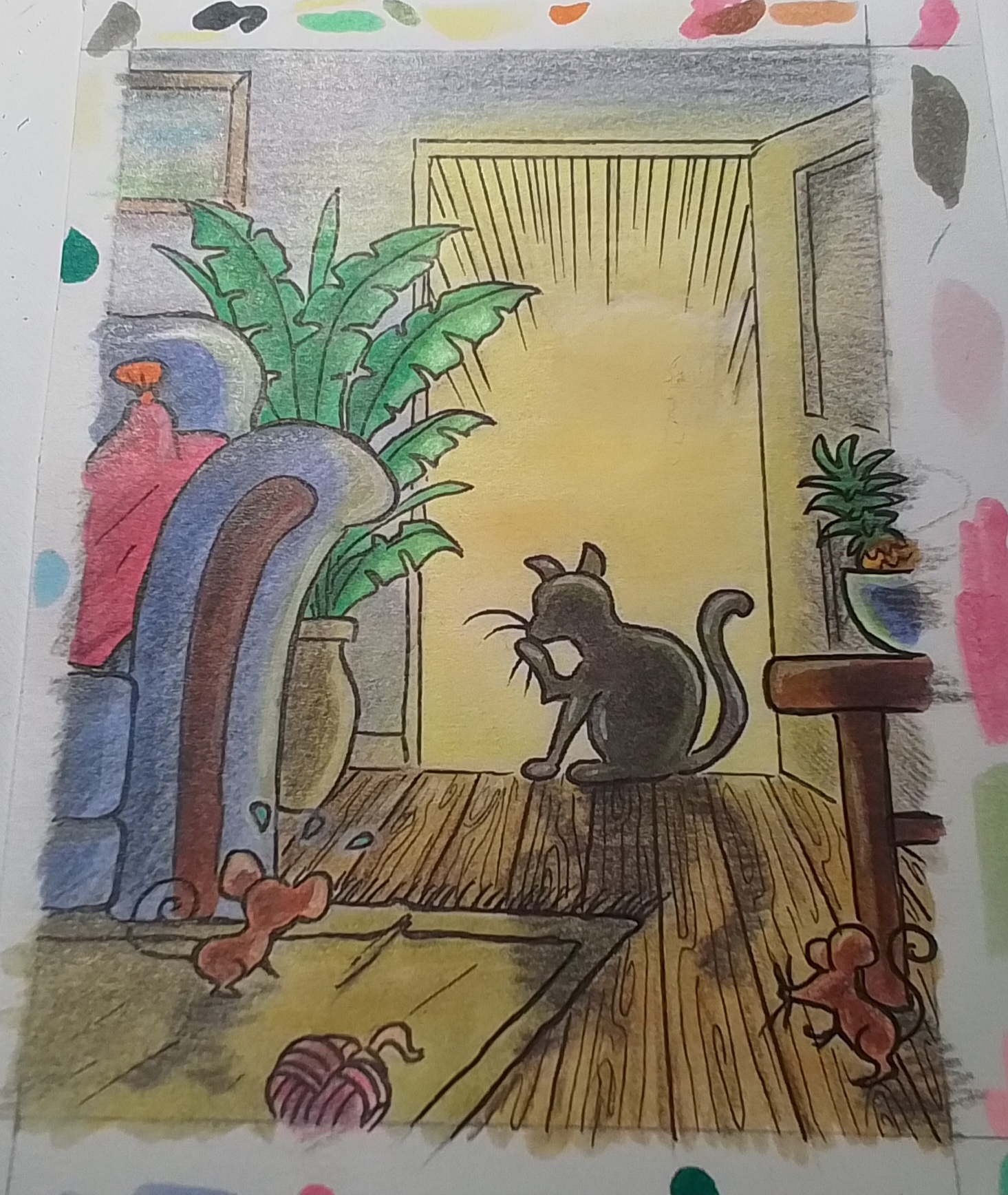 Die erste Farbschicht der zweiten Karte…oben in der Tür im Licht kommen noch so gerade/ schräge Linien hin die zur Katze hindeuten…