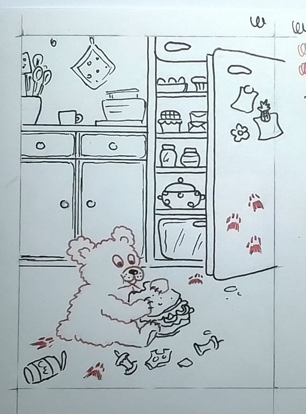 Ich hatte noch eine Idee und hab die Outlines für die erste Karte gemacht, ein kleiner Bär hat sich in eine Küche zum Kühlschrank geschlichen. Ich hoffe, dass es klappt bei der Colo mit dem Kühlschranklicht…