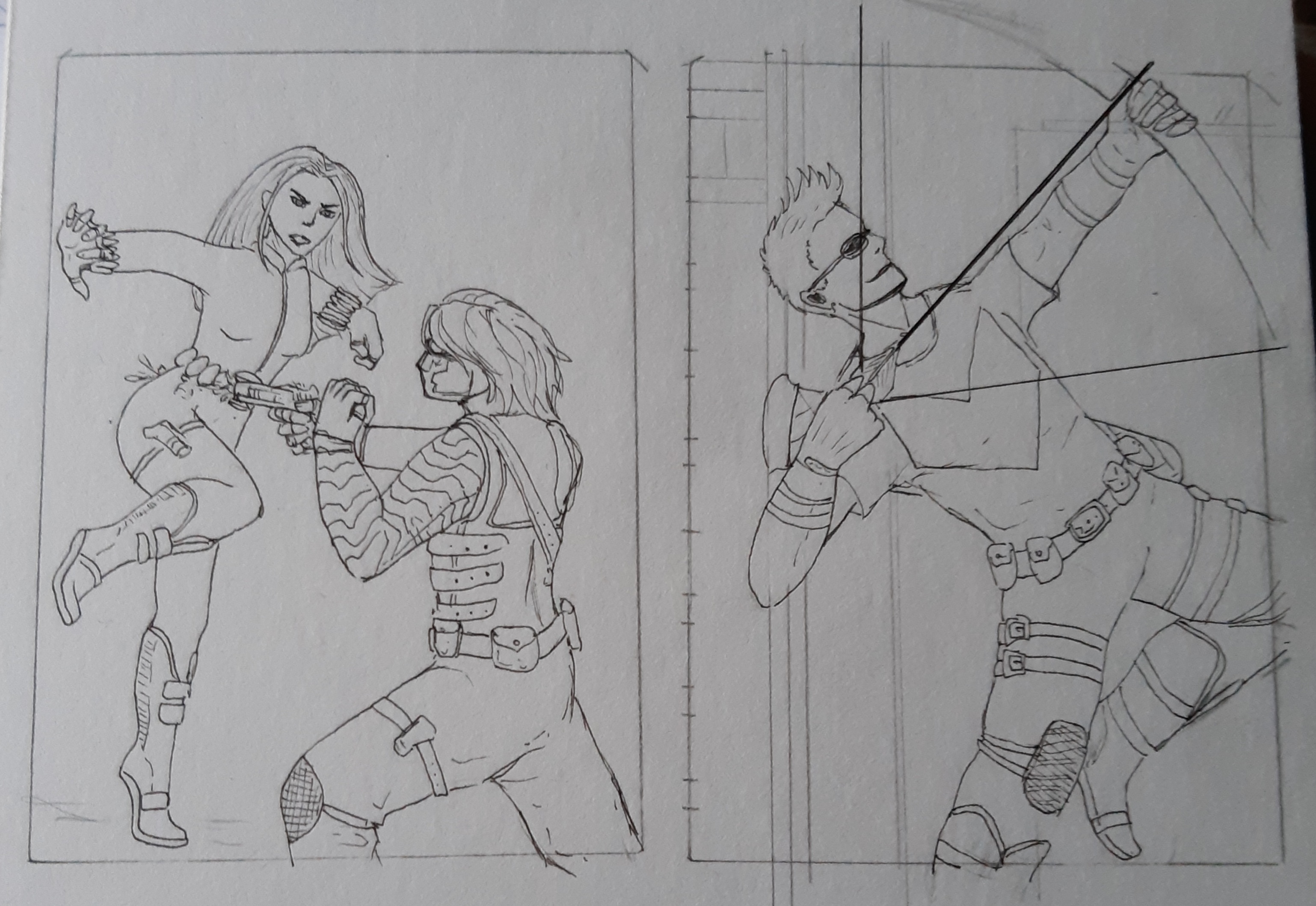 Beim Hintergrund bin ich leider keine hilfe aber bei Hawkeye fehlt ein Finger an der Bogensehne. Ich kann Bogenschießen, daher kenne ich das.