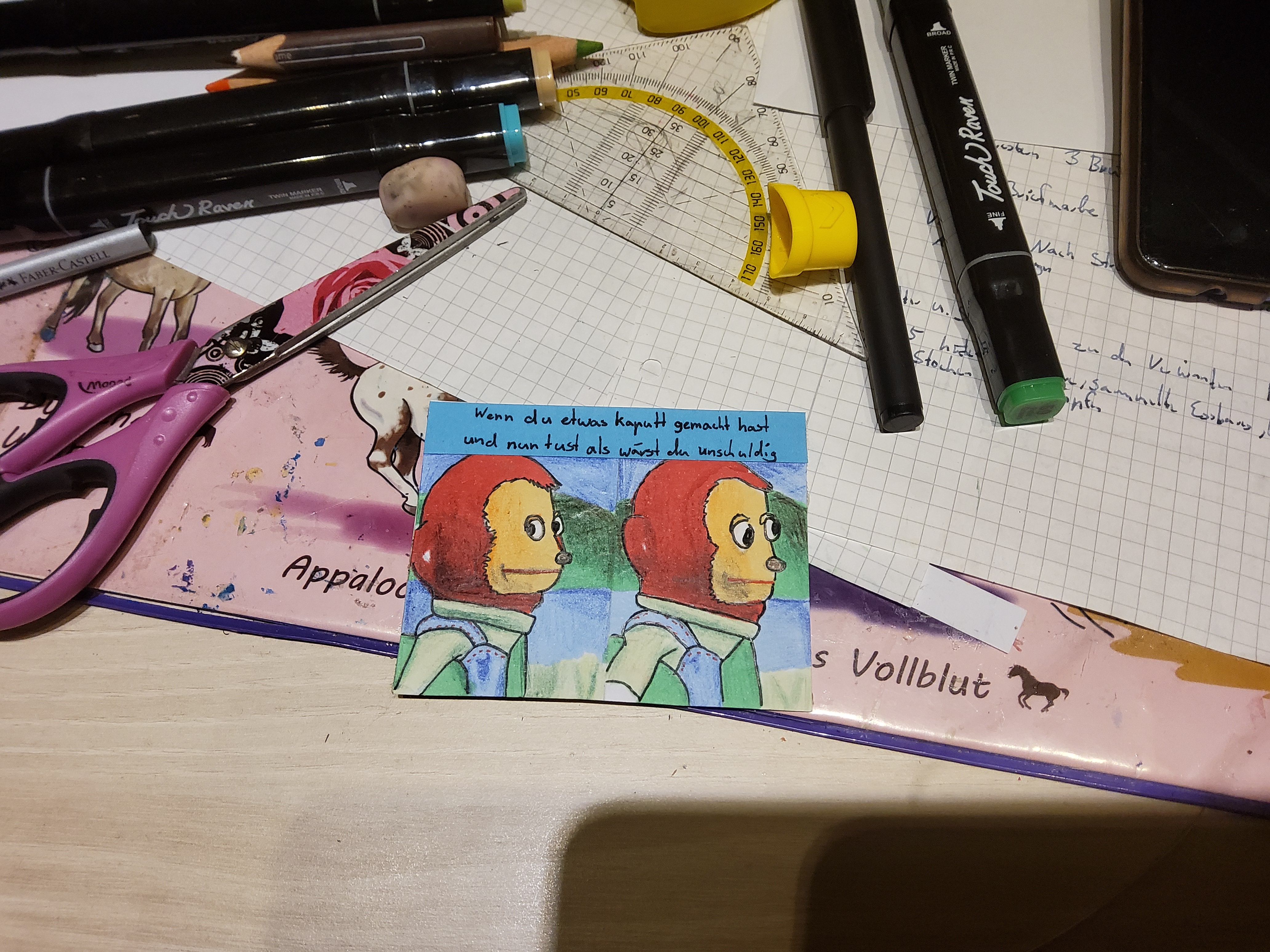 Aber ich denke, im Rahmen dieser STA haben wir ein gesundes MittelmaĂ gefunden⊠zumal Memes âin echtâ ja hĂ€ufiger durch Ăberschriebenes, Schriftartwechsel und generelles Chaos auffallen.