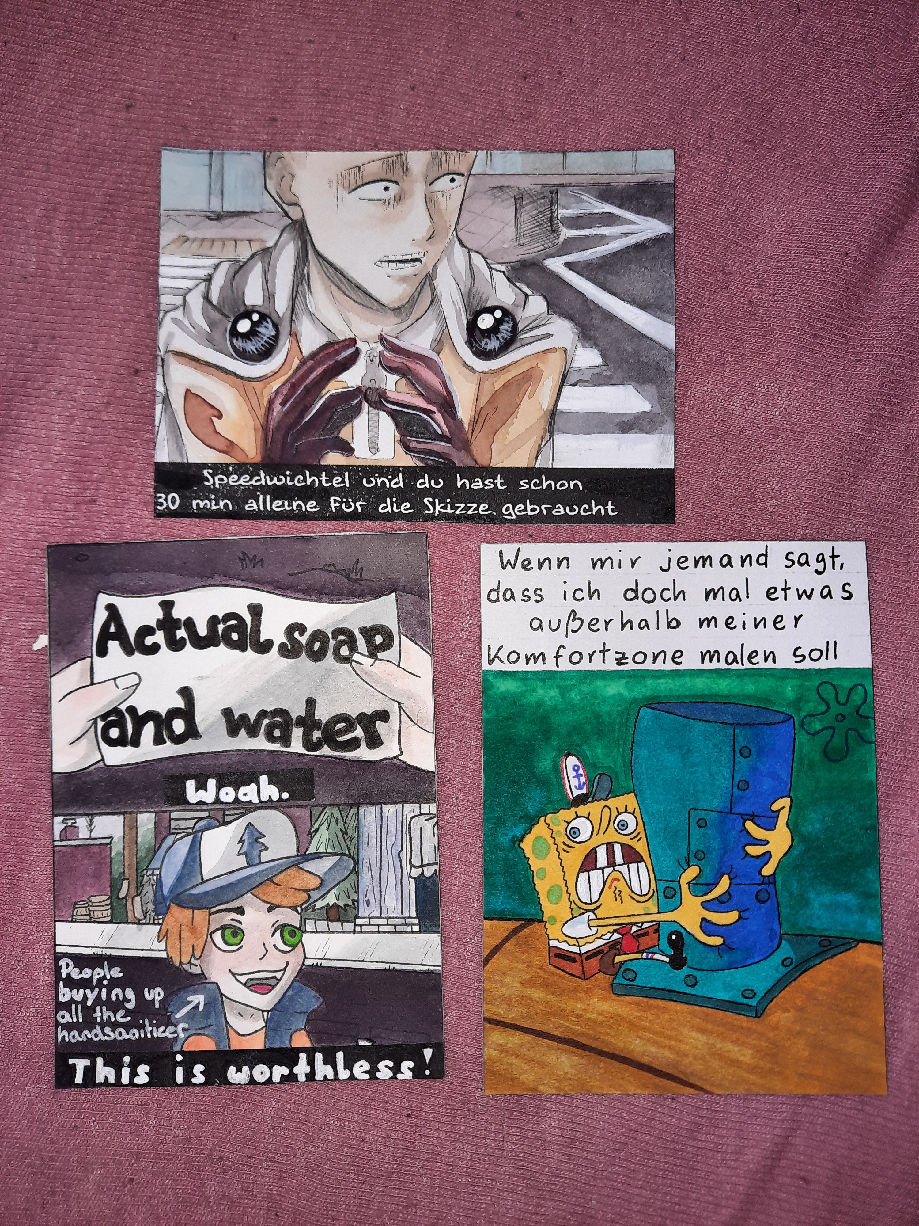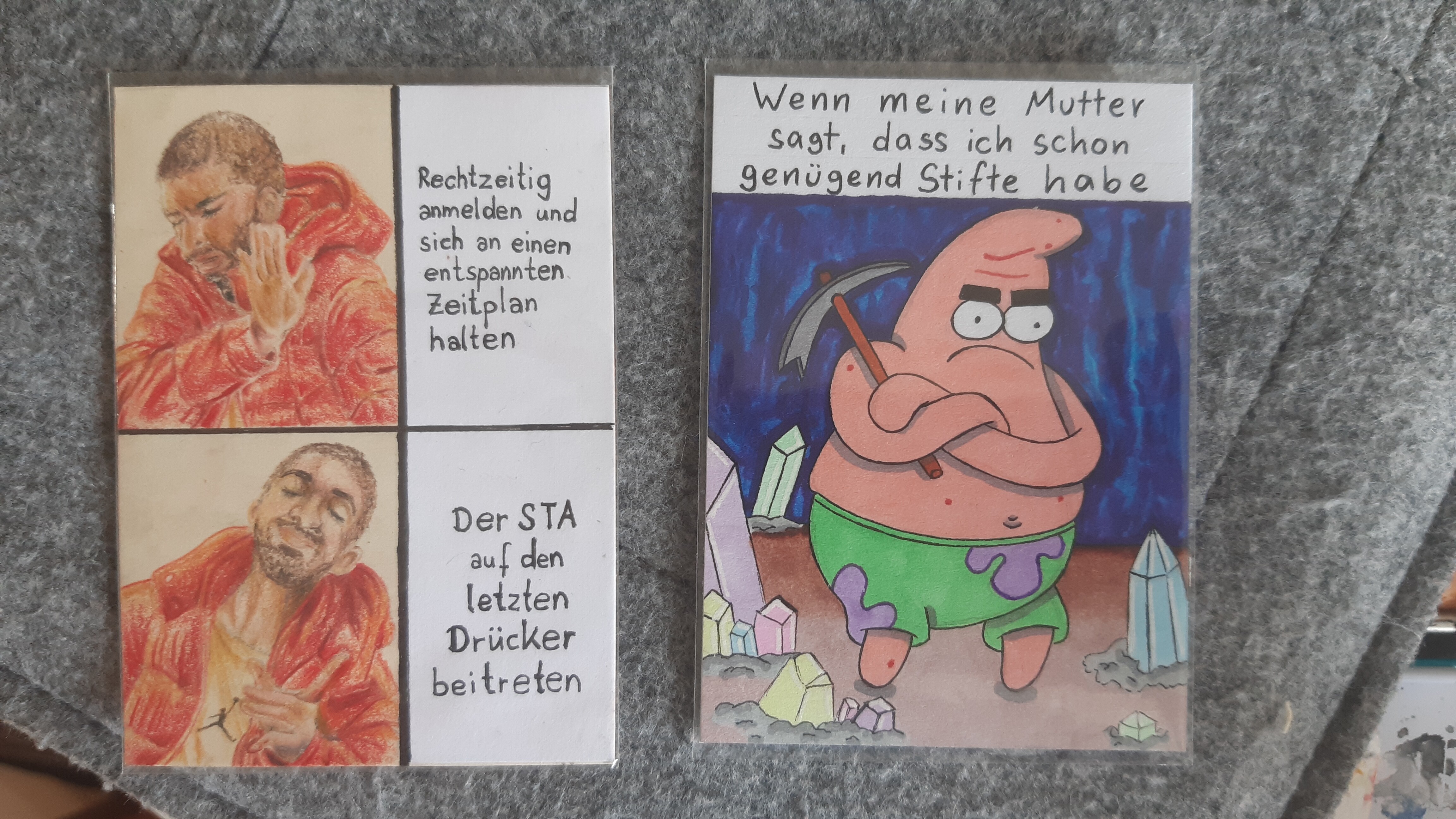 Beide Karten gehören zu meinen Favos und ich bin sehr zufrieden^^ Insbesondere da ich auch ein “Auf den letzten Drücker” Meme bekommen habe, was ja sehr gut passt xD