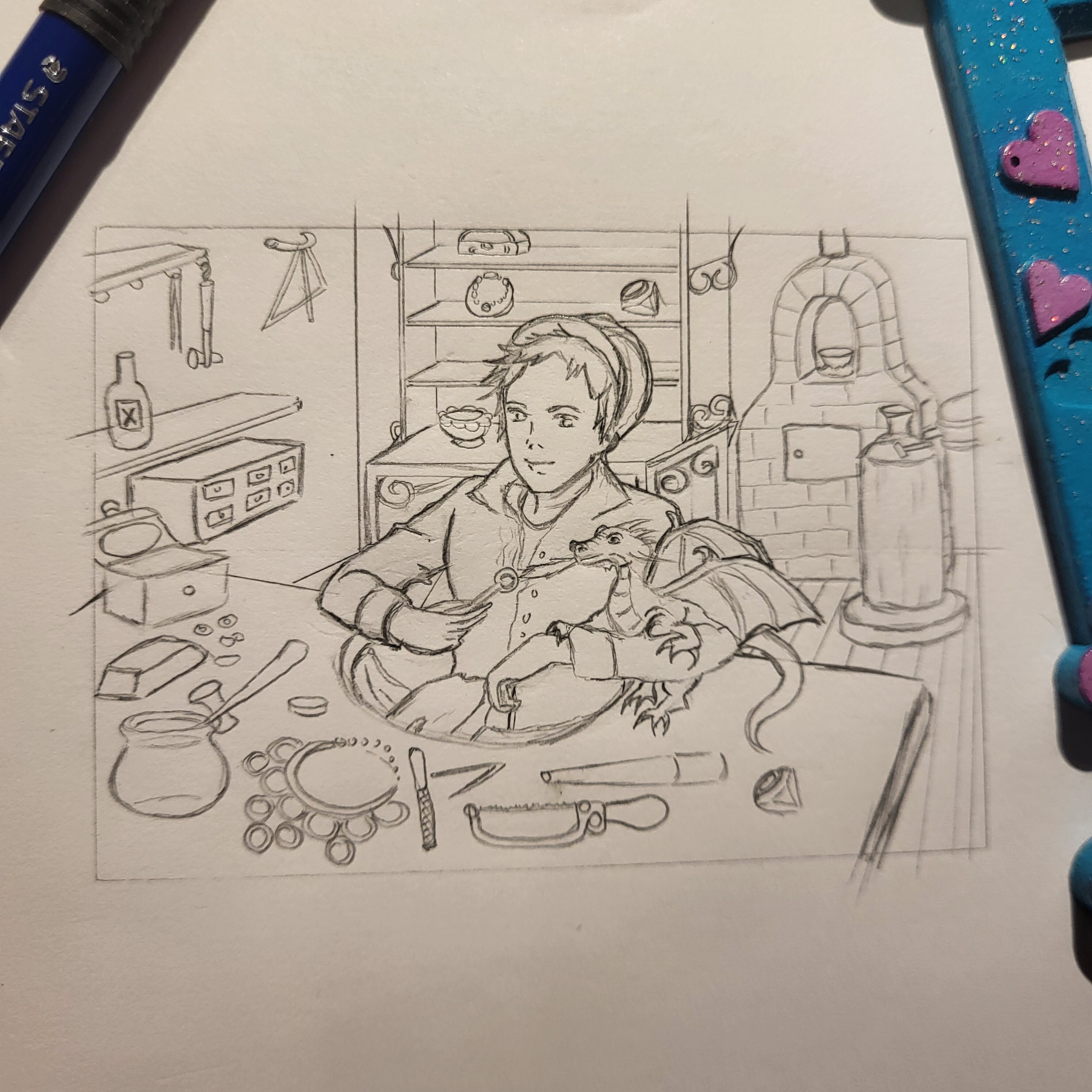 Von mir kommt ebenfalls eine fertige Skizze. Da ich Goldschmied gelernt habe dachte ich mir, wie cool es wäre einen Minidrachen als Löthilfe zu haben. Spart Gas und dem Tierchen wird nicht langweilig