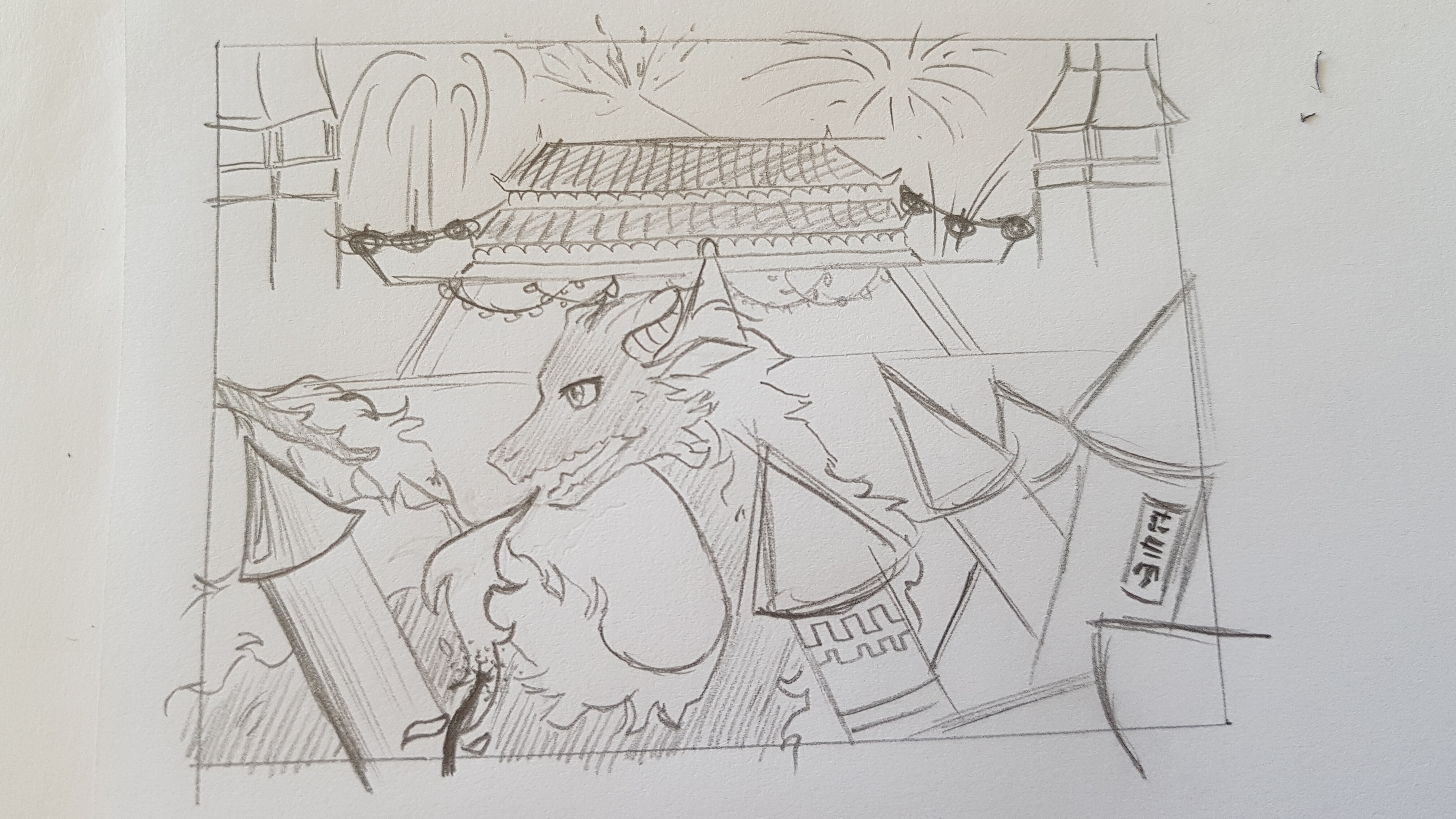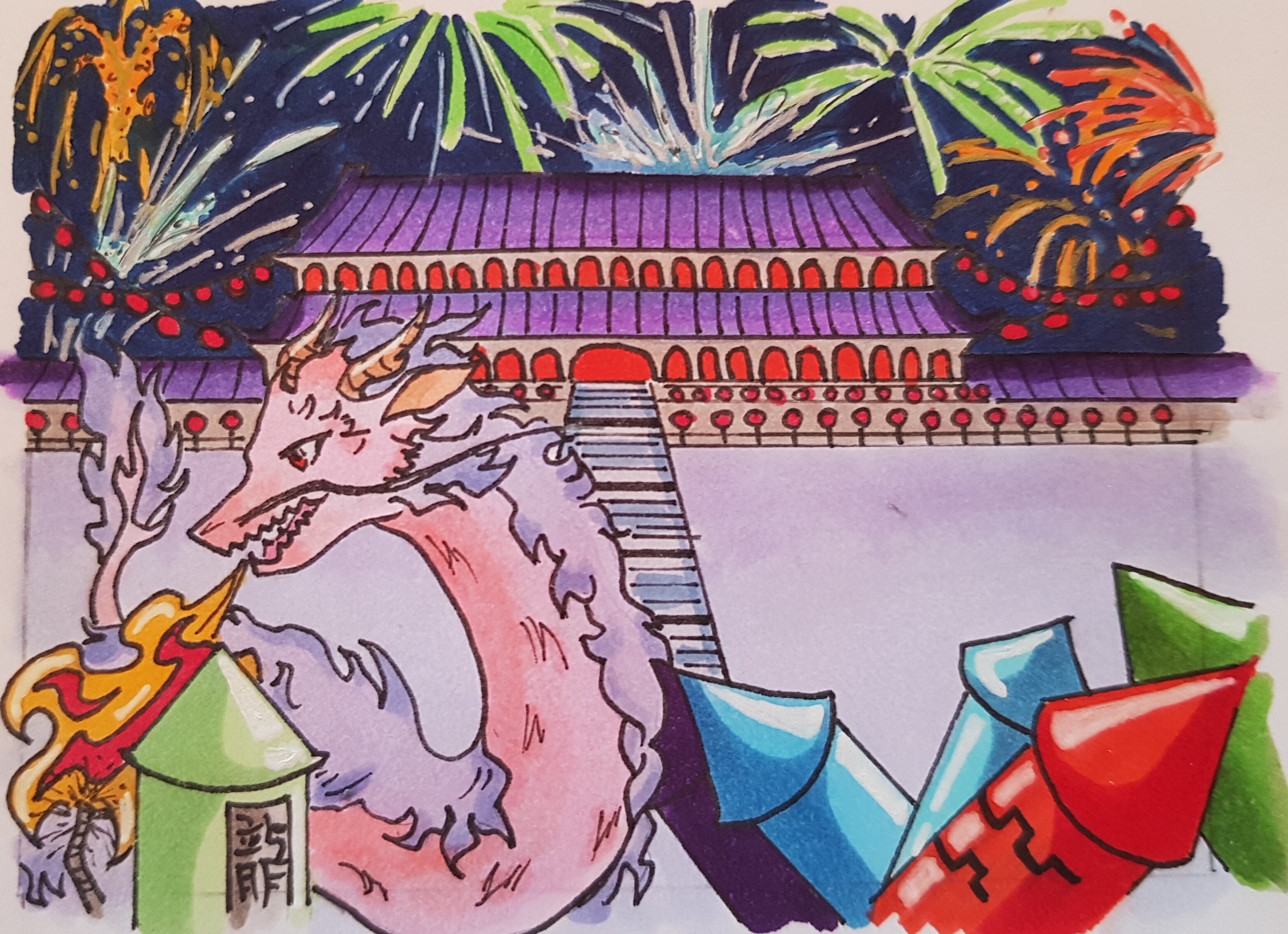 , aber ich hoffe es ist als Alltagssituation im alten China in Ordnung. Kleiner Drache macht Feuerwerk.